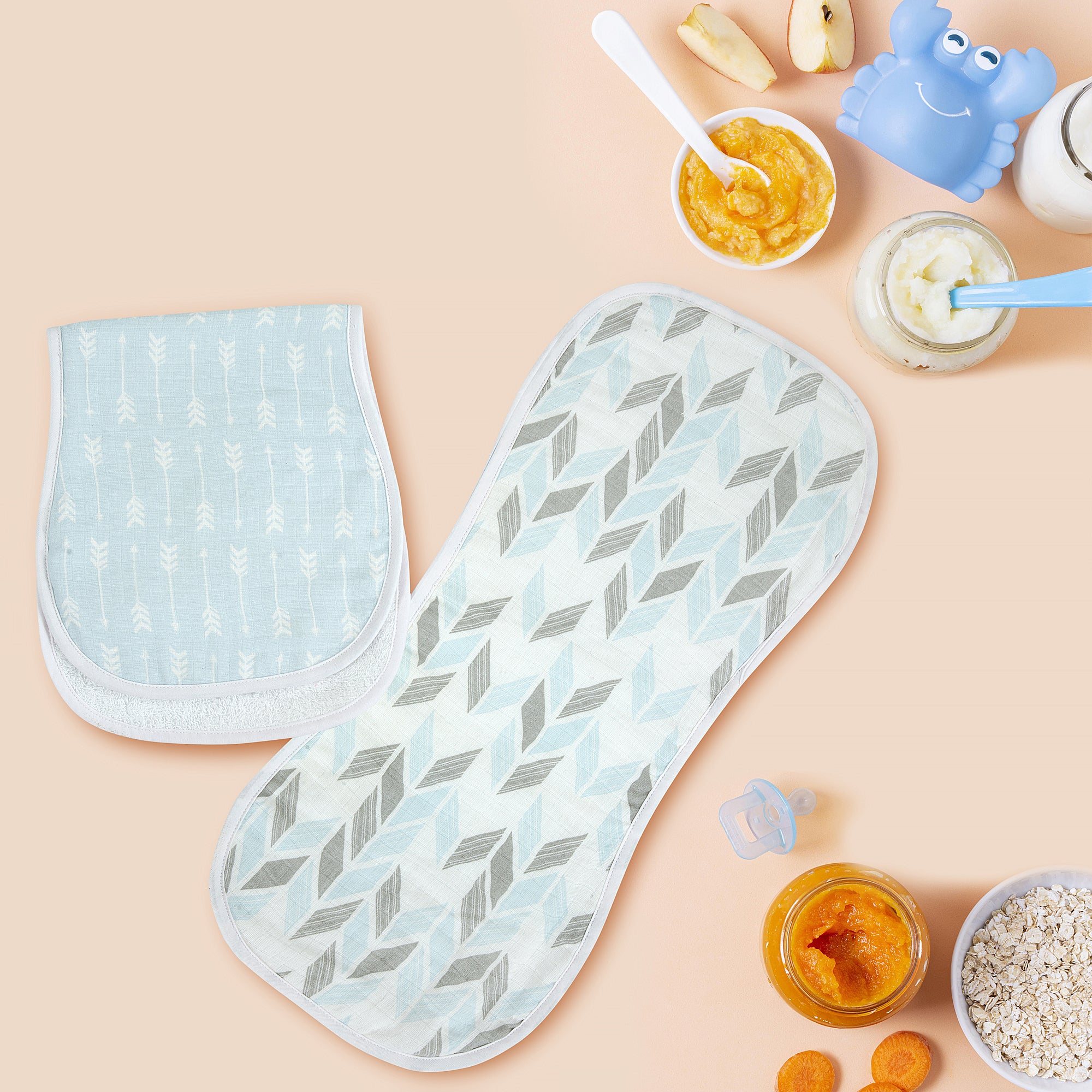 For the first time ever in Pakistan, we are launching our premium burp cloth set of two for mommies who are tired of using makeshift, unhygienic and almost unmanageable cloths to wipe food or burp their babies to sleep.