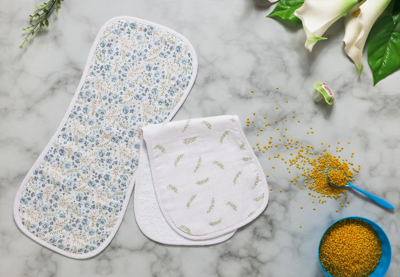 This is a full length burp cloth designed to sit on your shoulder and ensure that nothing spills on to your clothes or nursing covers. The size of a burp cloth is a generous 21 inches long and 7.5 inches wide. One side is pure, soft and airy muslin fabric and the other side is a towel.