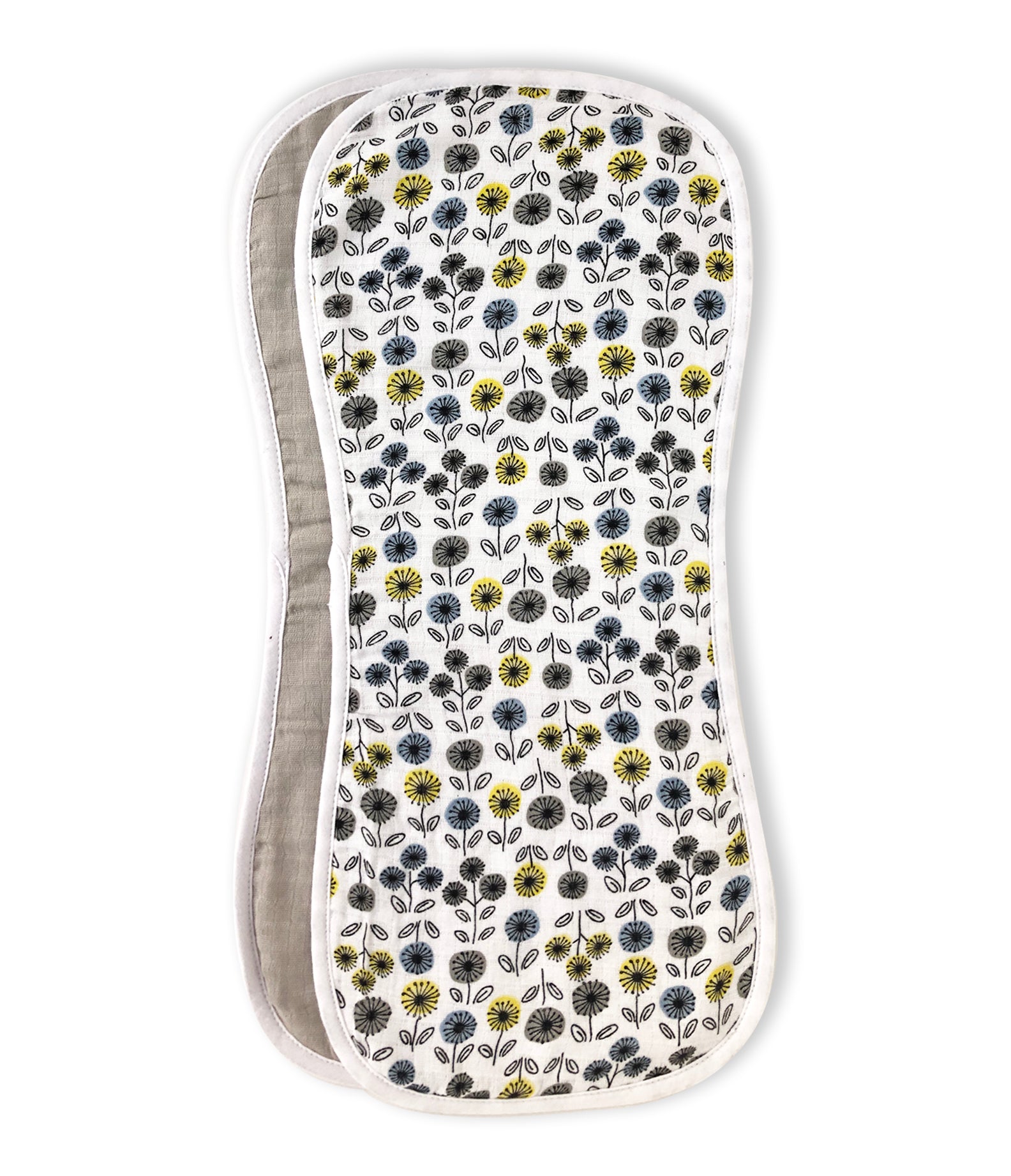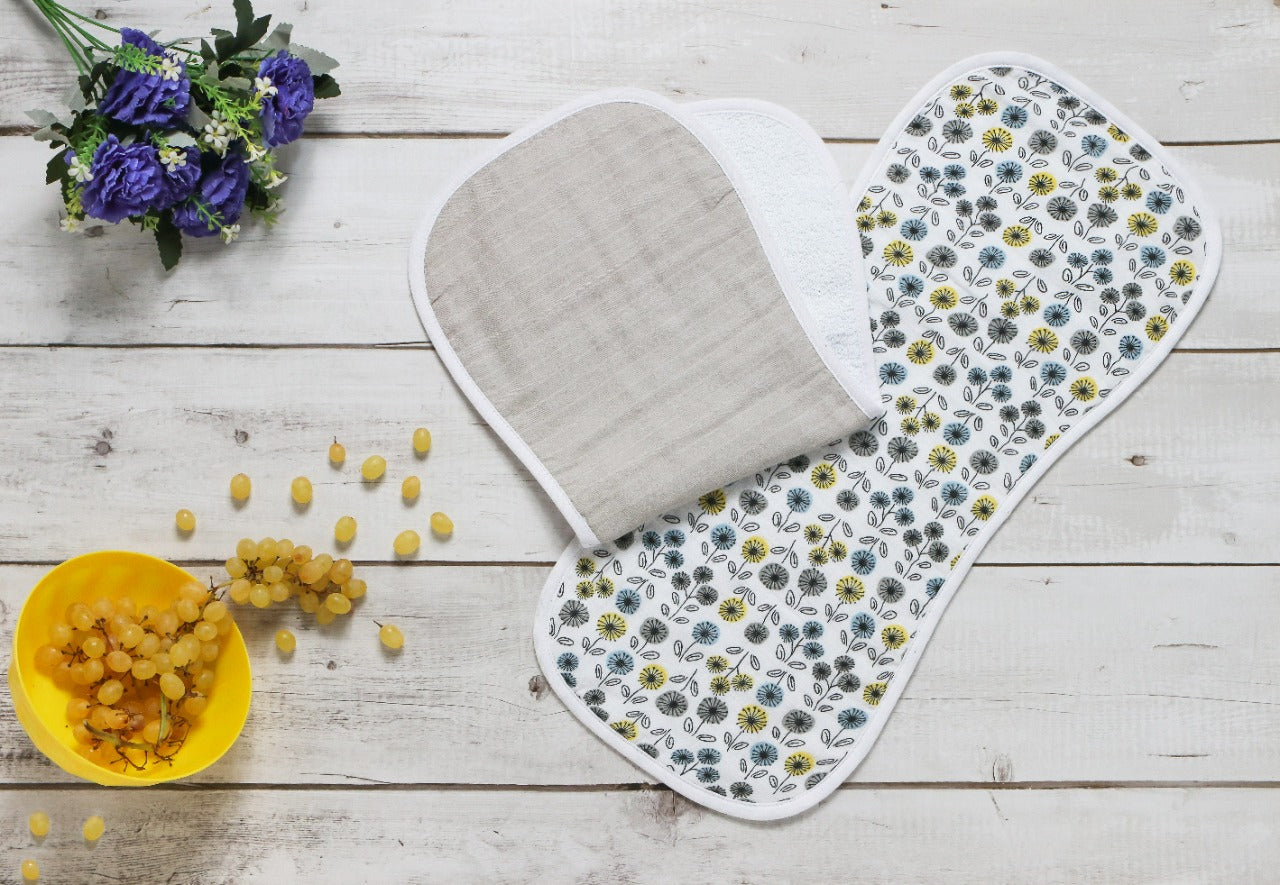 This is a full length burp cloth designed to sit on your shoulder and ensure that nothing spills on to your clothes or nursing covers. The size of a burp cloth is a generous 21 inches long and 7.5 inches wide. One side is pure, soft and airy muslin fabric and the other side is a towel.