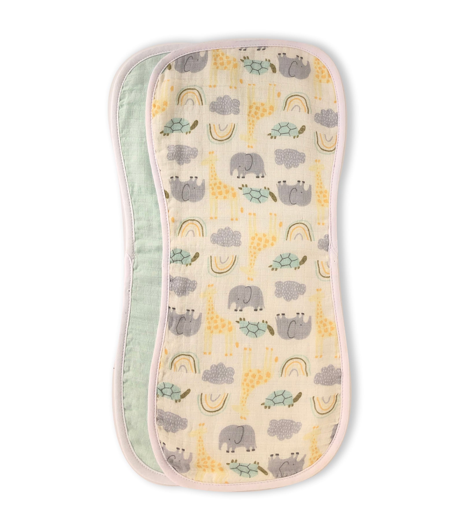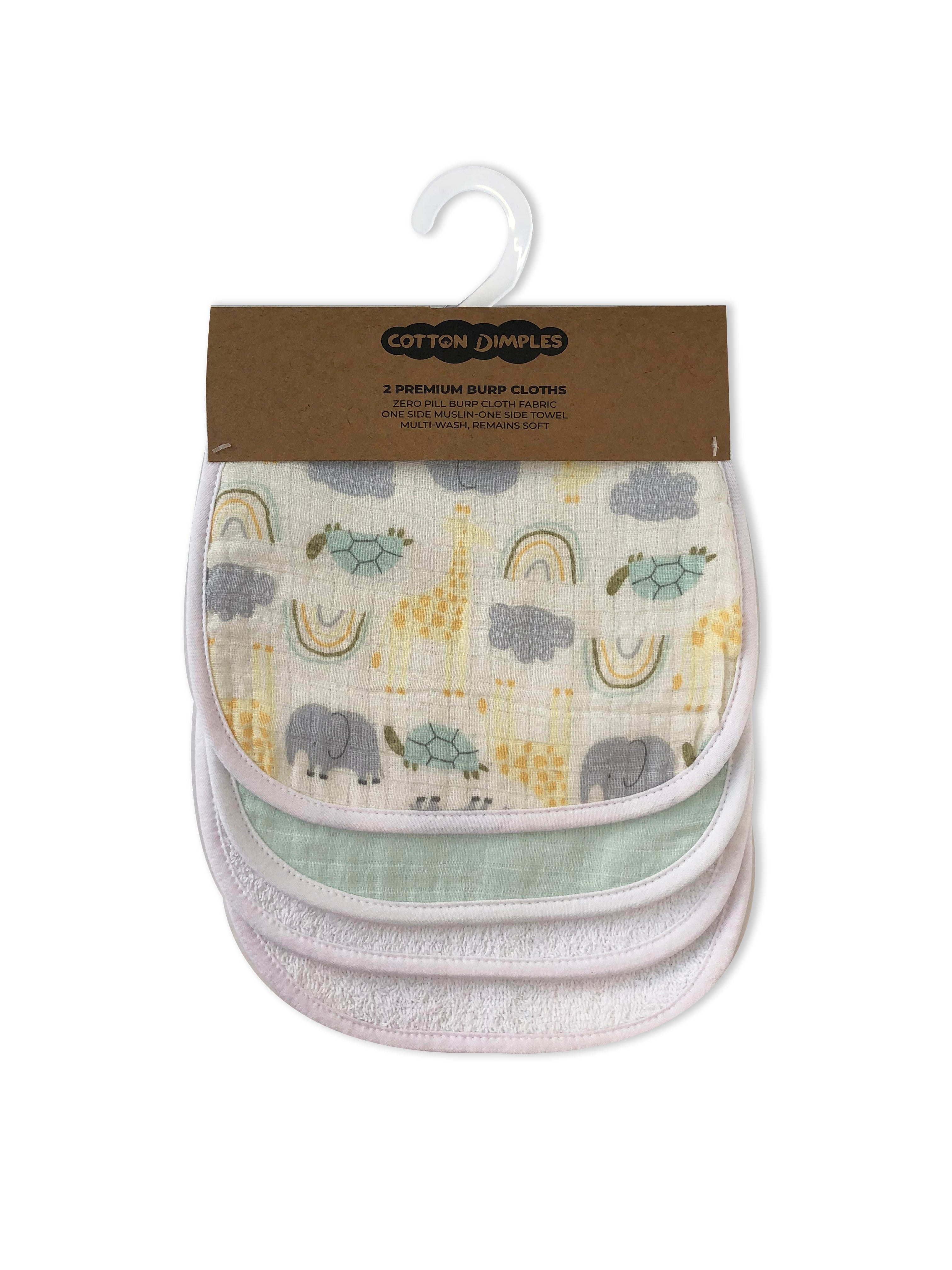 This is a full length burp cloth designed to sit on your shoulder and ensure that nothing spills on to your clothes or nursing covers. The size of a burp cloth is a generous 21 inches long and 7.5 inches wide. One side is pure, soft and airy muslin fabric and the other side is a towel.
