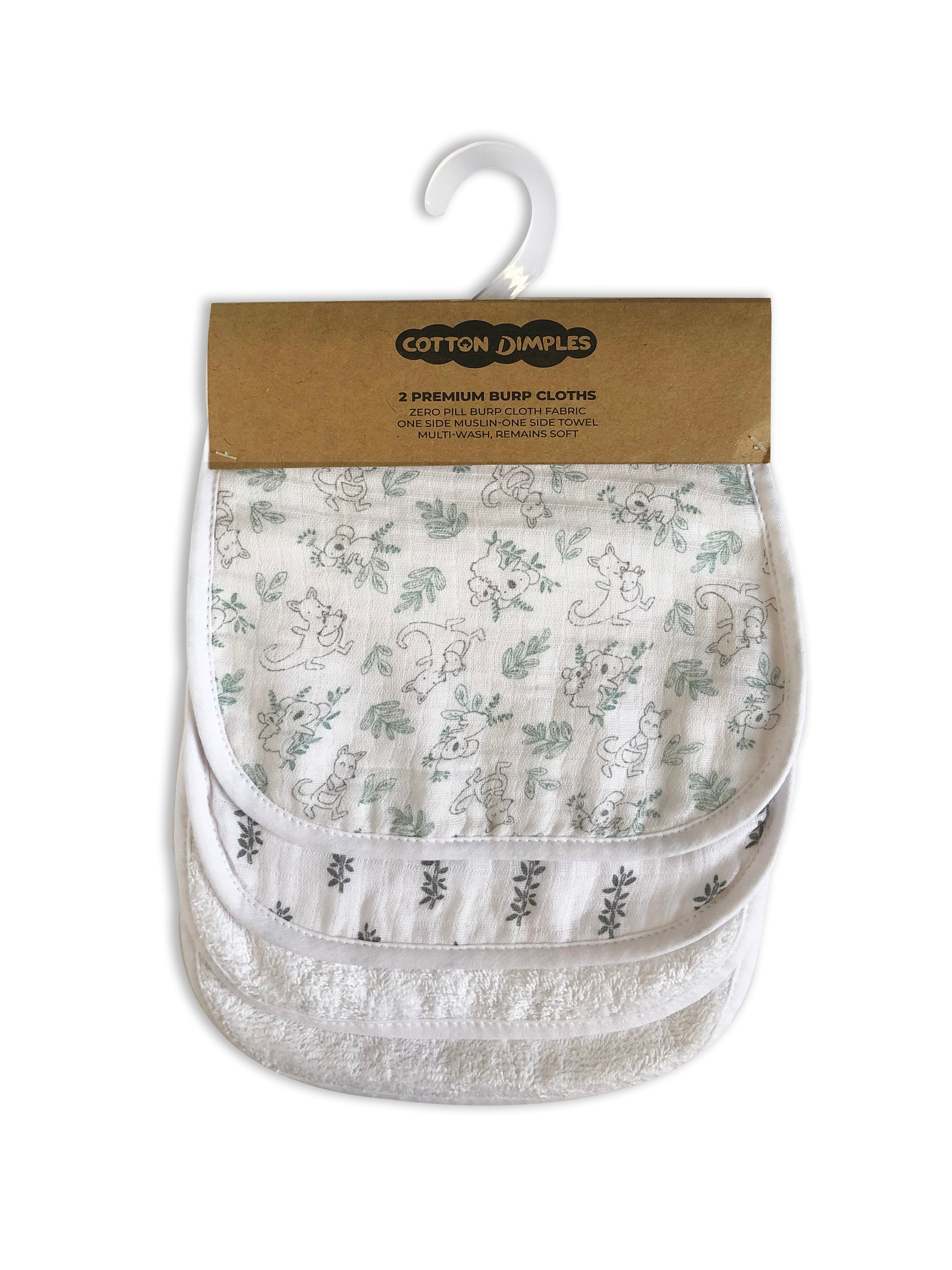 This is a full length burp cloth designed to sit on your shoulder and ensure that nothing spills on to your clothes or nursing covers. The size of a burp cloth is a generous 21 inches long and 7.5 inches wide. One side is pure, soft and airy muslin fabric and the other side is a towel.