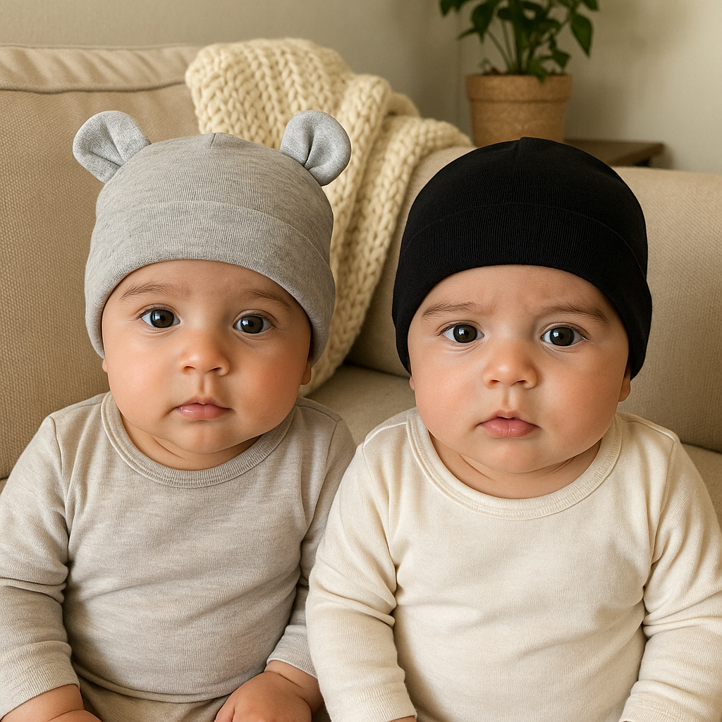 Set of Two Jersey Caps for babies especially made to suit the muslin swaddle blankets and muslin wraps we have in our store.