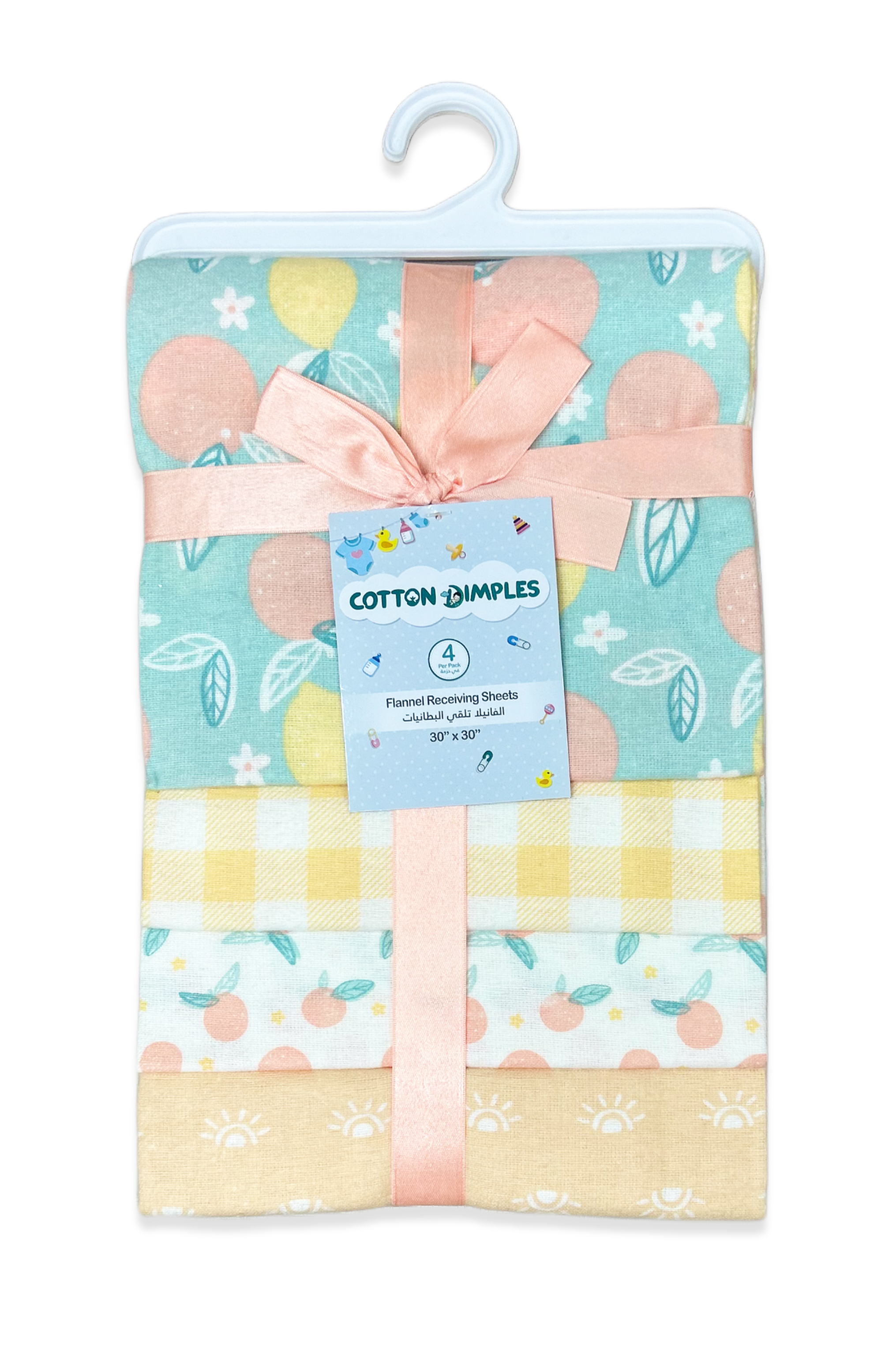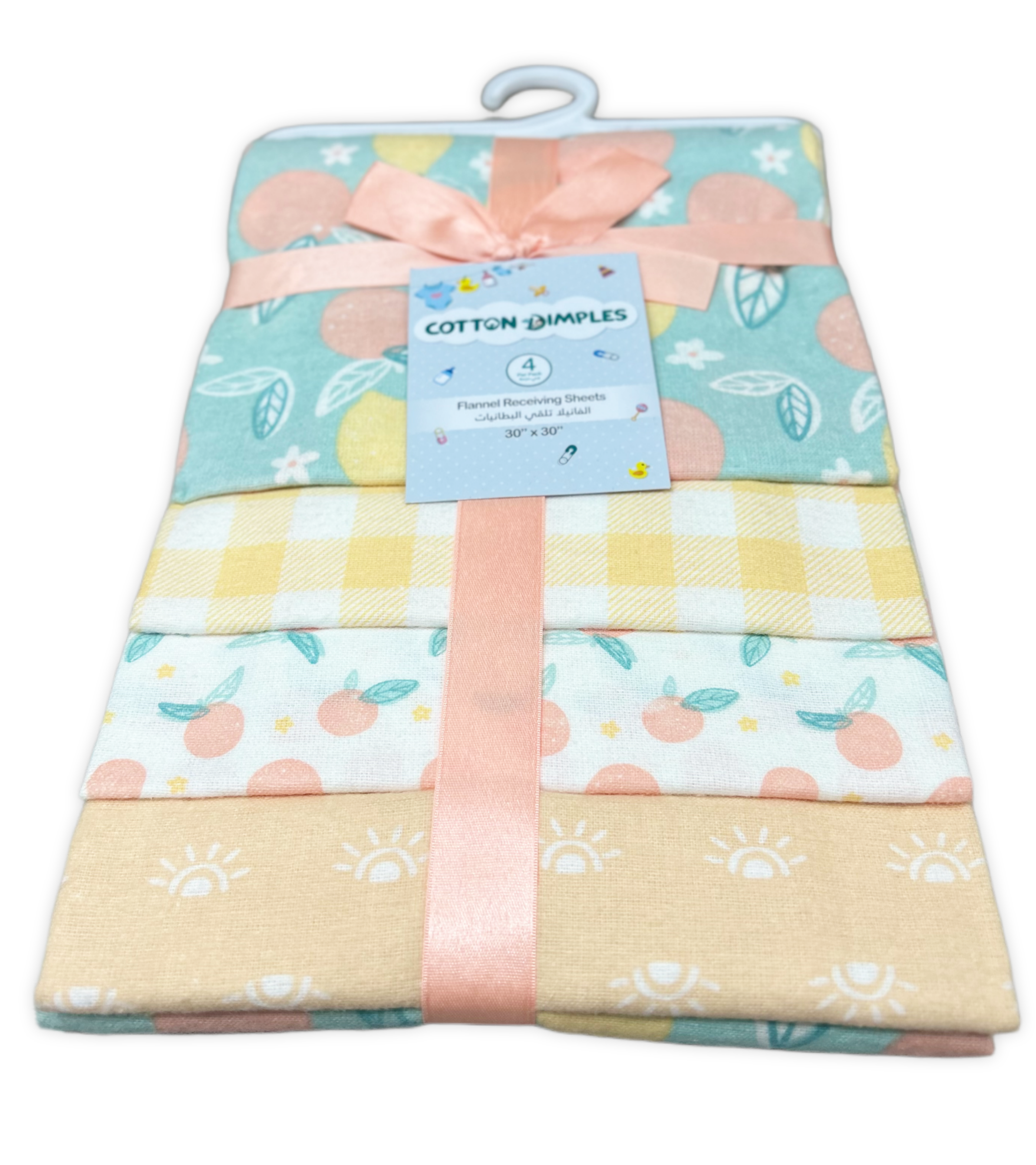Cotton Dimples cotton flannel receiving sheets are versatile baby blankets with a variety of uses. Great as a blanket, nursing cover, burp cloth, car seat cover, tummy time, changing pad cover and more. Our receiving blankets are made with 100% cotton flannel for the softest touch on your baby's skin.