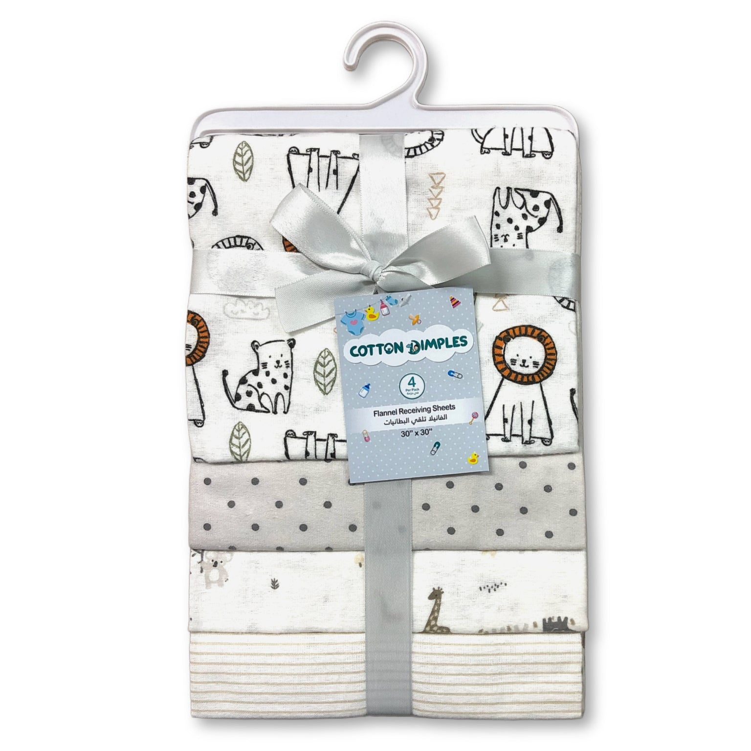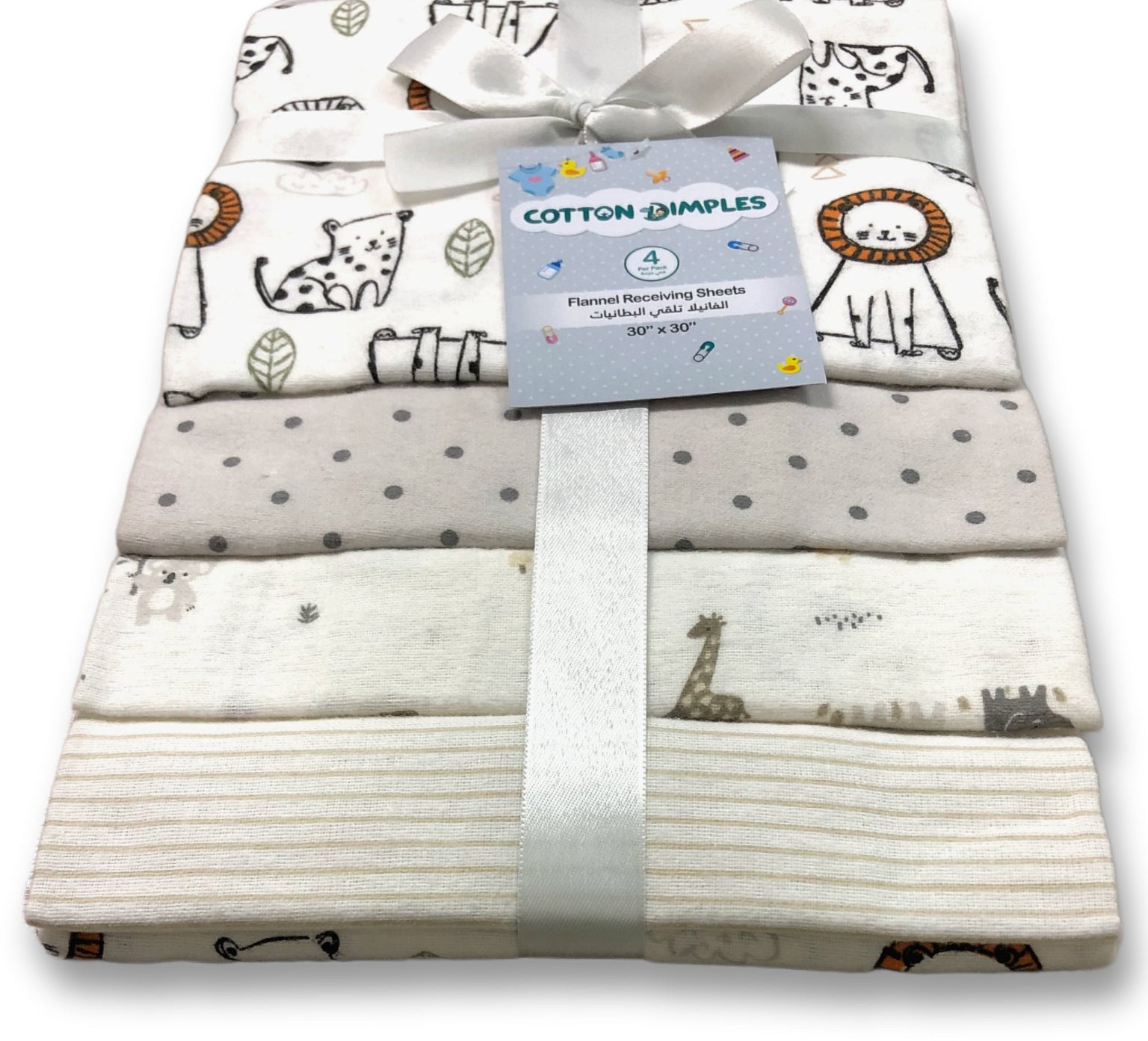 Cotton Dimples cotton flannel receiving sheets are versatile baby blankets with a variety of uses. Great as a blanket, nursing cover, burp cloth, car seat cover, tummy time, changing pad cover and more. Our receiving blankets are made with 100% cotton flannel for the softest touch on your baby's skin.