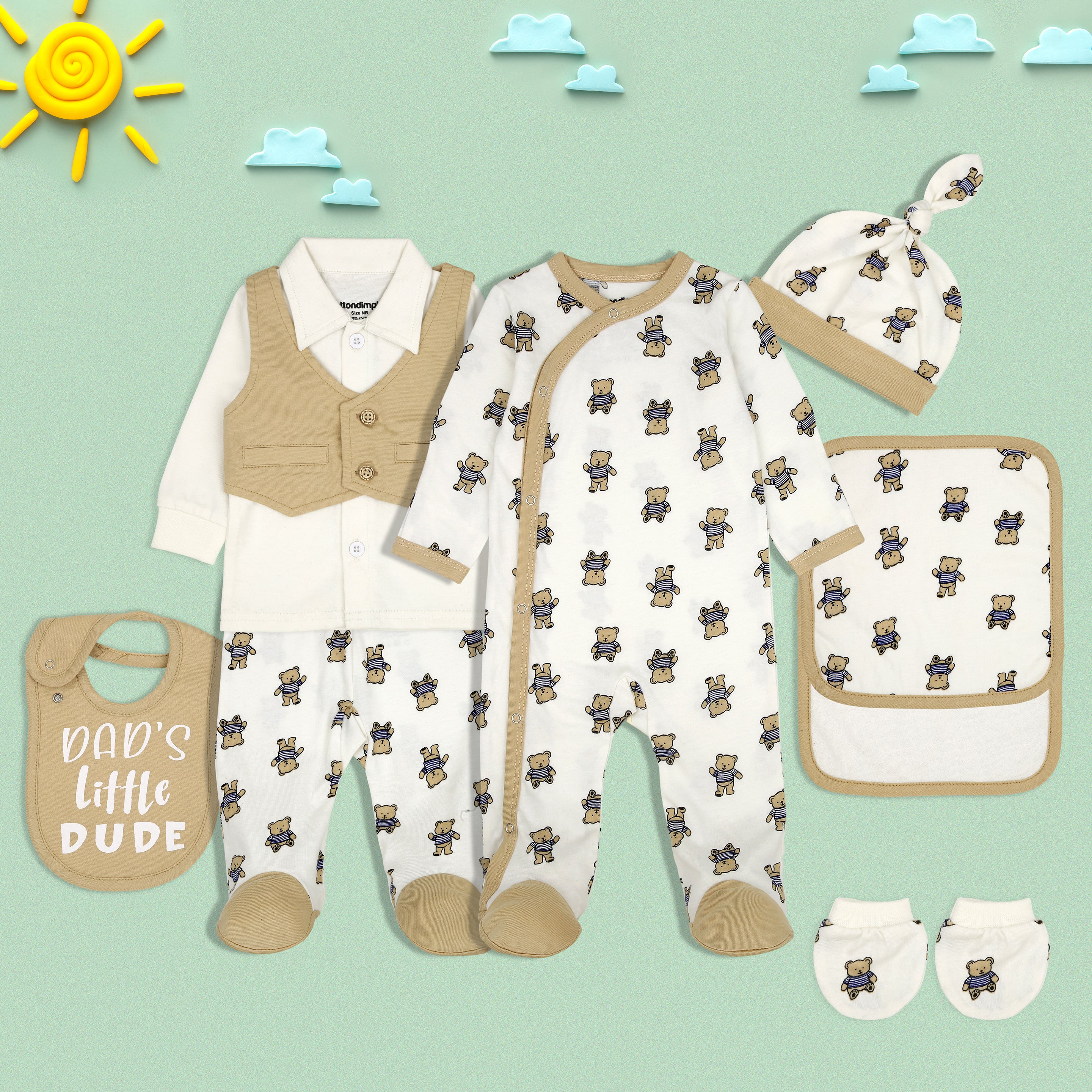 • Set includes, 1 footed romper, 1 full sleeved shirt, 1 Vest, 1 Footed bottom, 1 cap, 1 bib, 1 pair of mittens, 2 face/wash cloth