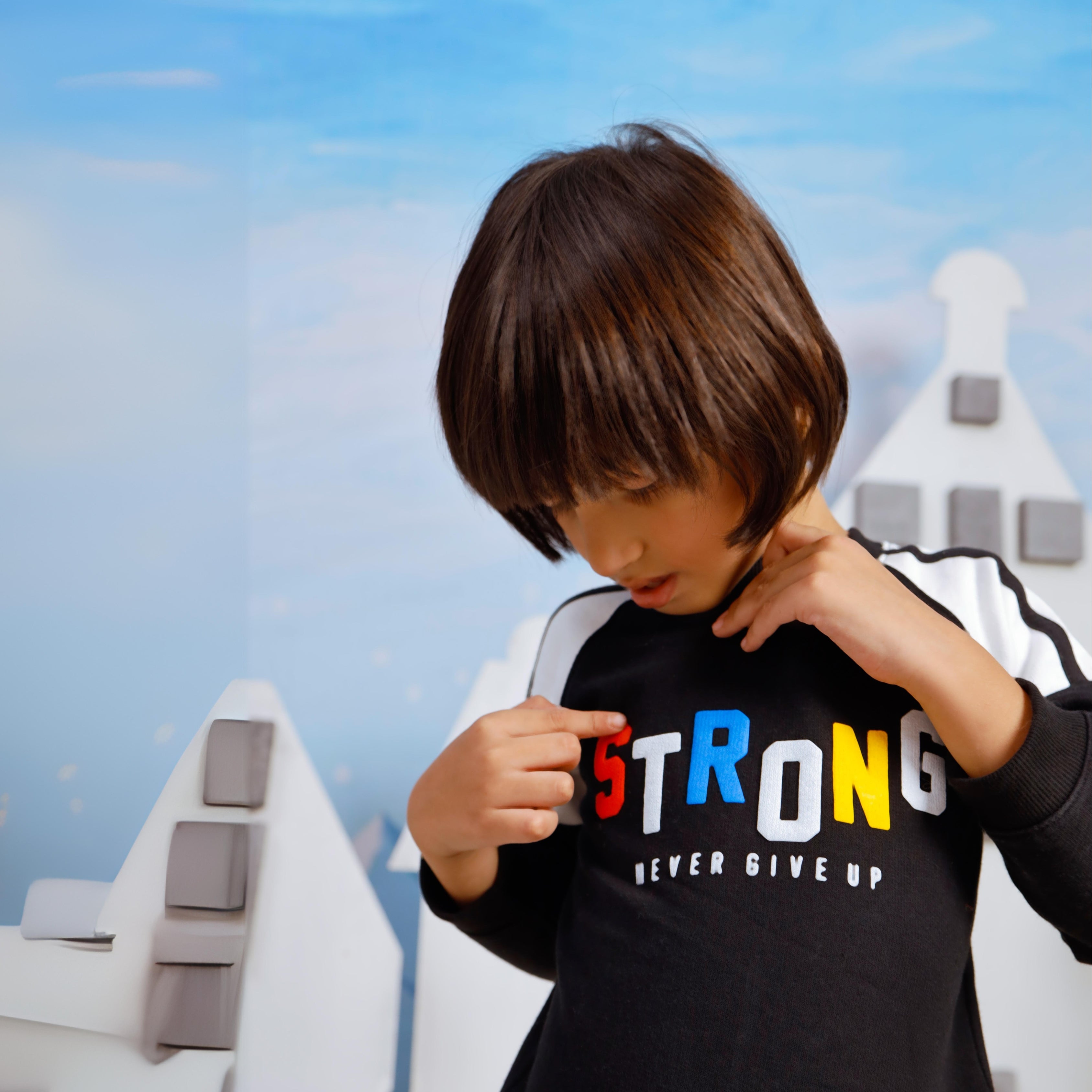 - Inspirational Chest Print: Featuring a motivational print that reads “Strong - Never Give Up,” this sweatshirt encourages resilience and positivity in your toddler.