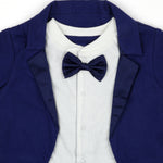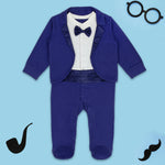 Dress your little gentleman in this elegant tuxedo-style footed romper—perfect for weddings, birthdays, and all special occasions. Designed to look like a complete outfit, it features a soft jersey base styled with a tailored jacket panel, pleated waistband detail, and a classic satin bow tie sewn securely at the neckline. The inner snap button opening ensures easy diaper changes, while the full-length design with covered feet keeps your baby warm and comfortable.
