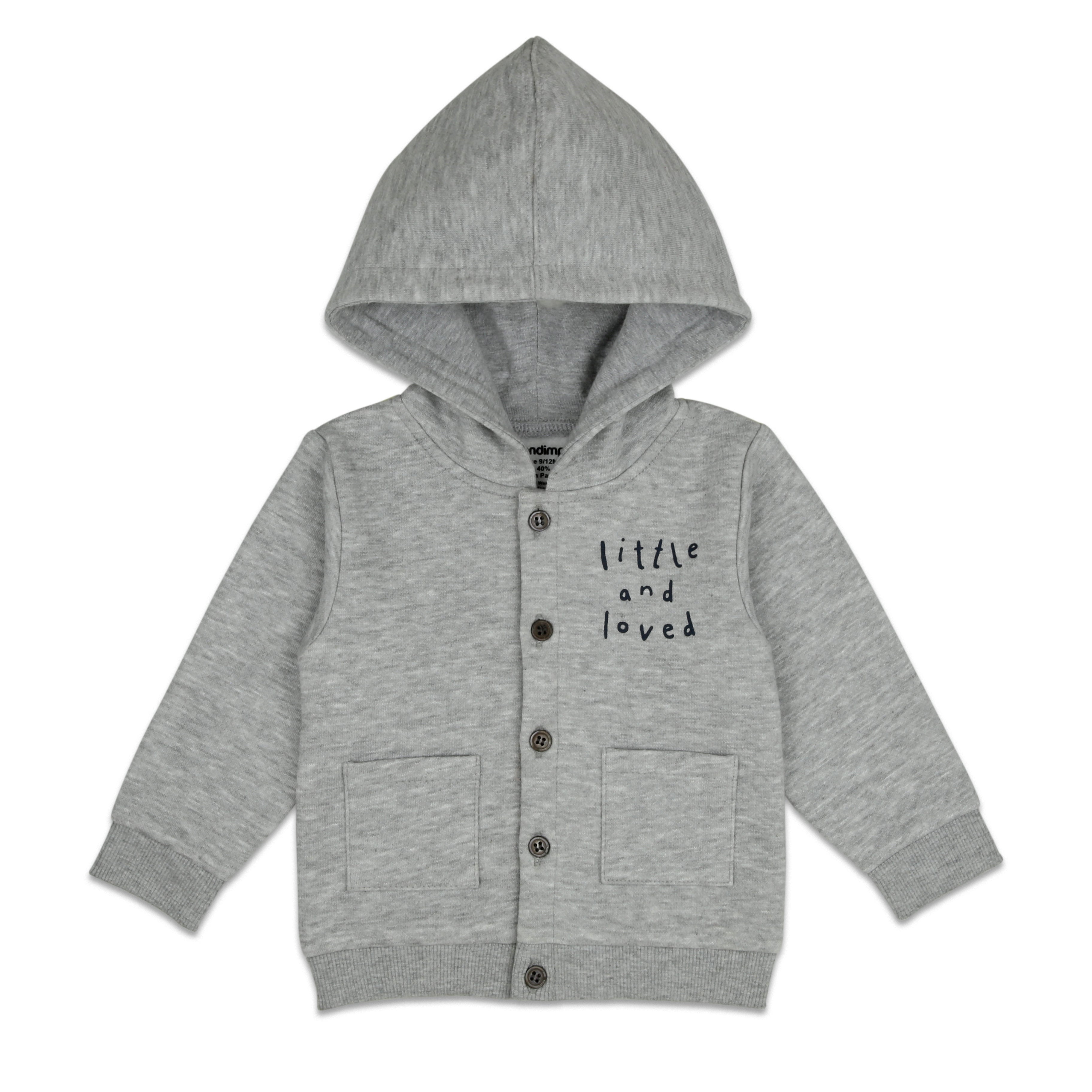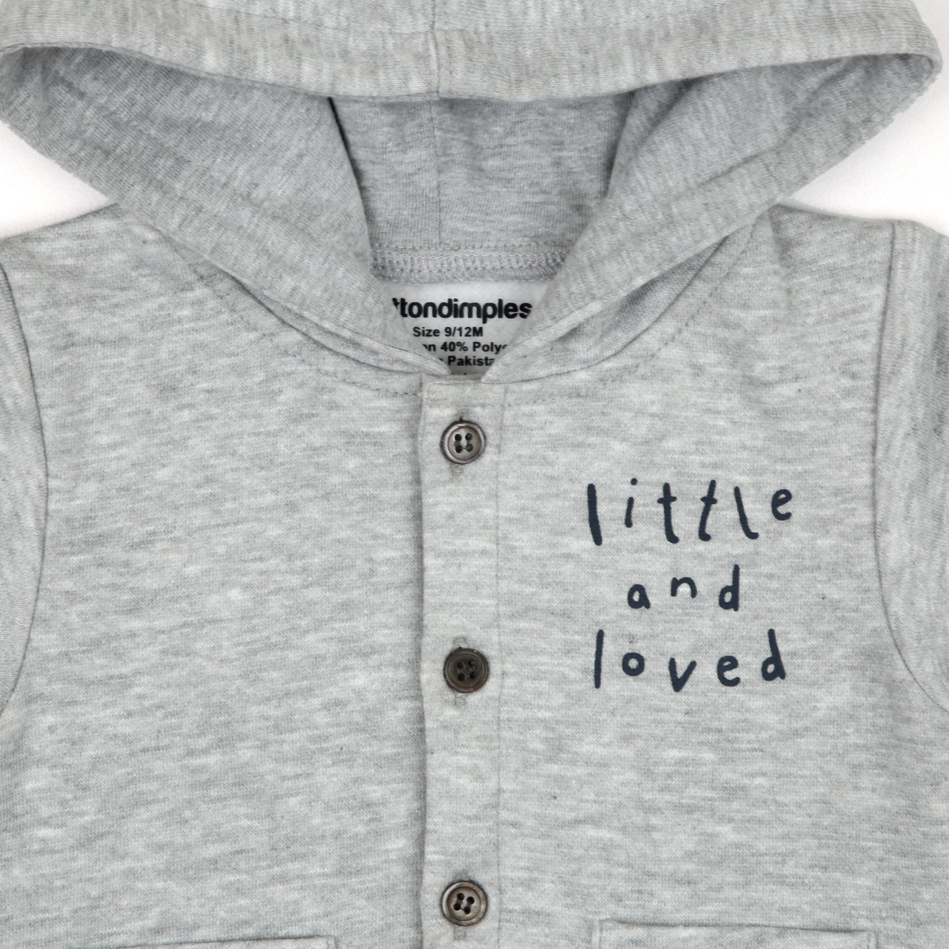 Fleece Hoodie – Featuring cozy full sleeves, soft inner fleece lining, functional front pockets, and an adorable “little and loved” embroidery on the chest. The button-down style makes dressing easy and snug.