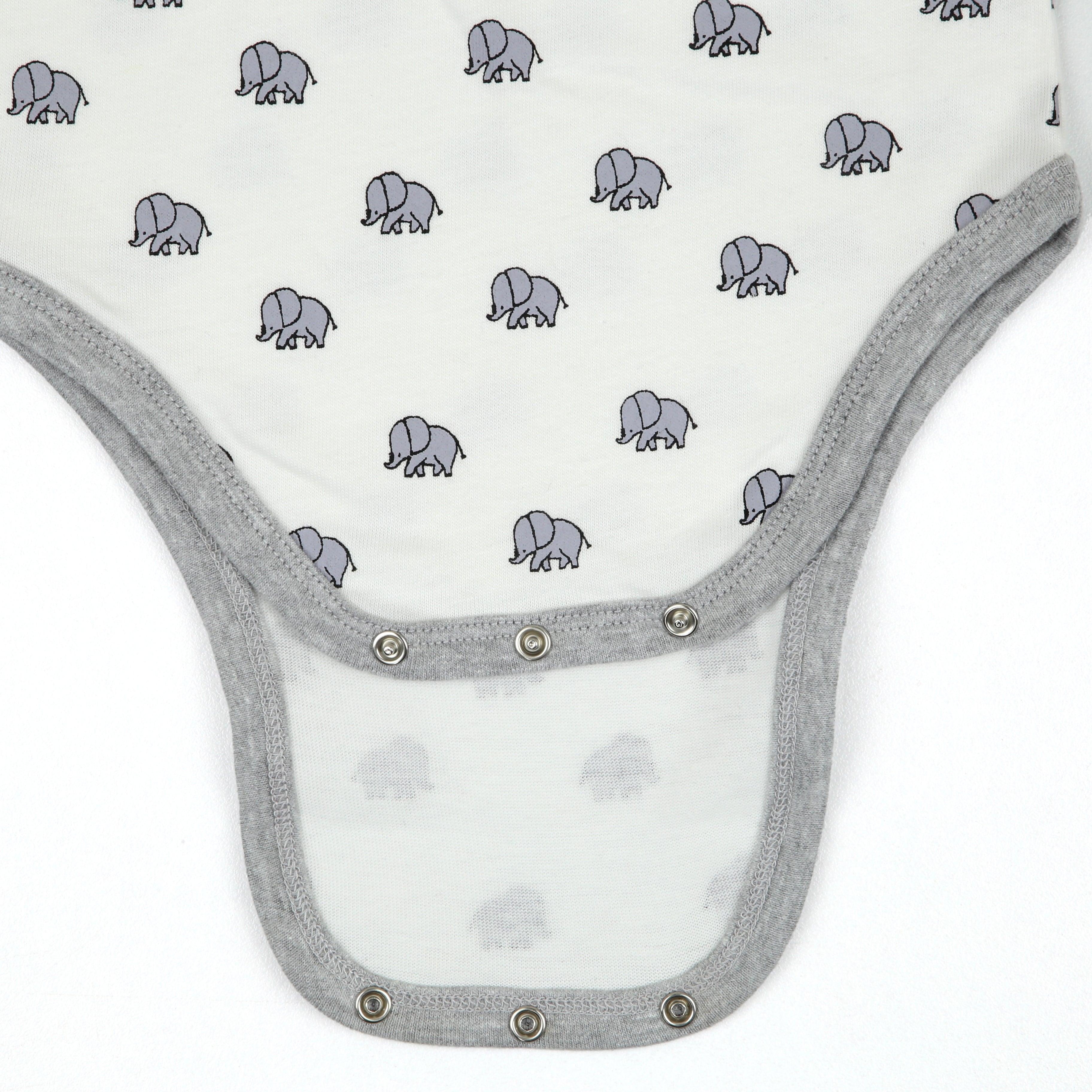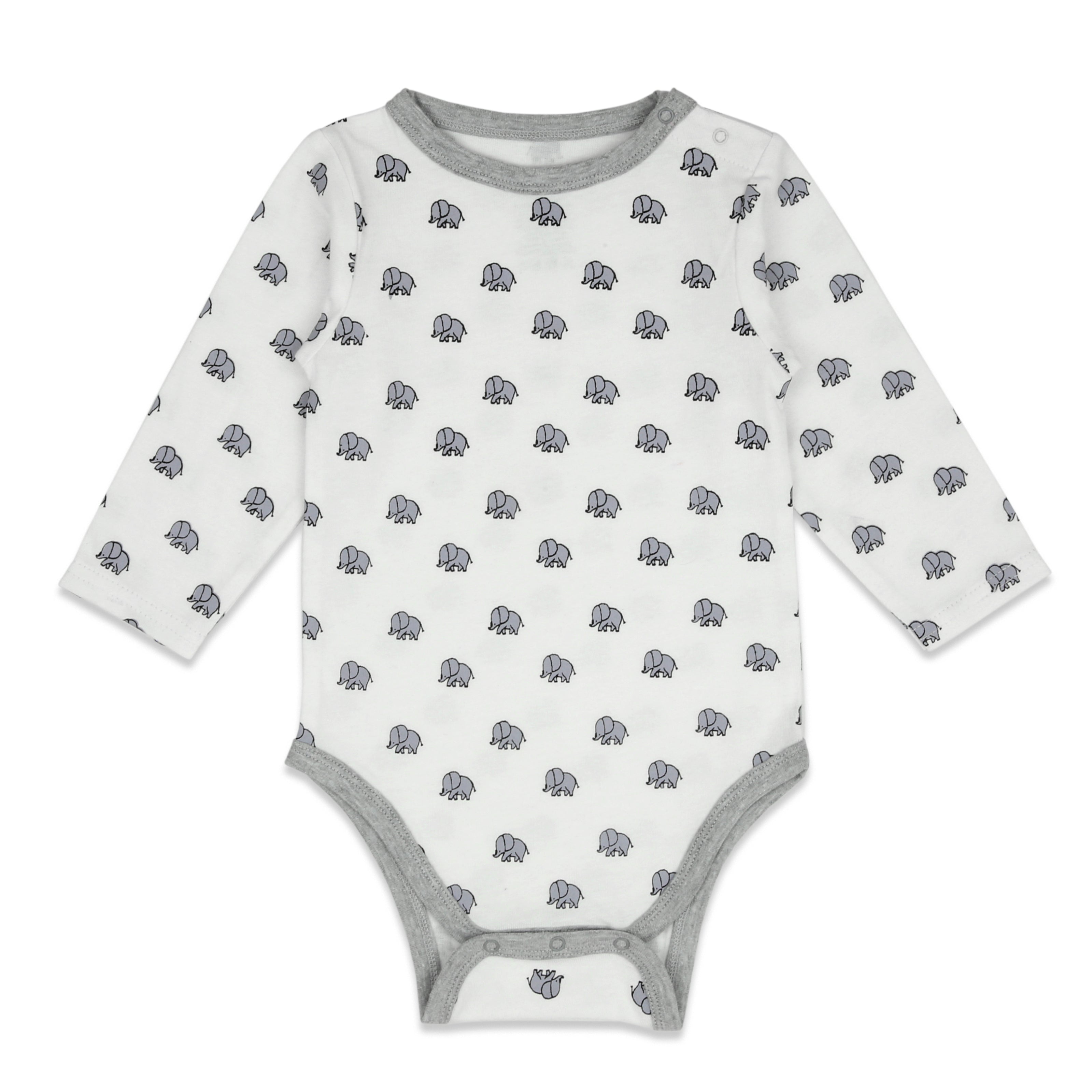 Printed Jersey Bodysuit – Made from breathable, baby-soft jersey cotton with a playful mini-elephant print. Features a convenient envelope neckline and snap button closure for quick changes.