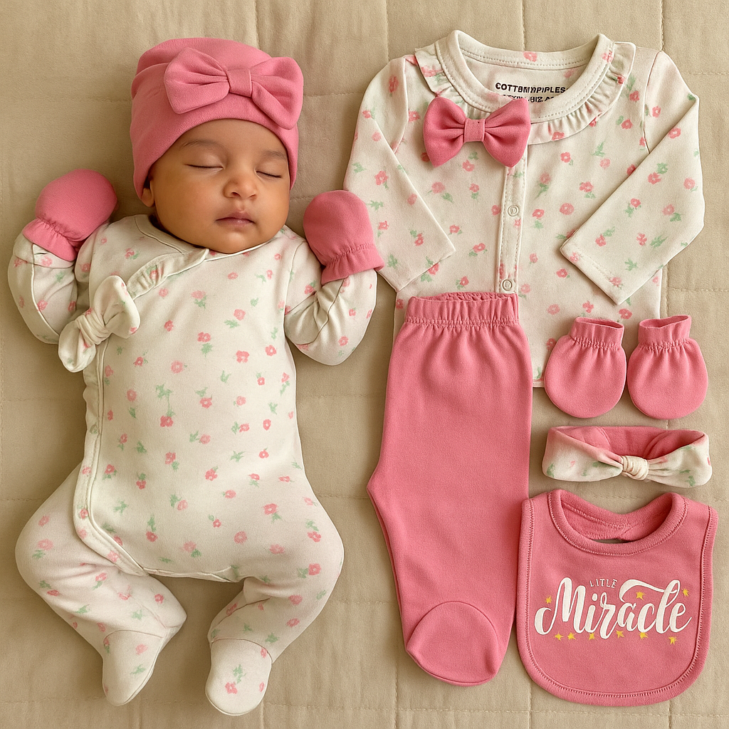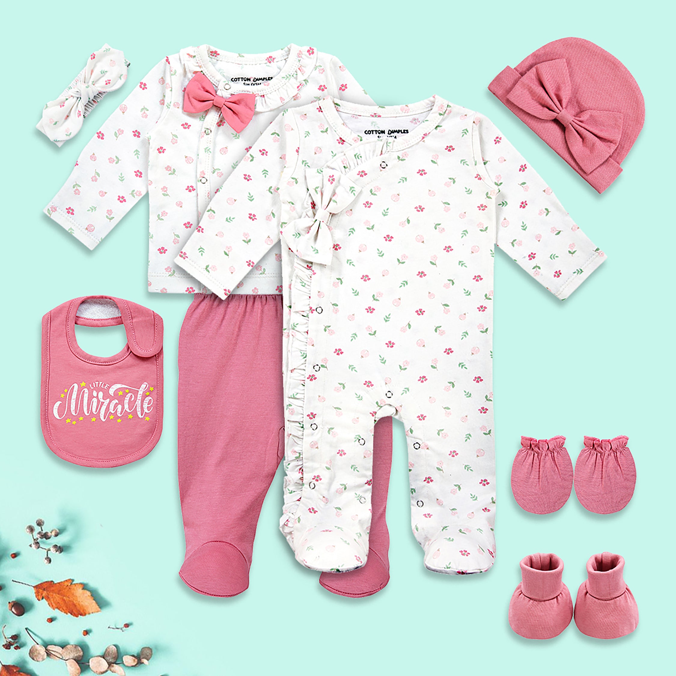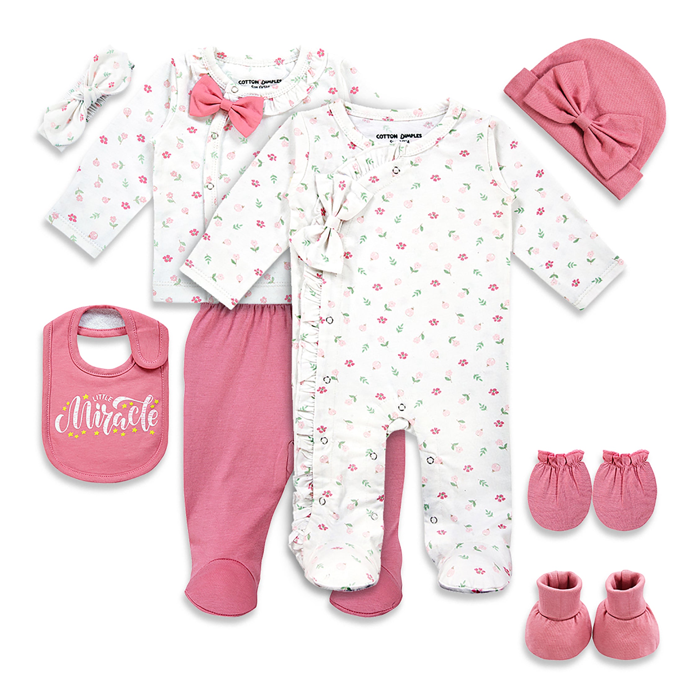 - Set includes, 1 footed romper, 1 side snap top, 1 footed bottom, 1 cap, 1 bib, 1 headband, 1 pair of mittens and 1 pair of bootiesĀ