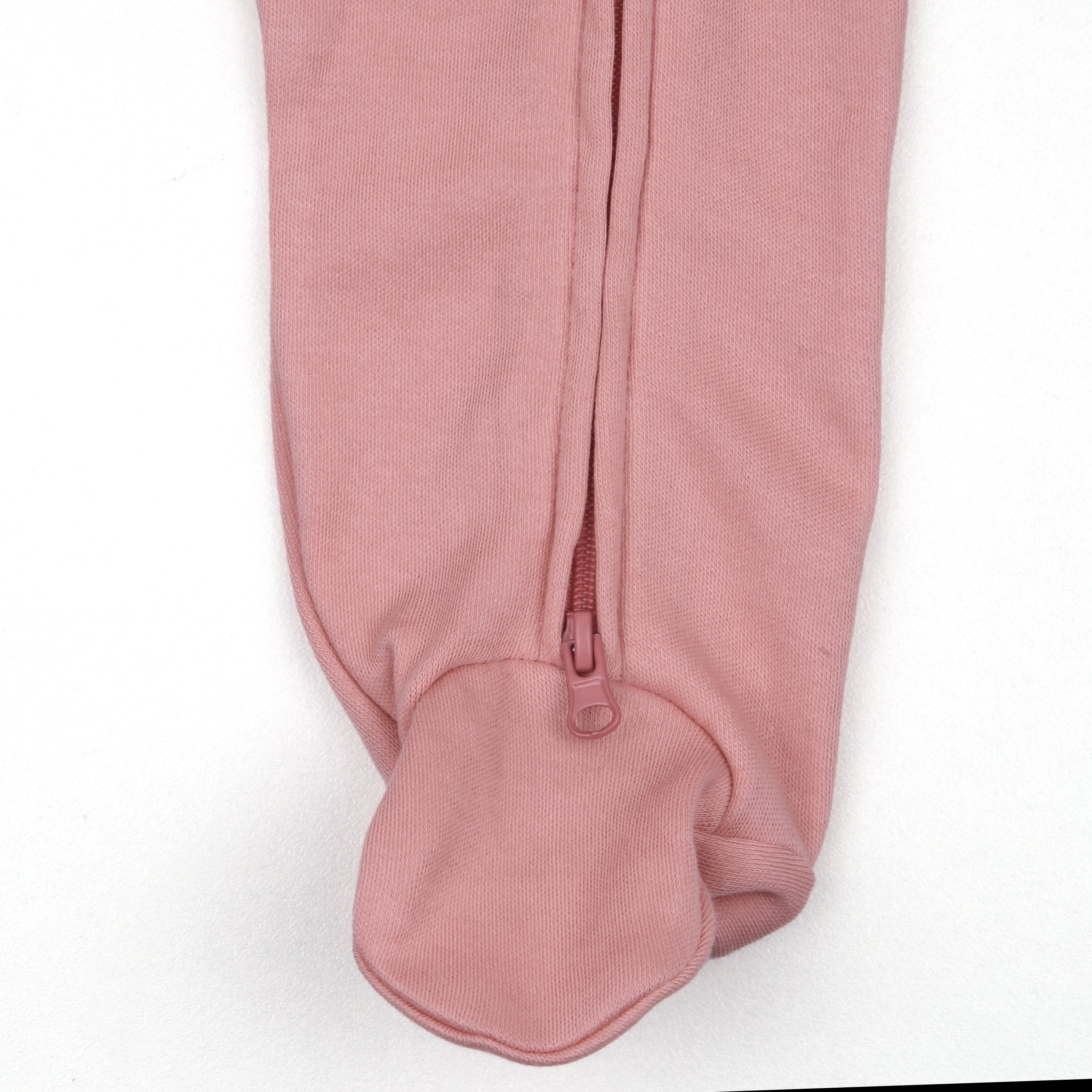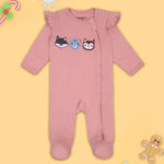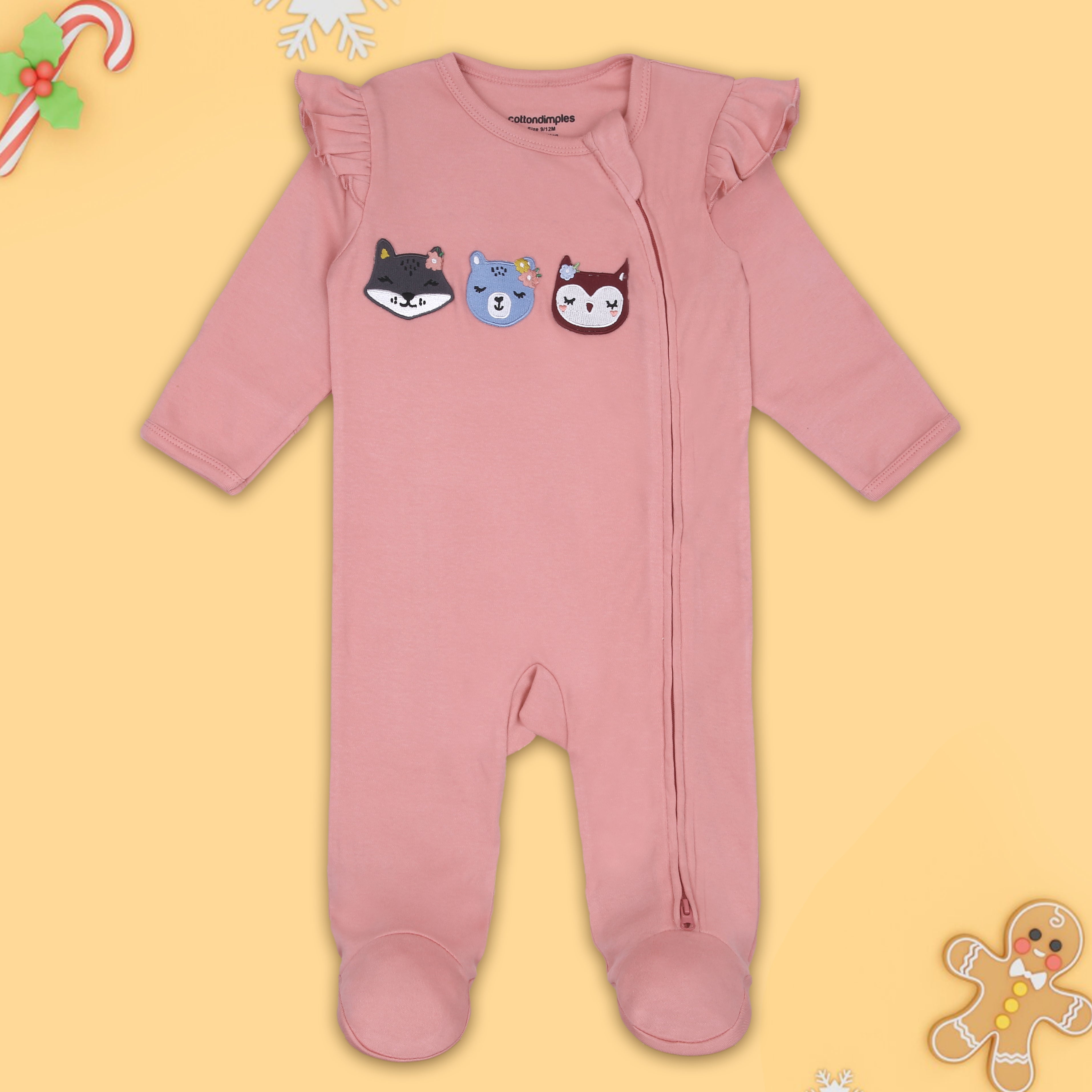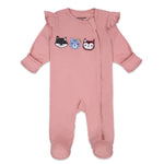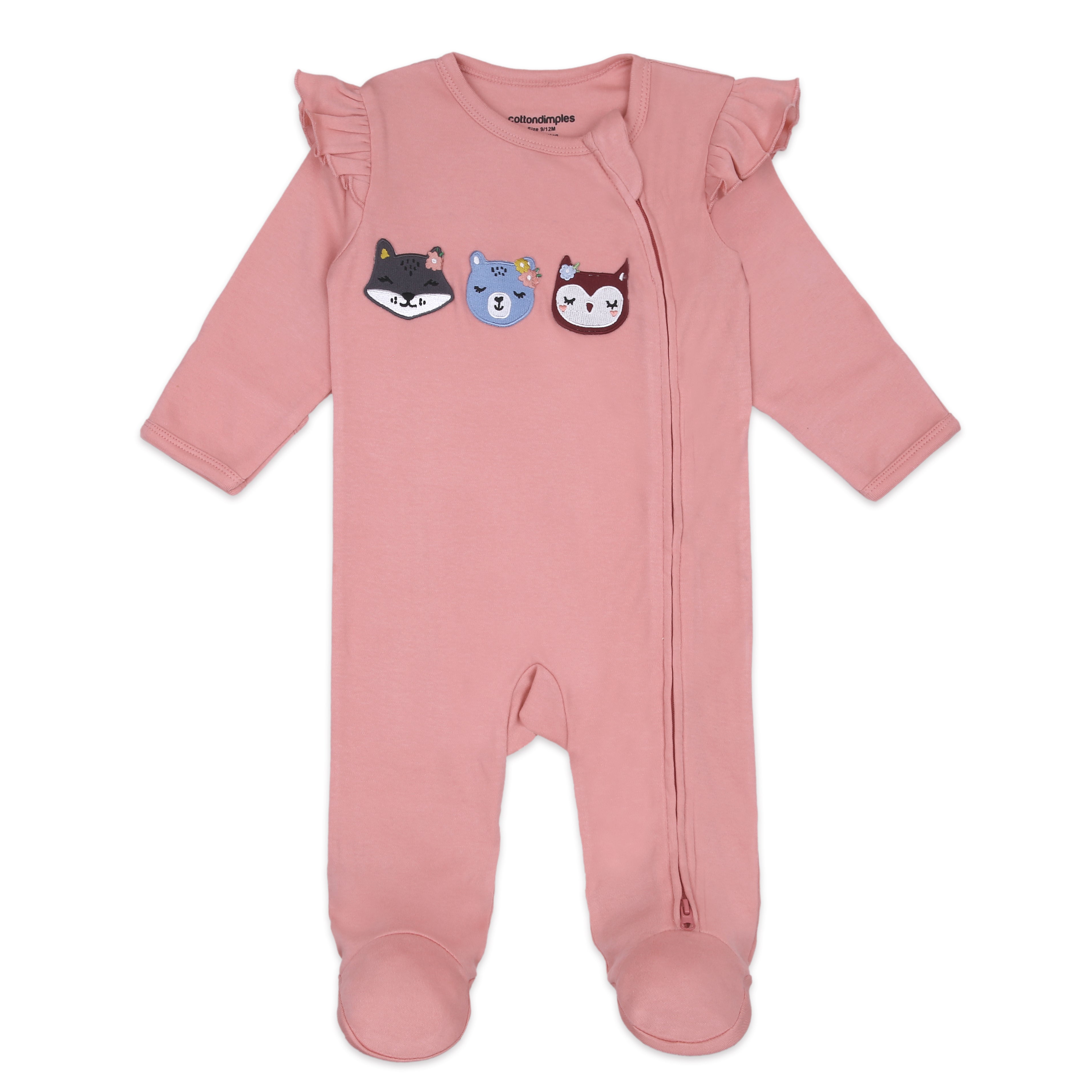 Wrap your baby girl in cozy cuteness in this Footie Romper. Made from ultra-soft 100% cotton interlock, this one-piece is breathable, gentle on delicate skin, and ideal for sensitive sleepers. The soft pink color is adorned with three adorable embroidered animal face appliqués across the chest, giving it a playful charm little ones will love.
