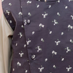 Crafted in premium digital printed cotton, this waistcoat features a delicate floral print on a refined slate base. The standout detail is its asymmetrical front cut, giving a contemporary twist to the traditional festive look.