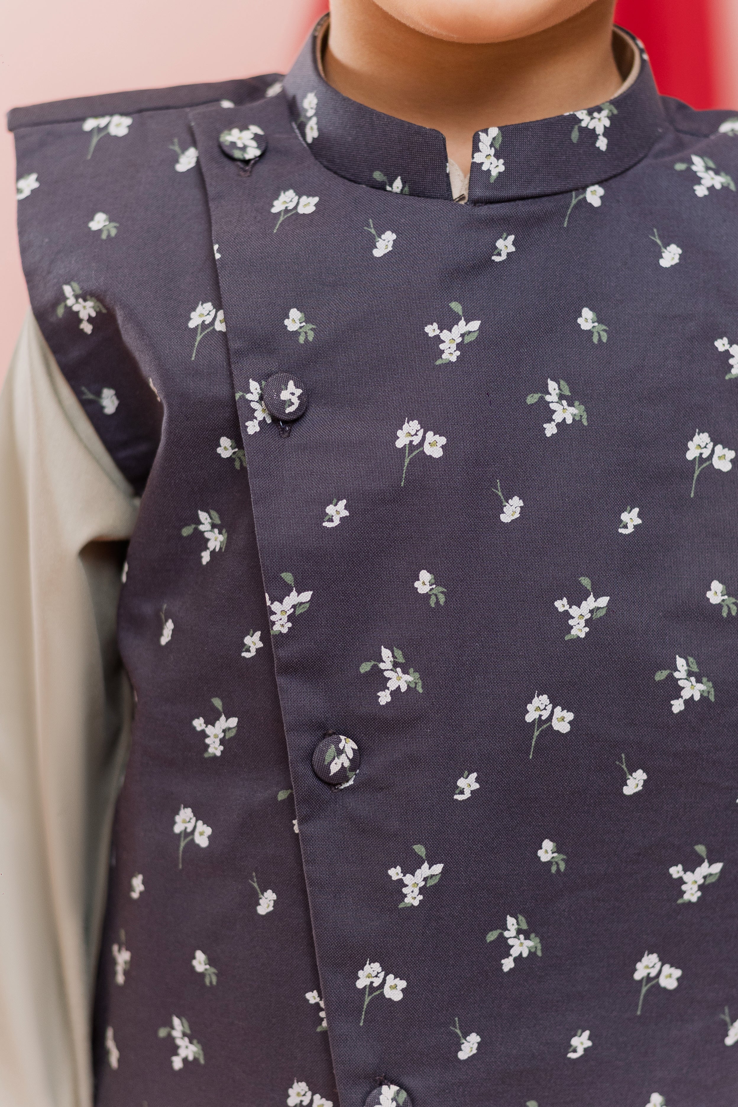 Tailored with a structured band collar and fabric-covered buttons, the silhouette is sharp yet playful — perfect for pairing with a classic kurta pajama for Eid, family gatherings, or daytime celebrations.