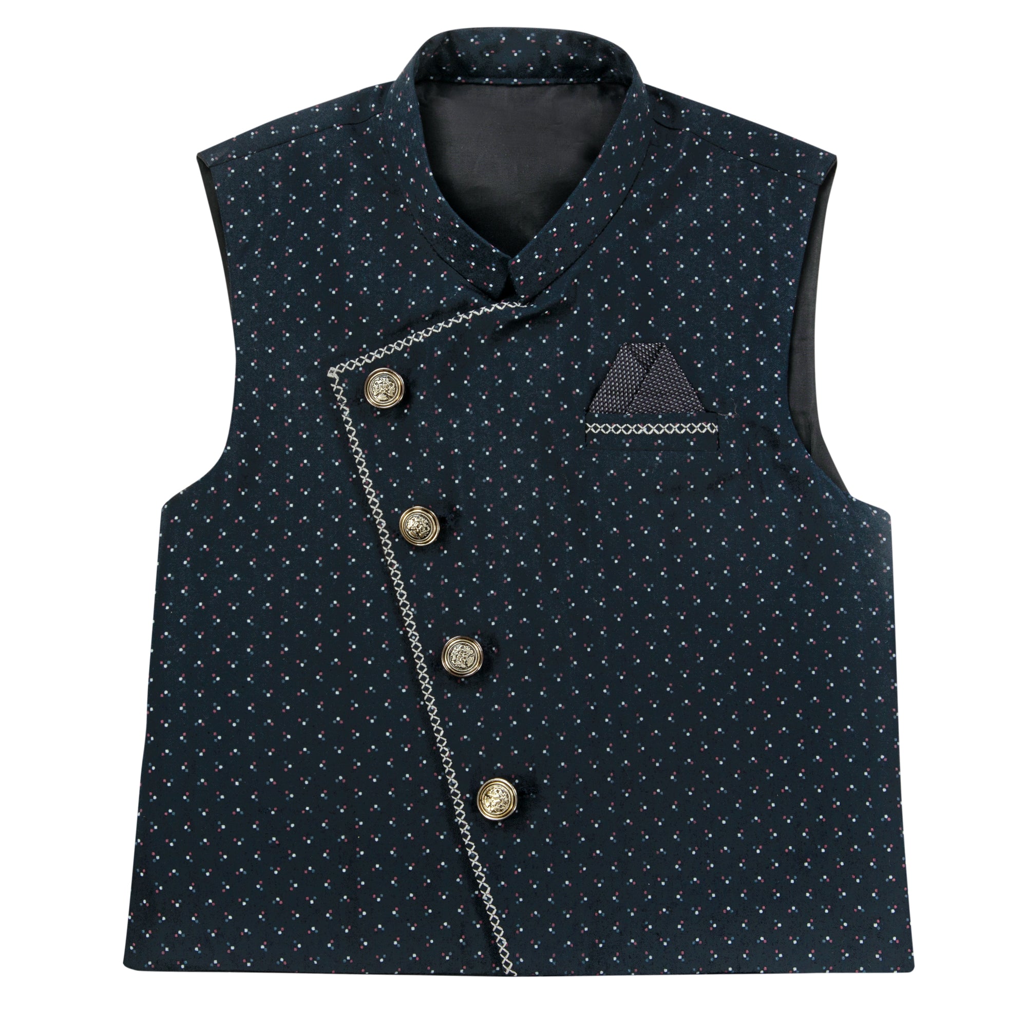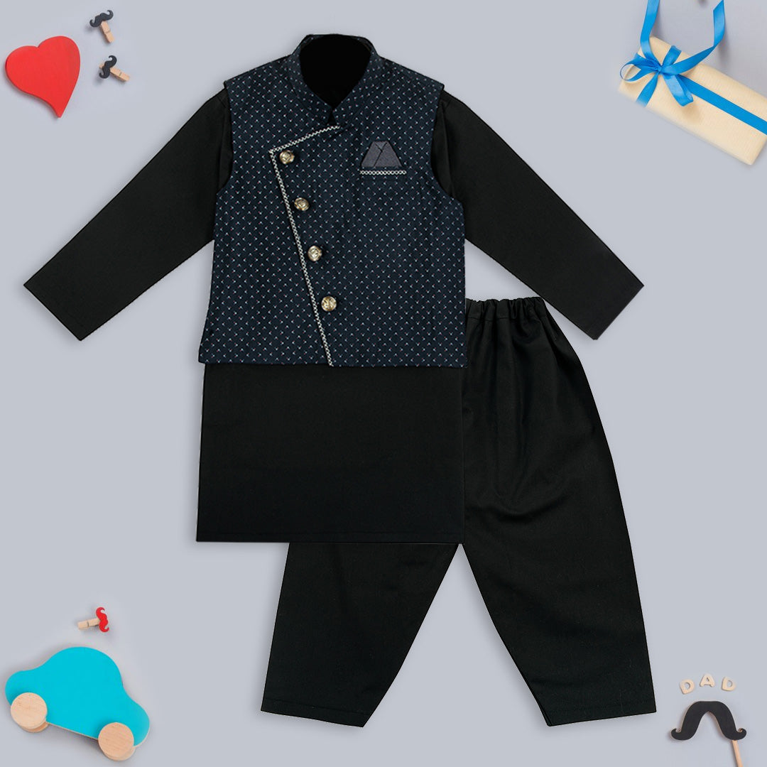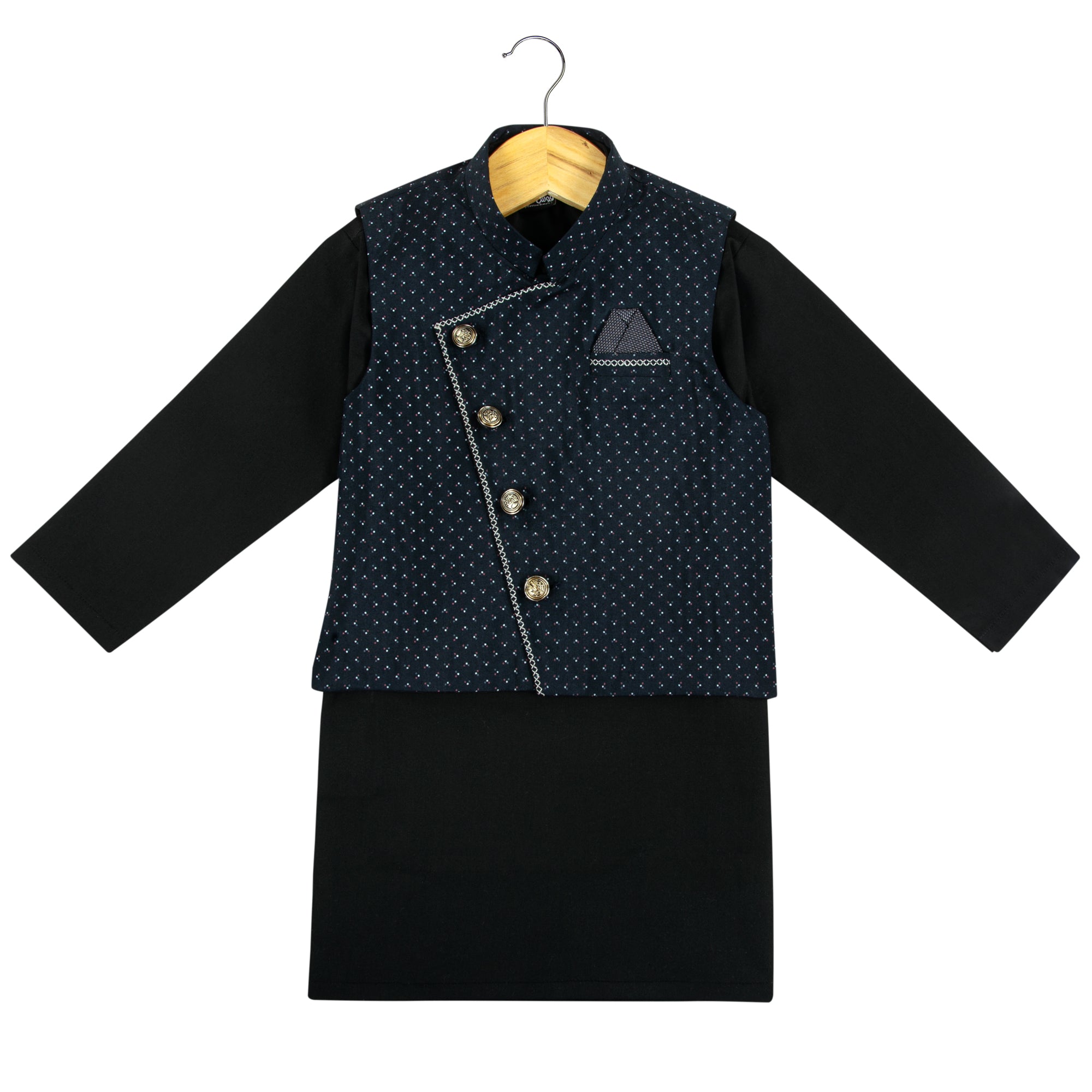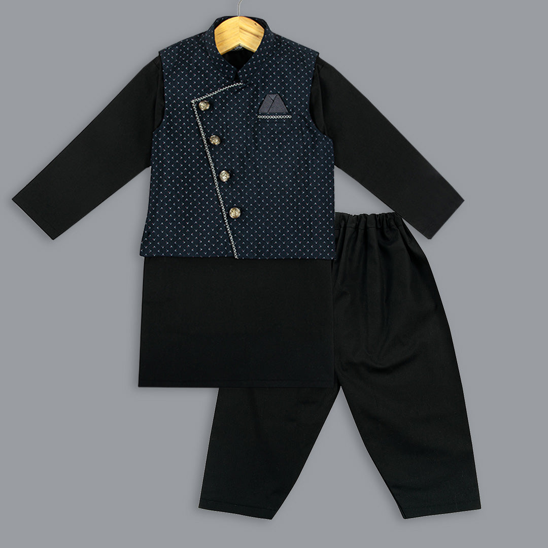 Elevate your ethnic style with our Black 3 Piece Set (includes Kameez, Shalwar and navy waistcoat). The traditional kurta shalwar is enhanced with metal buttons and a printed waistcoat featuring contrasting color embroidery, adding a touch of trendiness to your look. Perfect for any casual or formal occasion.