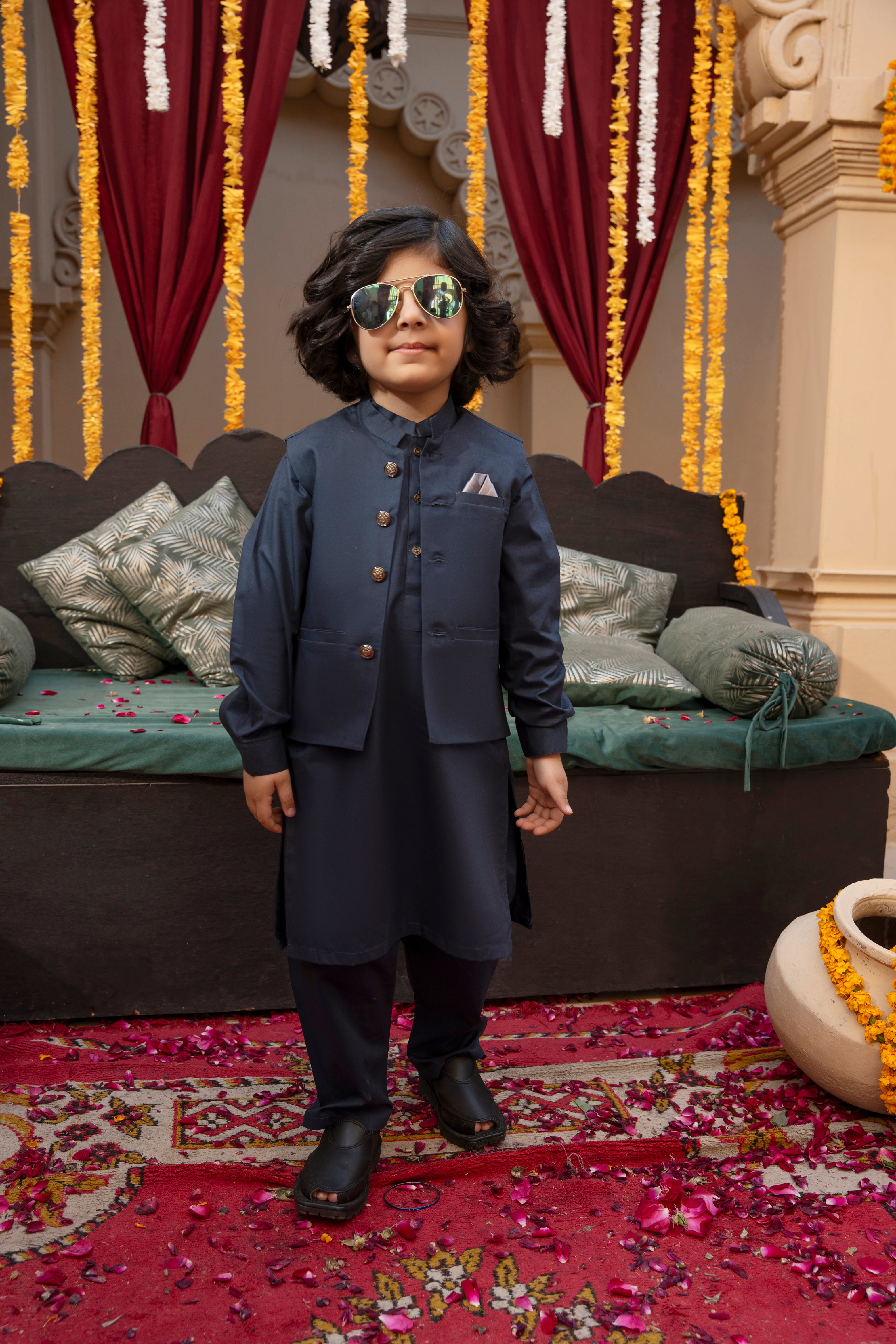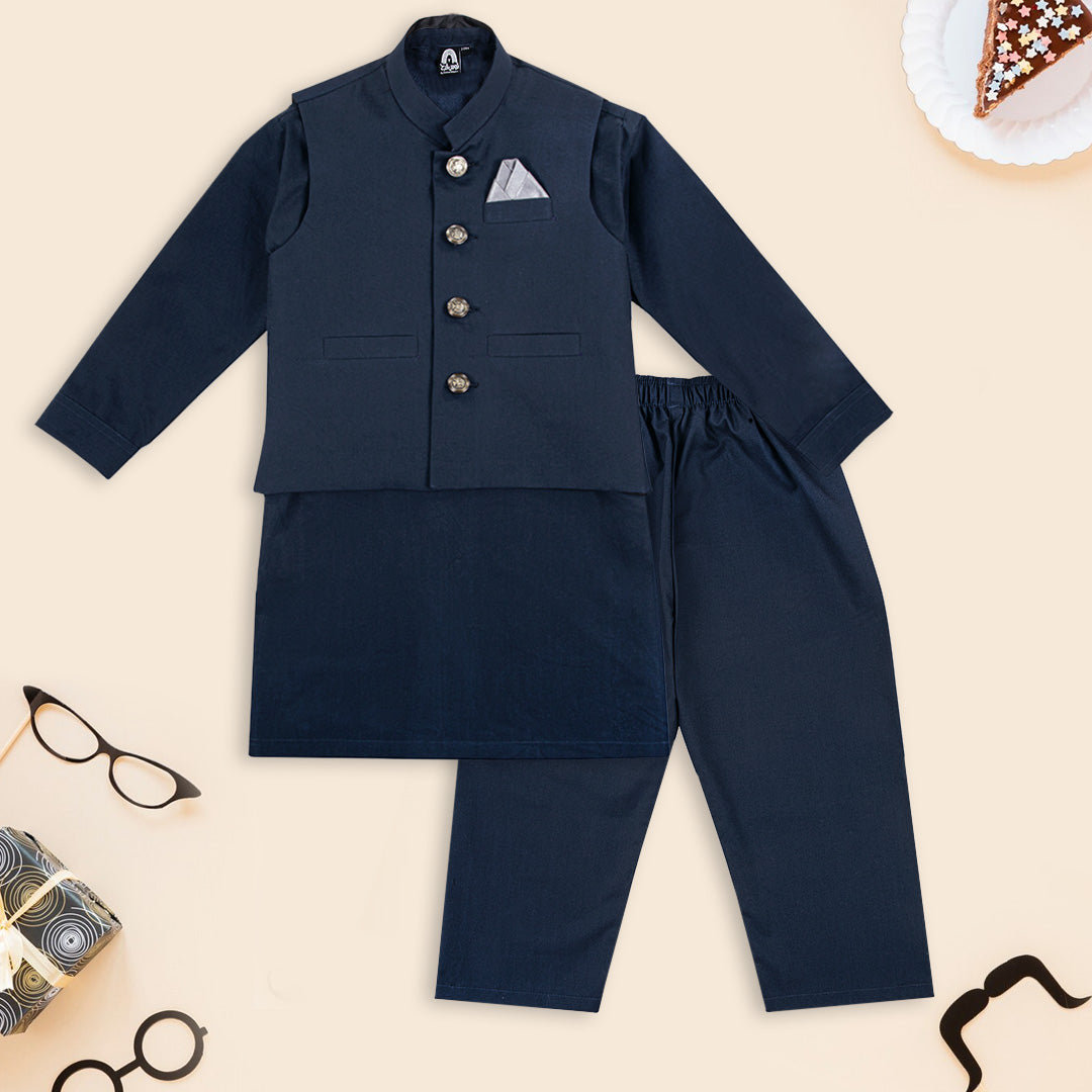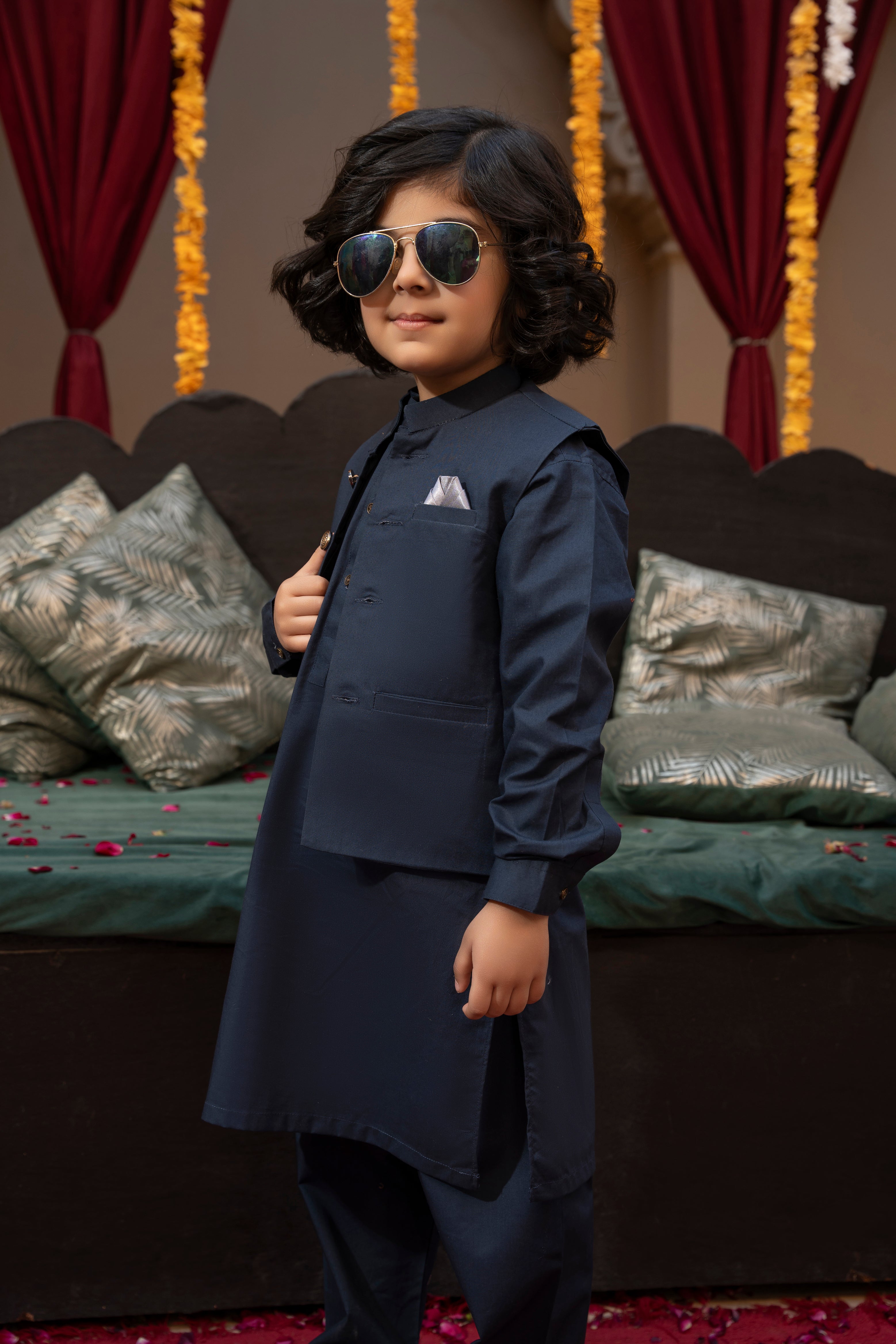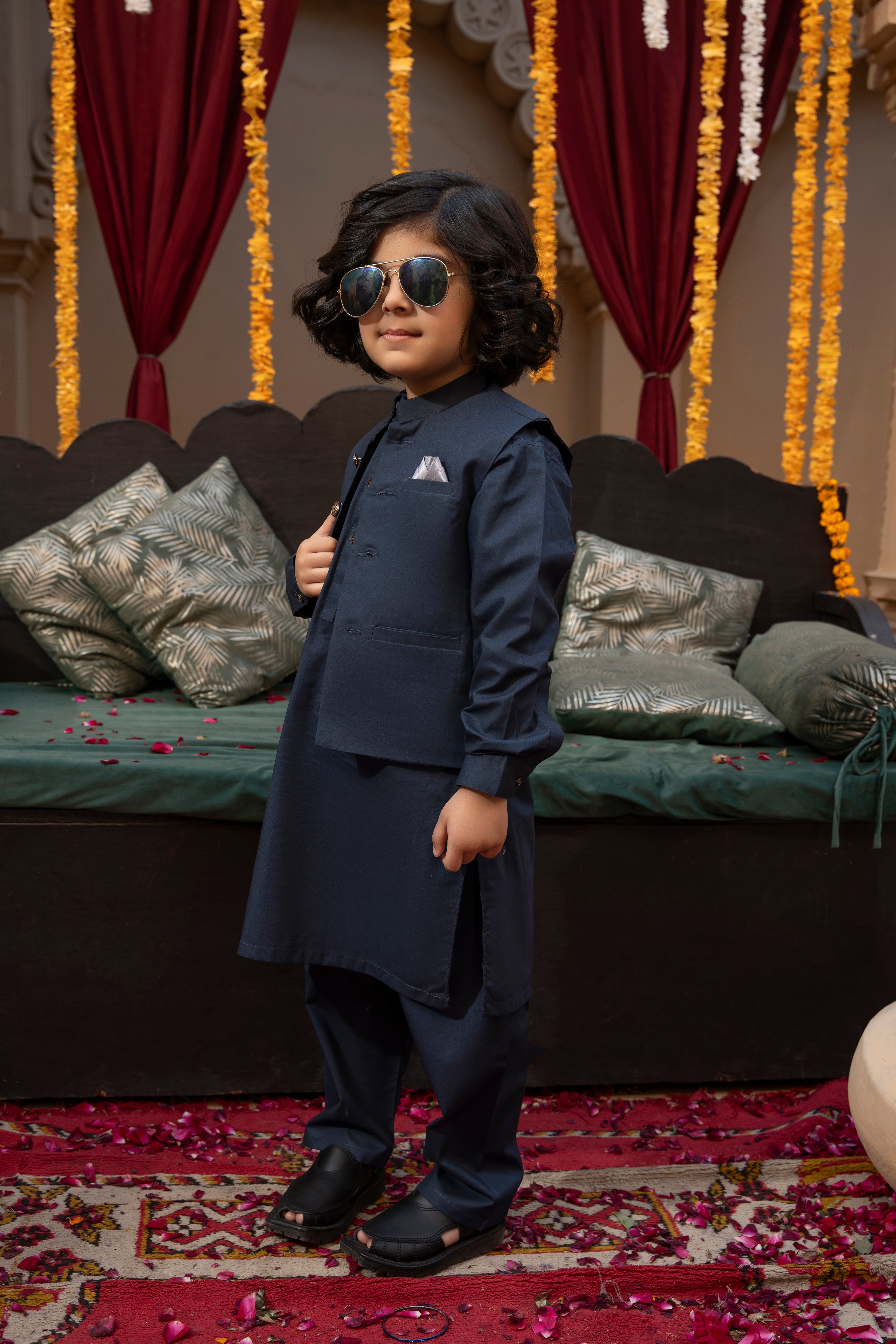 Upgrade your traditional style with our Navy Blue 3 Piece Set (Kurta, Shalwar and Waistocat). This handsome set features a navy blue kurta shalwar with metal buttons and a solid waistcoat. Perfect for adding a touch of sophistication to your wardrobe.