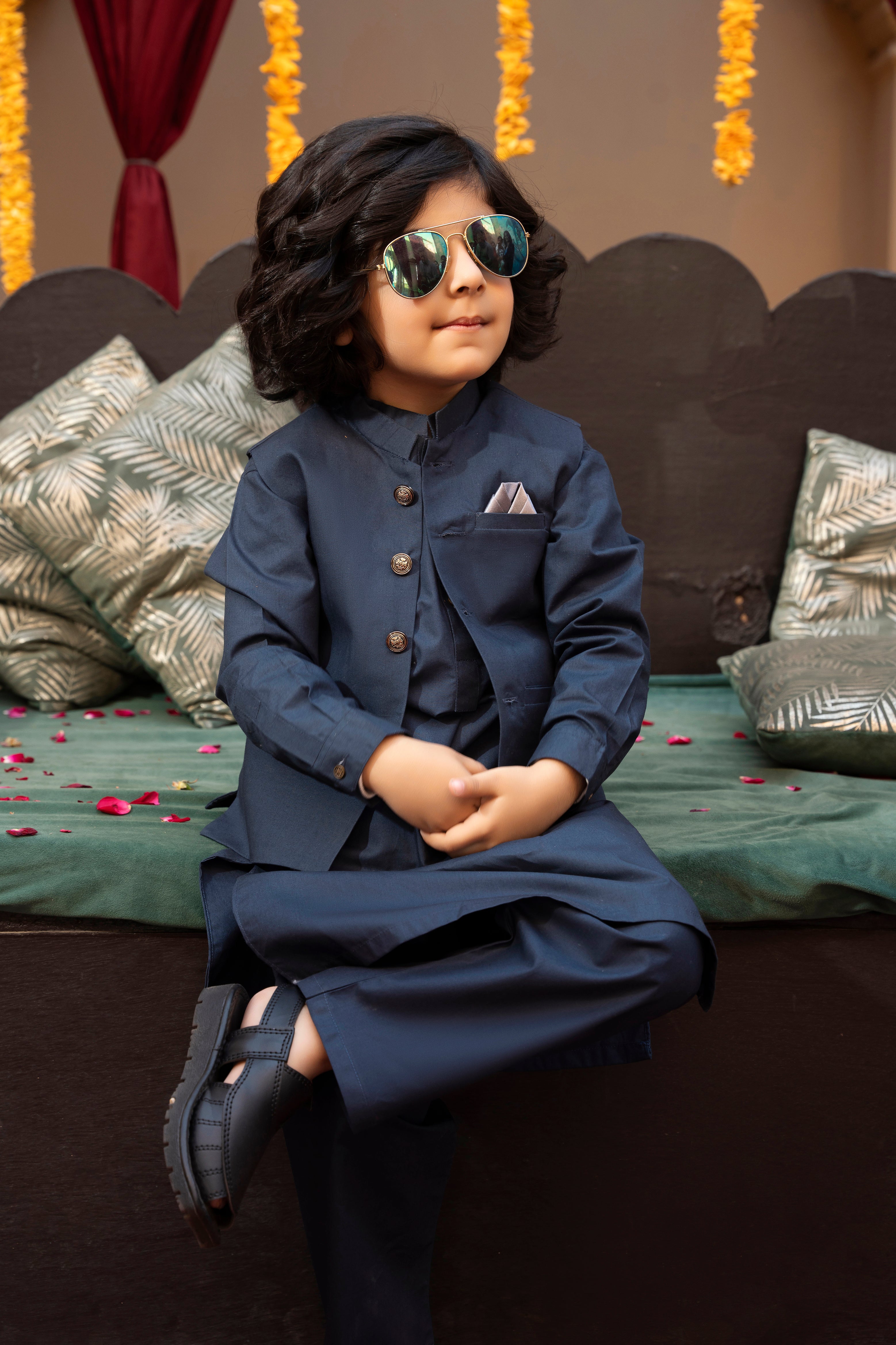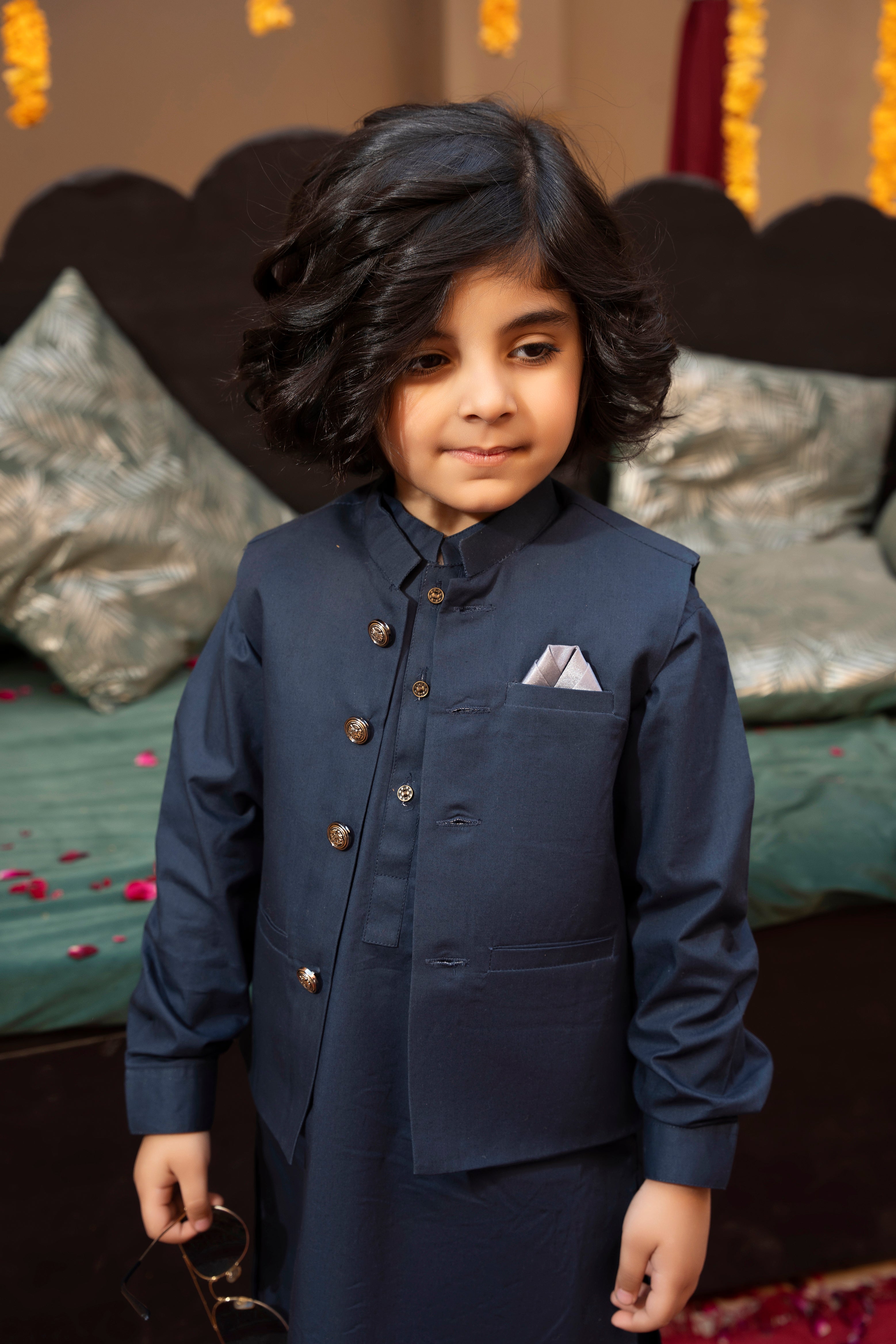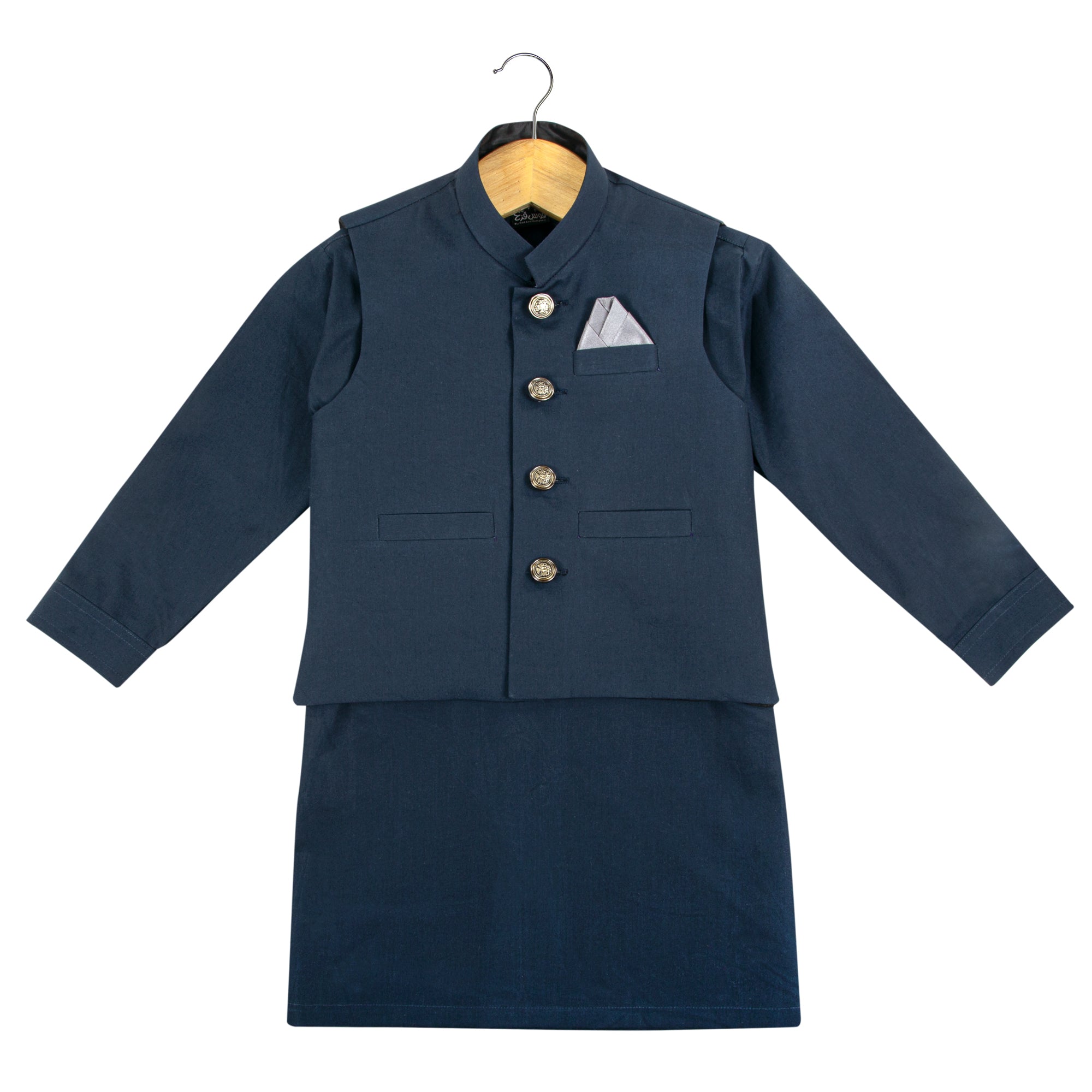 Upgrade your traditional style with our Navy Blue 3 Piece Set (Kurta, Shalwar and Waistocat). This handsome set features a navy blue kurta shalwar with metal buttons and a solid waistcoat. Perfect for adding a touch of sophistication to your wardrobe.