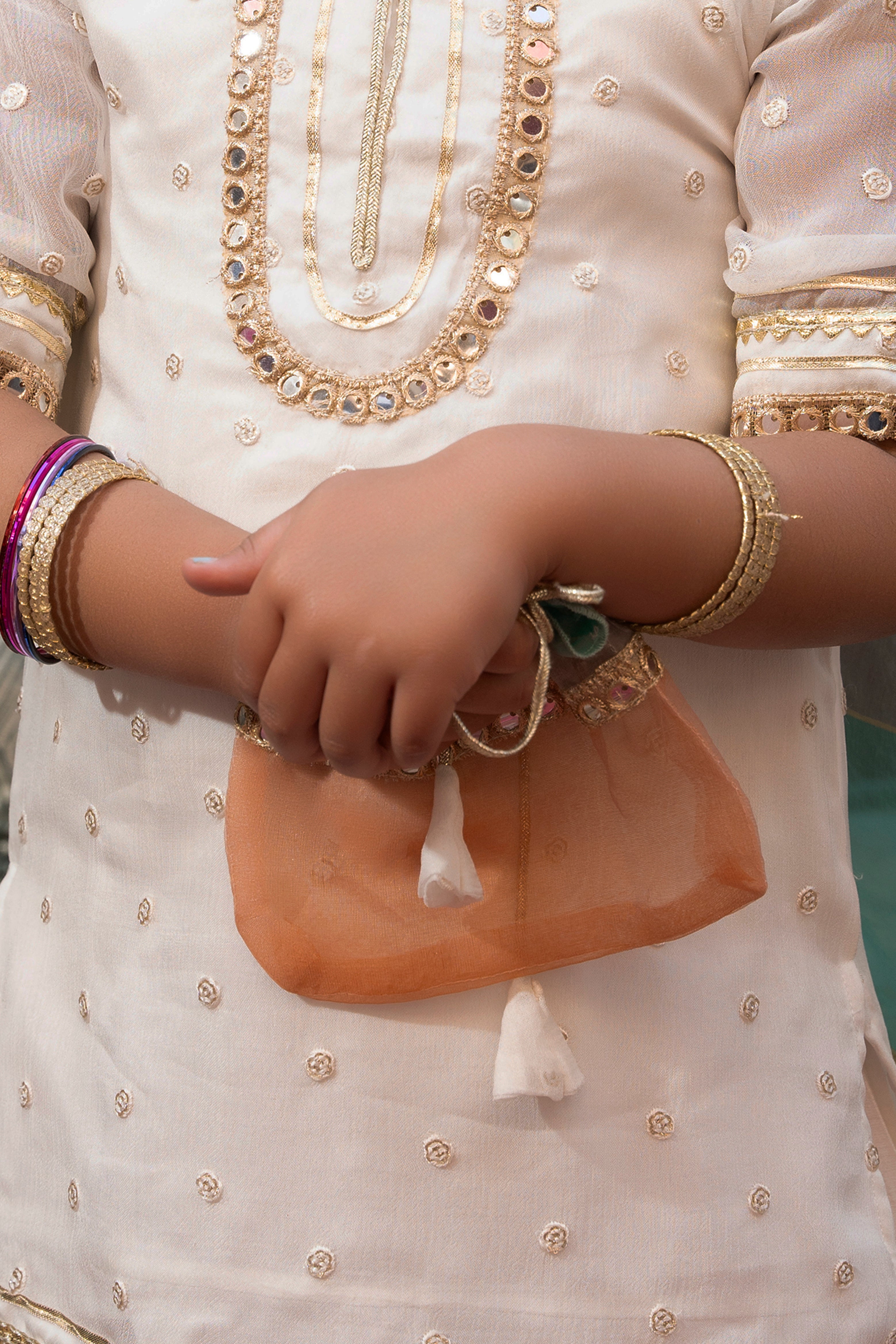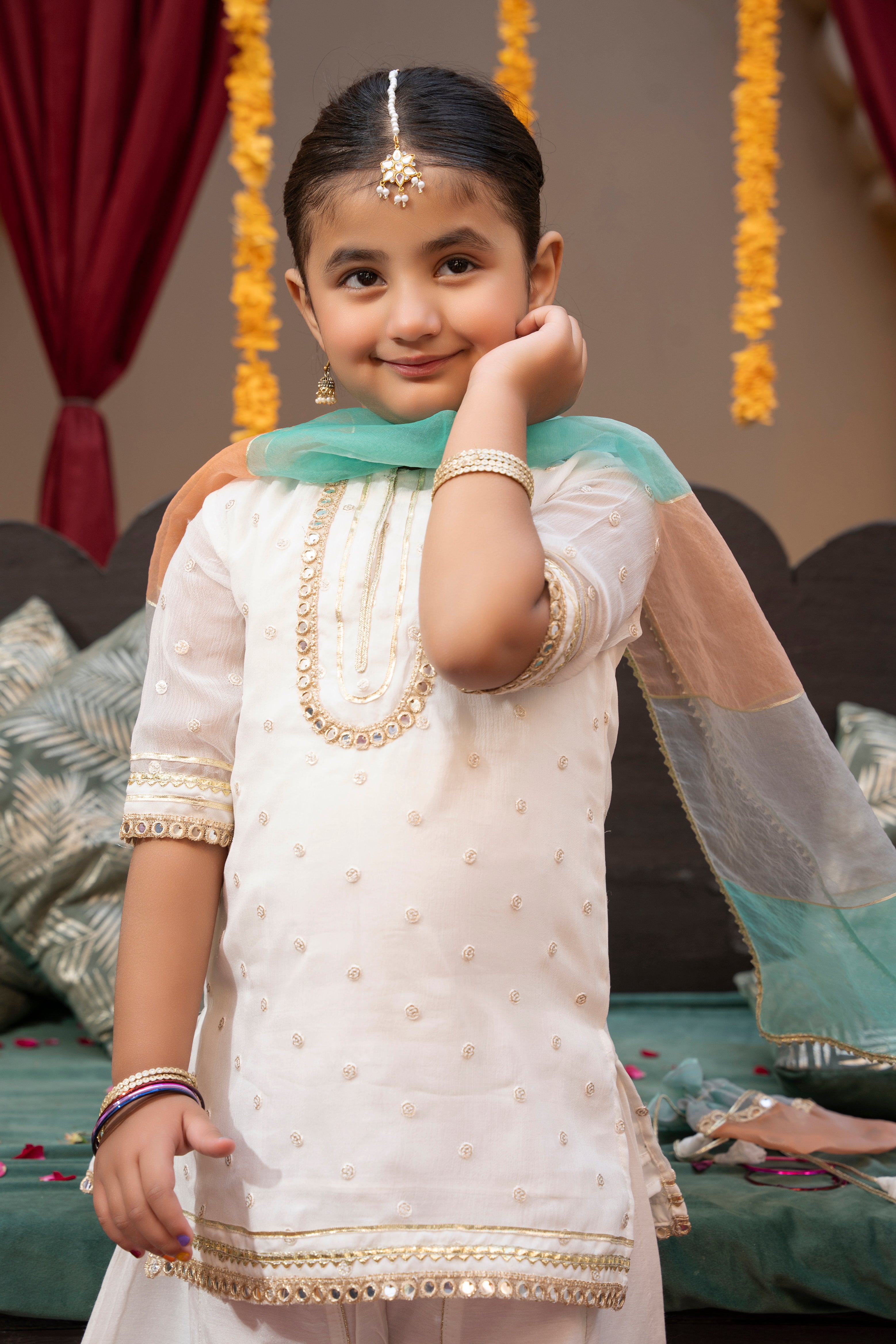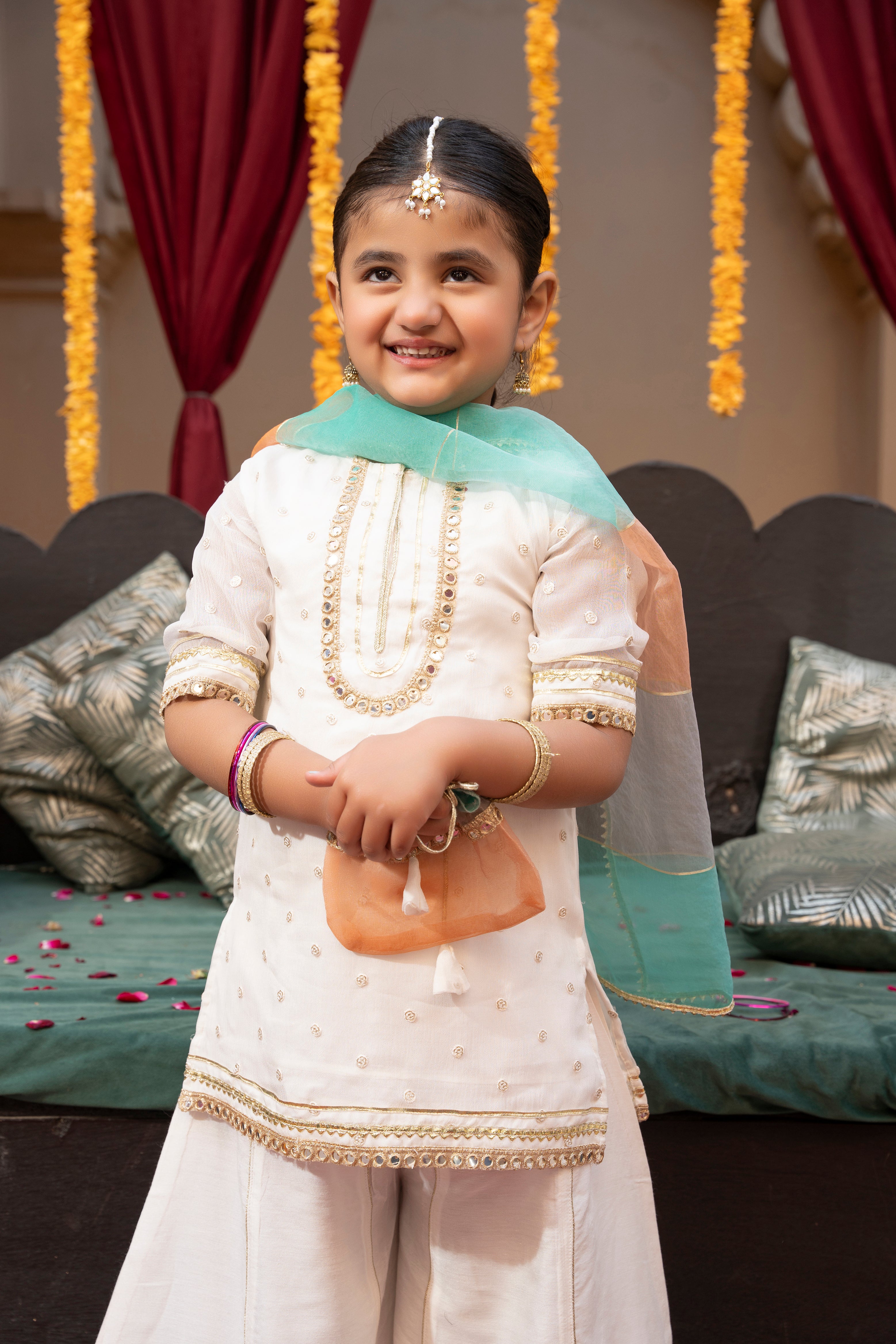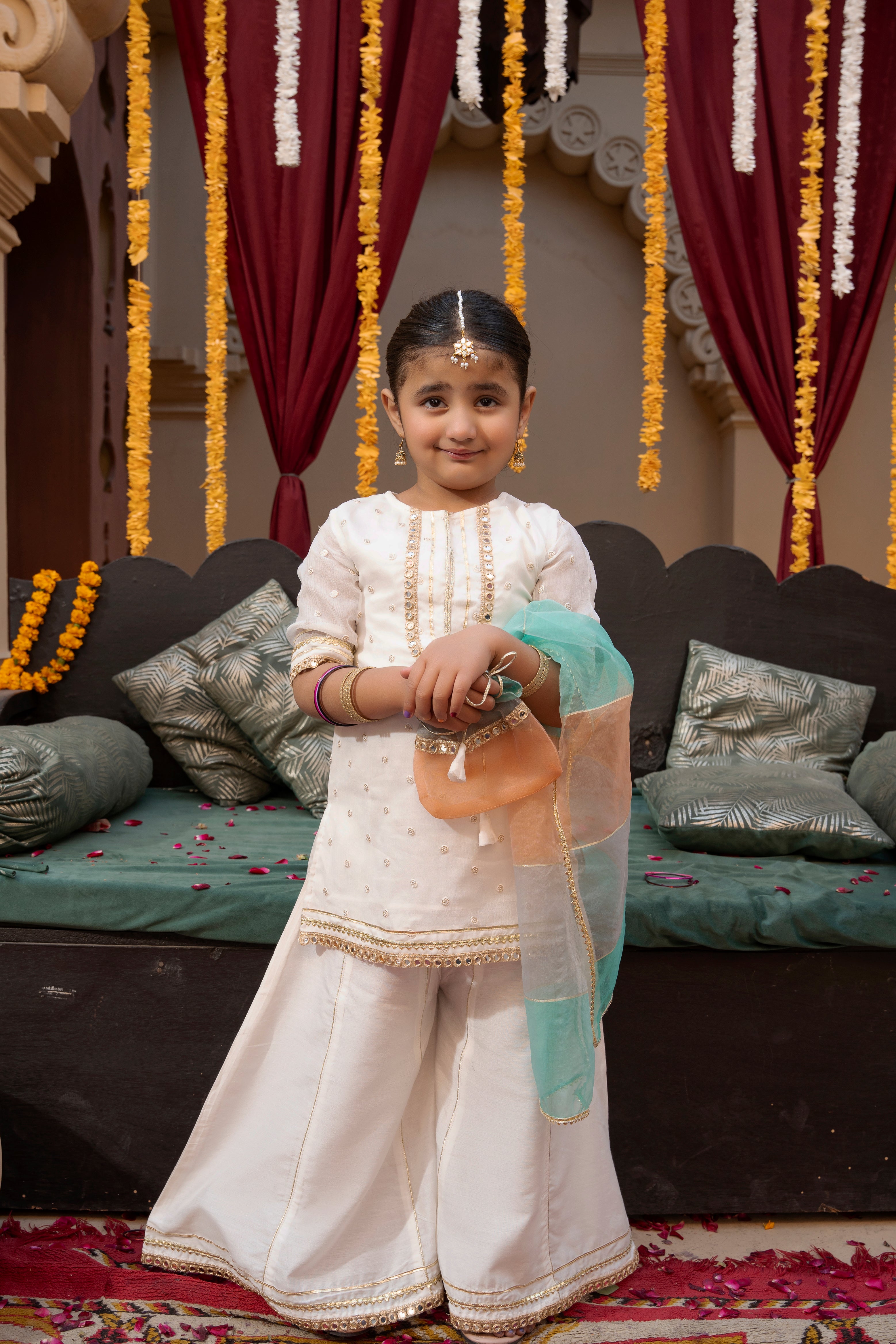 The palazzo is crafted from cotton silk, offering a soft yet structured fit. It is also finished with the same elegant gold lace along the edges, tying the outfit together and enhancing its luxurious feel. The palazzo is designed to provide ample movement, perfect for your little one to dance and twirl freely.