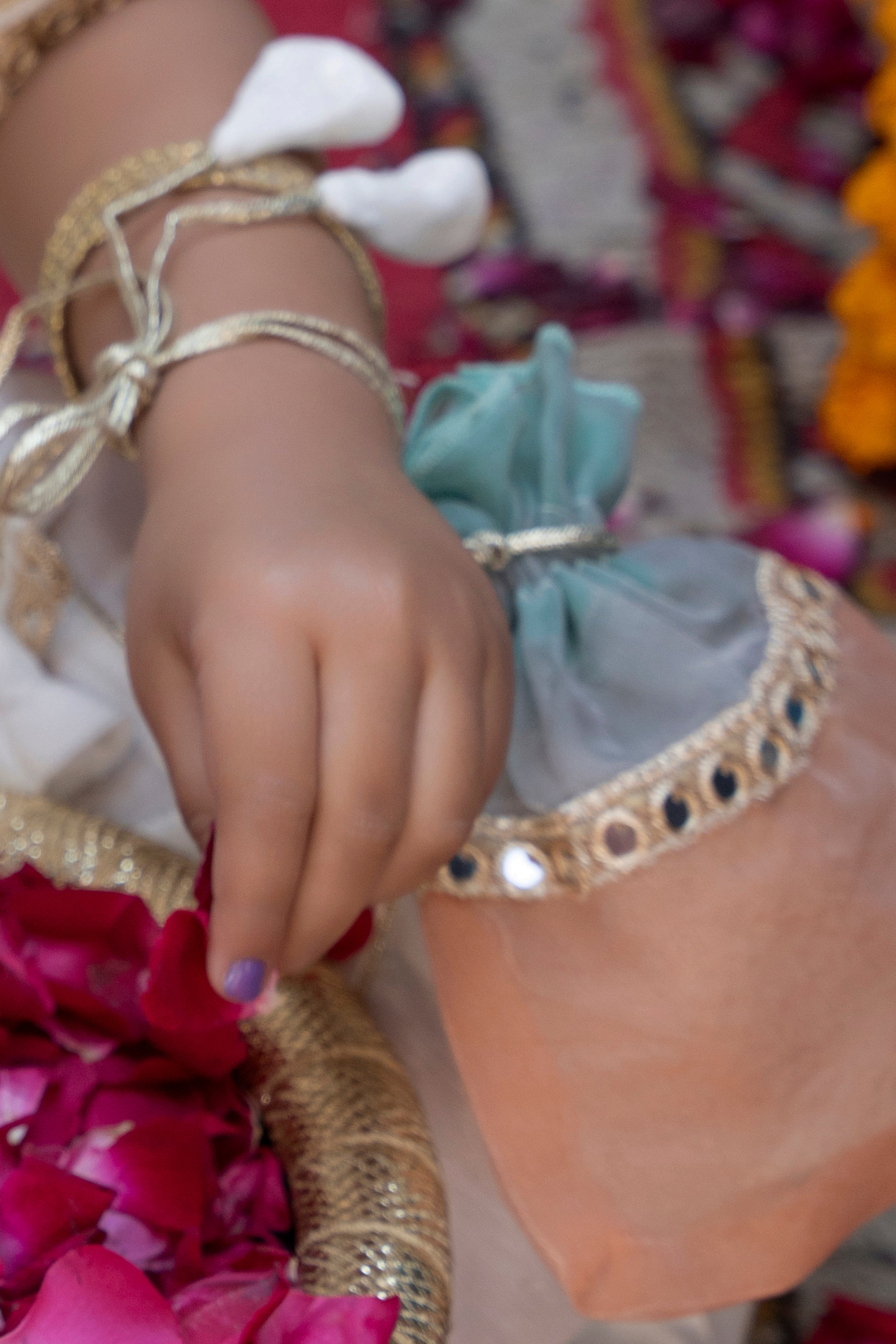 - Sheer multicolored organza dupatta and potli, adding a vibrant, dreamy touch to the outfit