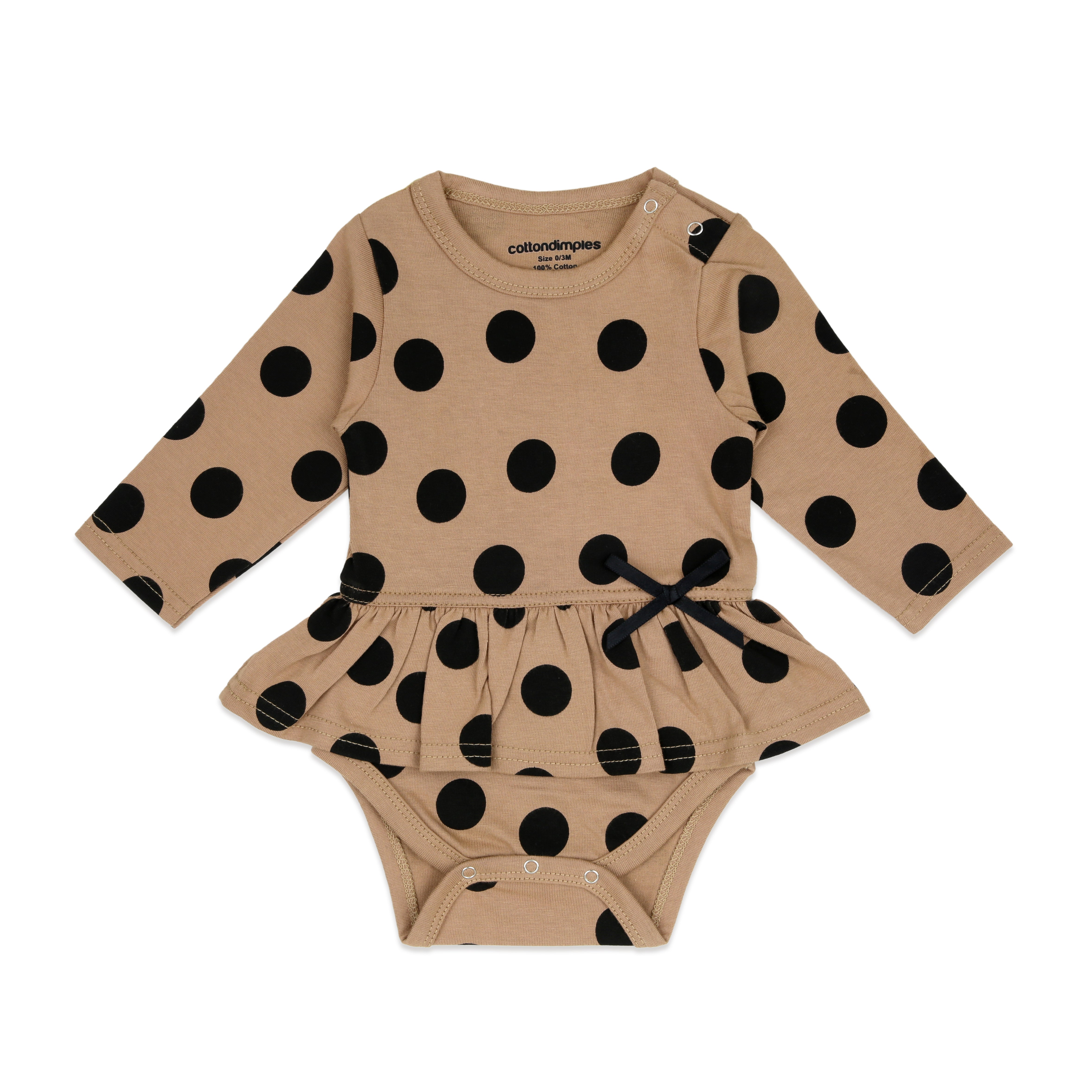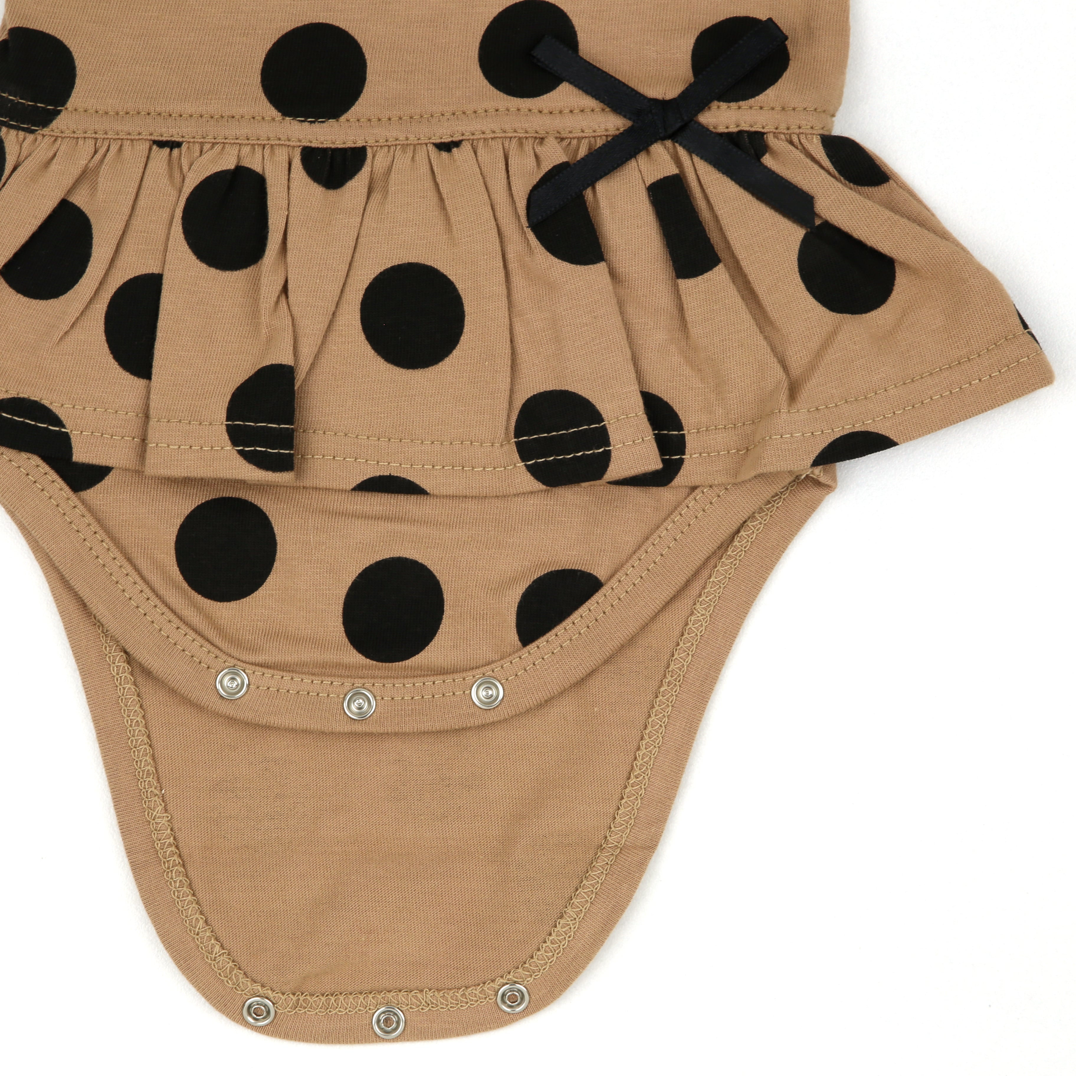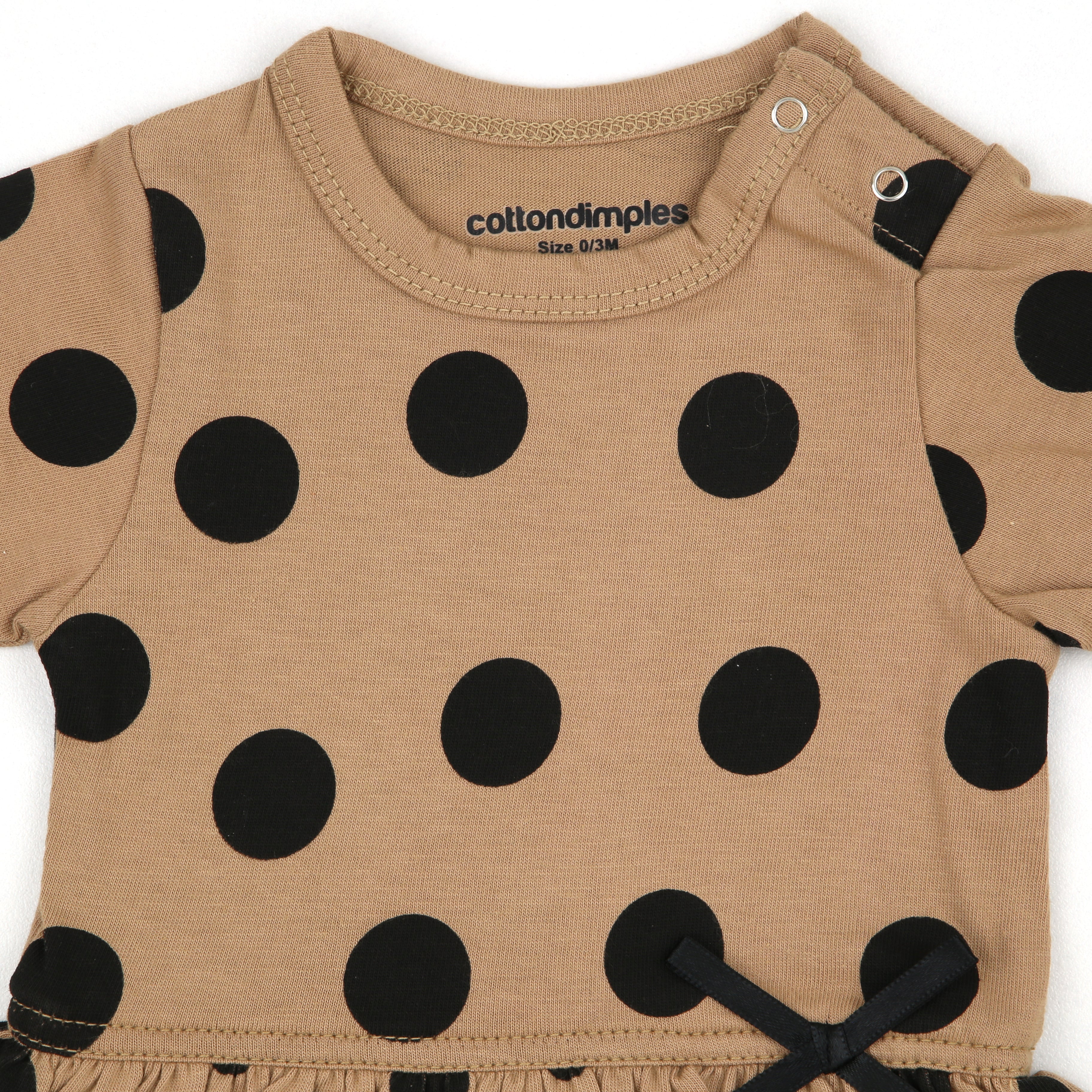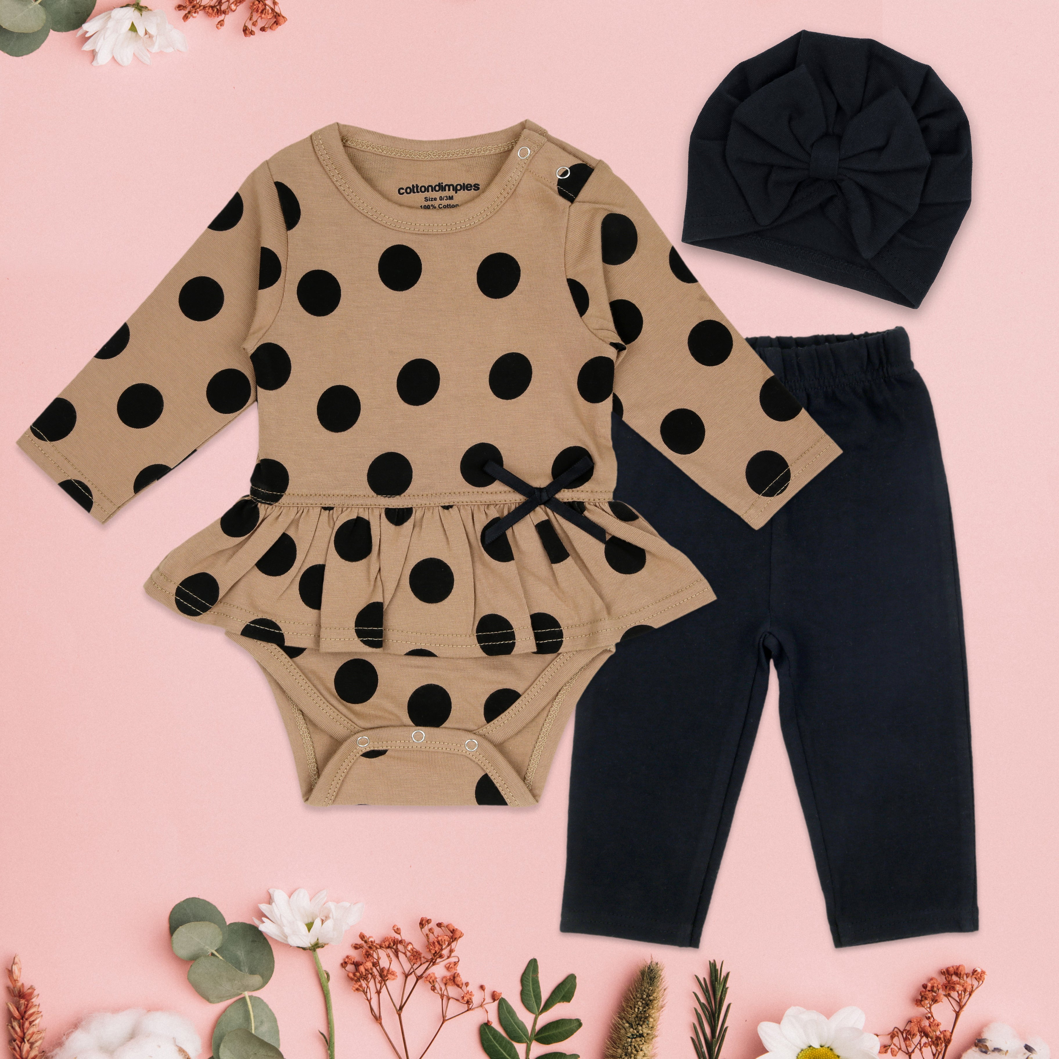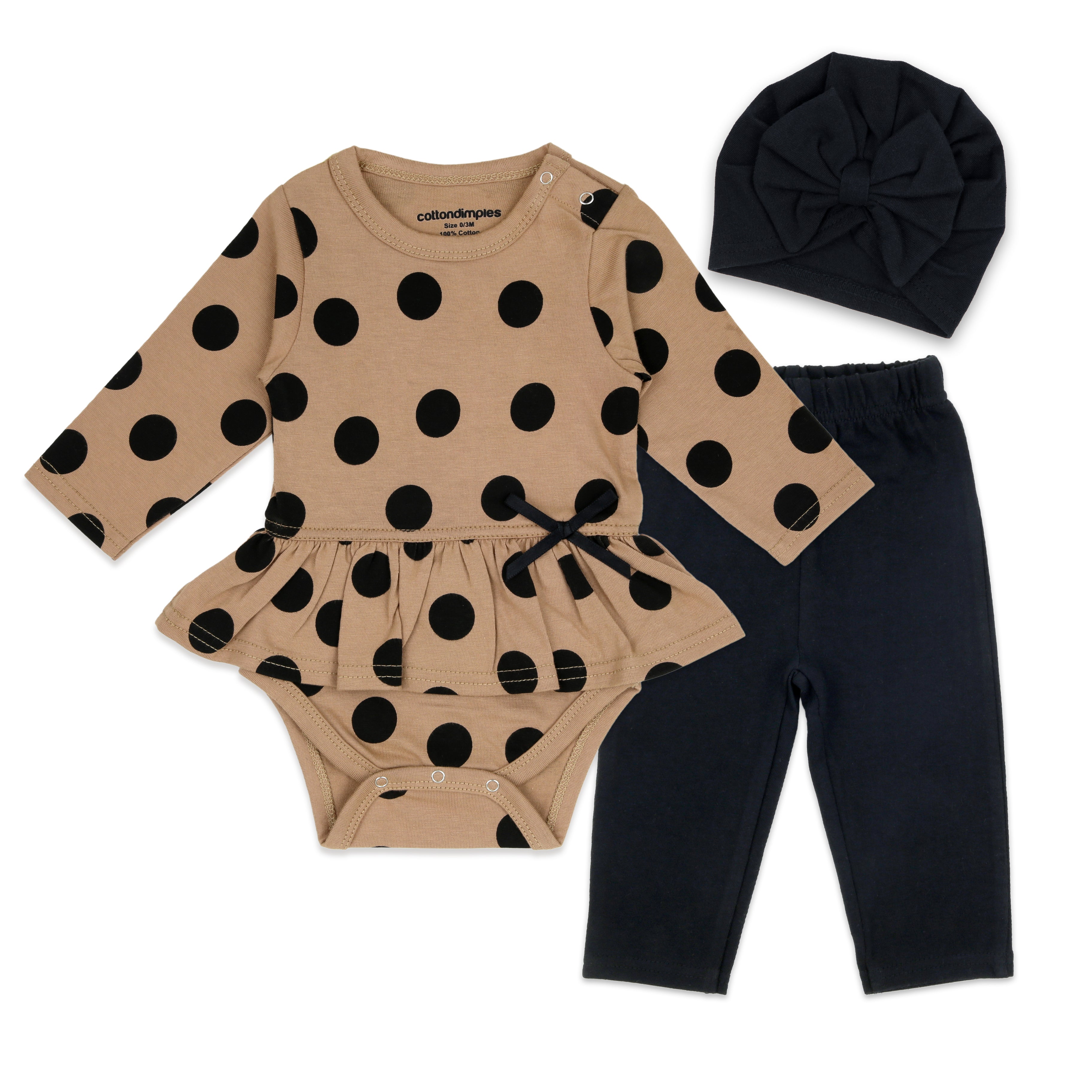 Introducing our adorable 3-piece infant set, designed to keep your little one cozy, stylish, and comfortable. This charming set includes a sand-colored onesie with black polka dots, a matching pair of black pants, and a cute turban cap with a bow. The onesie features an attached tutu for an extra touch of sweetness, with a contrast ribbon bow accenting the tutu for added flair.