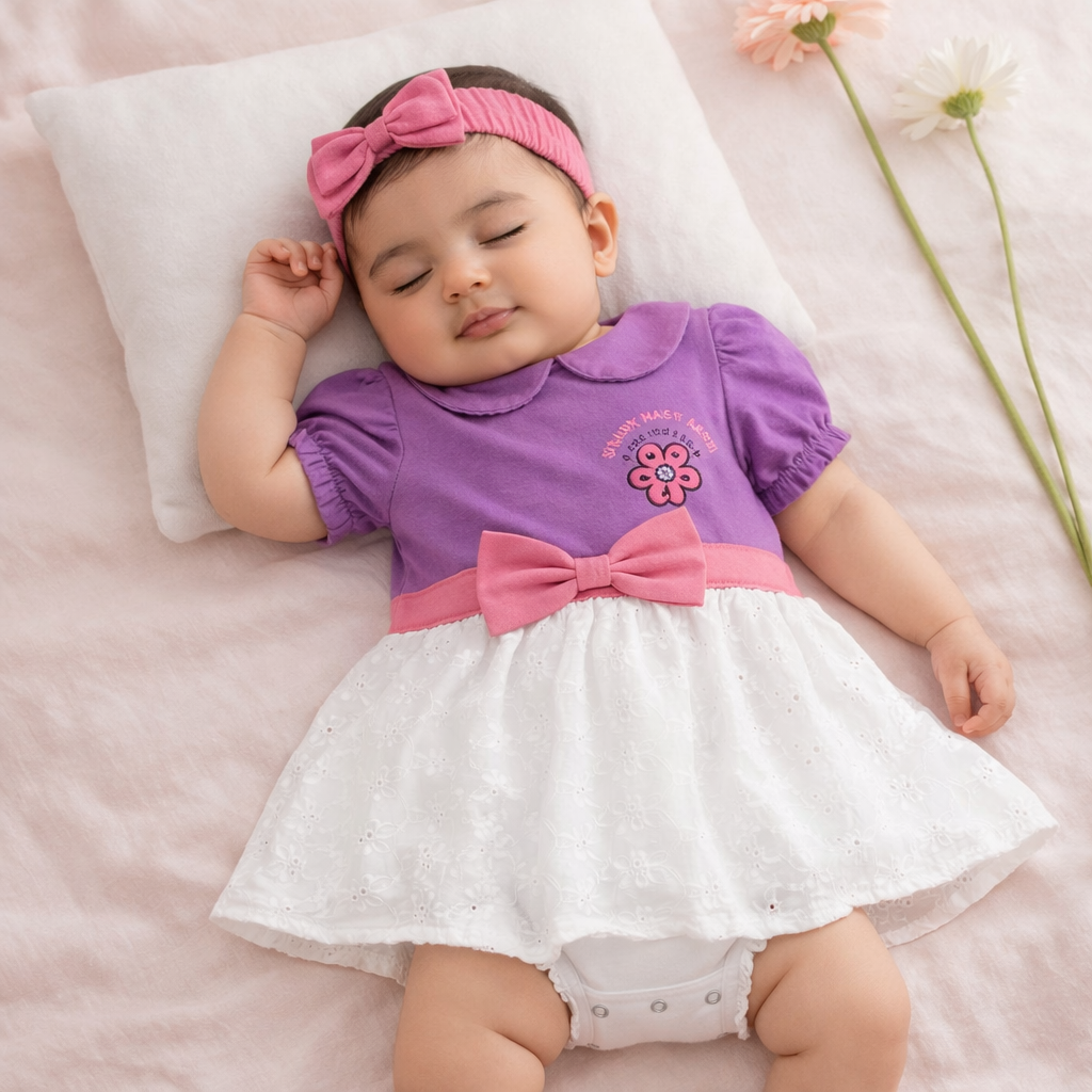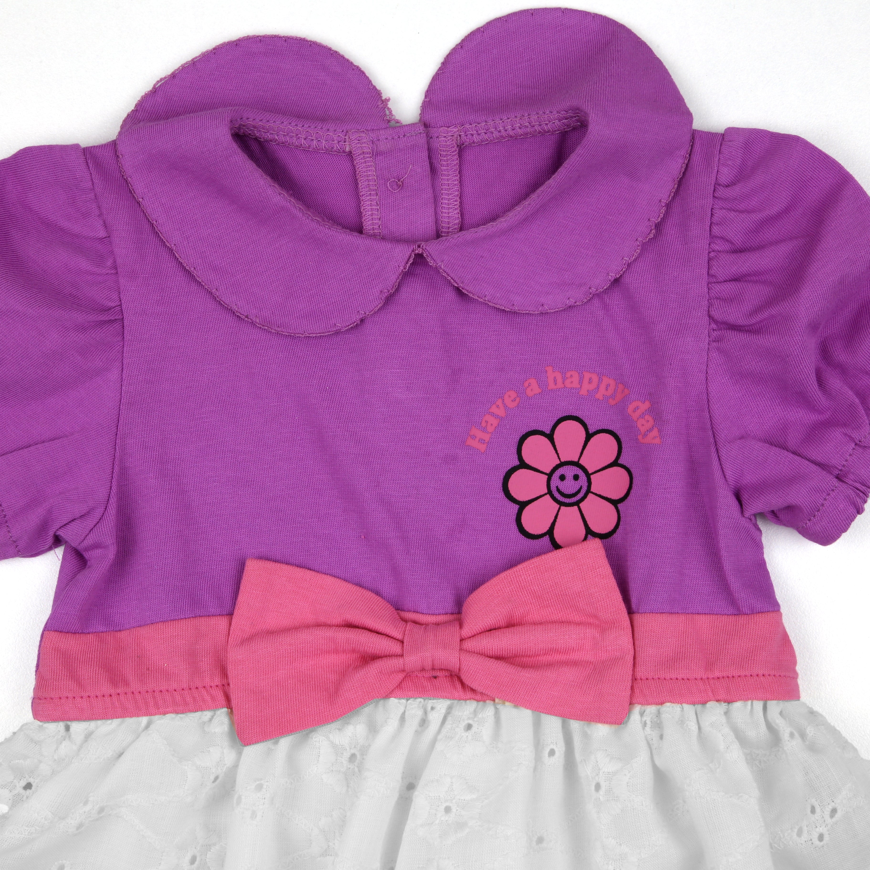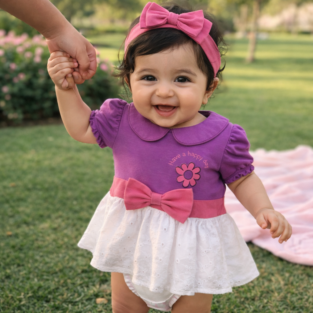 A charming all-in-one outfit designed for your baby girl’s special moments. This romper gives the illusion of a frock with its flared Schiffli-embroidered skirt, while offering the all-day comfort of a soft jersey knit bodice. The playful “Have a happy day” flower print and matching pink bow add to the cheerful vibe. Complete with a matching headband for that picture-perfect look.