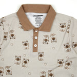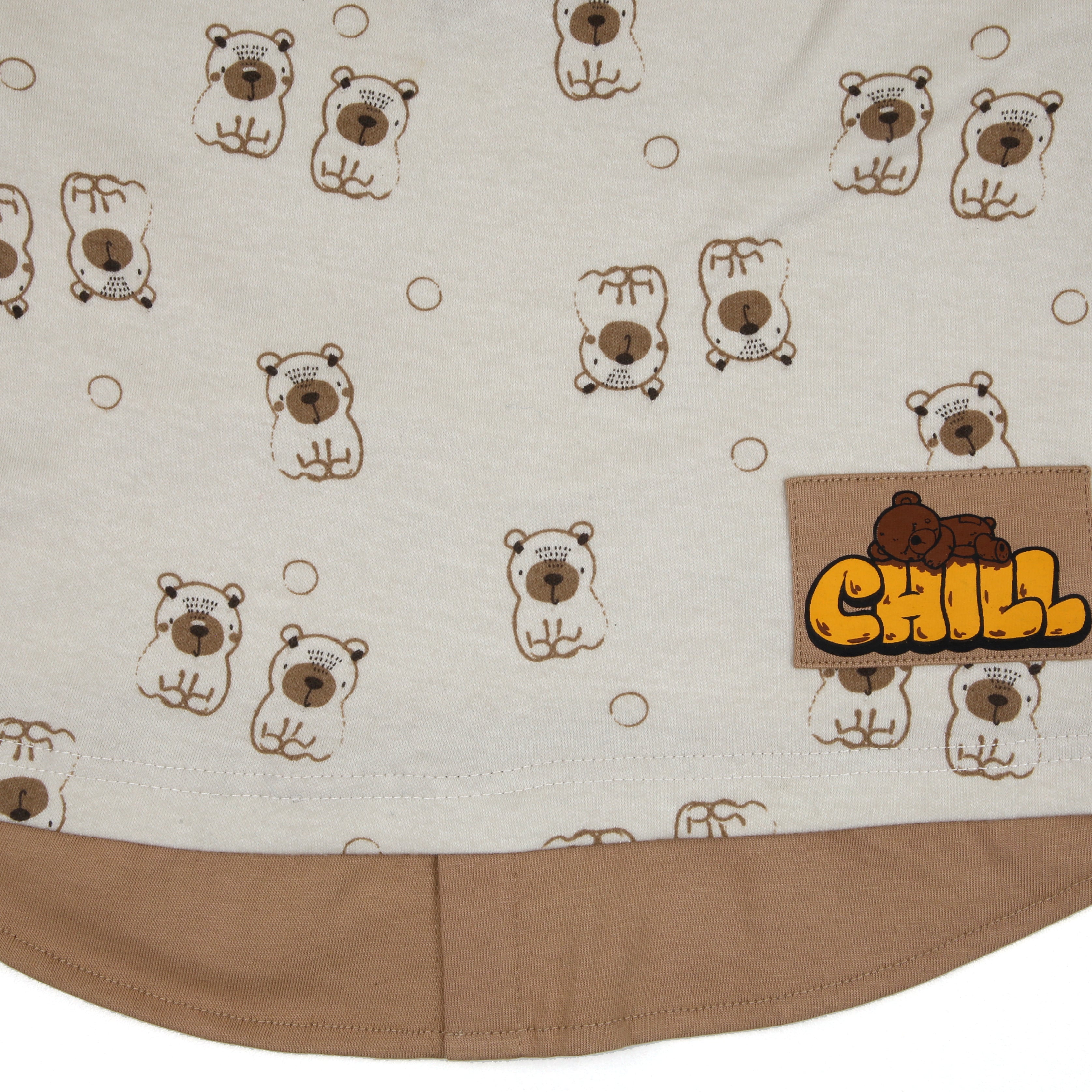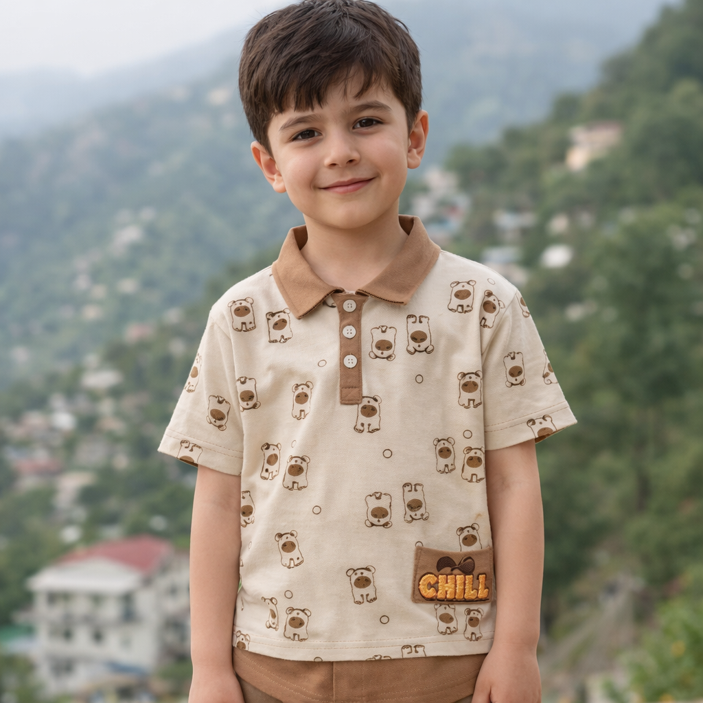 Let your little one chill in style! This adorable toddler polo shirt features a fun all-over bear print with soft neutral tones and a bold “CHILL” embroidered patch on the hem. The contrast collar, button placket, and dipped hem in caramel brown give it a polished, preppy look while keeping it super comfy for everyday wear.