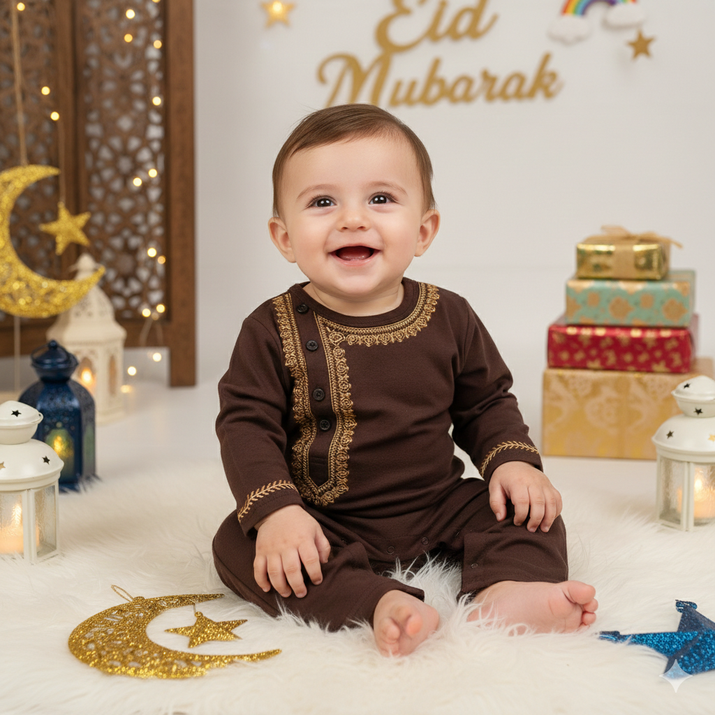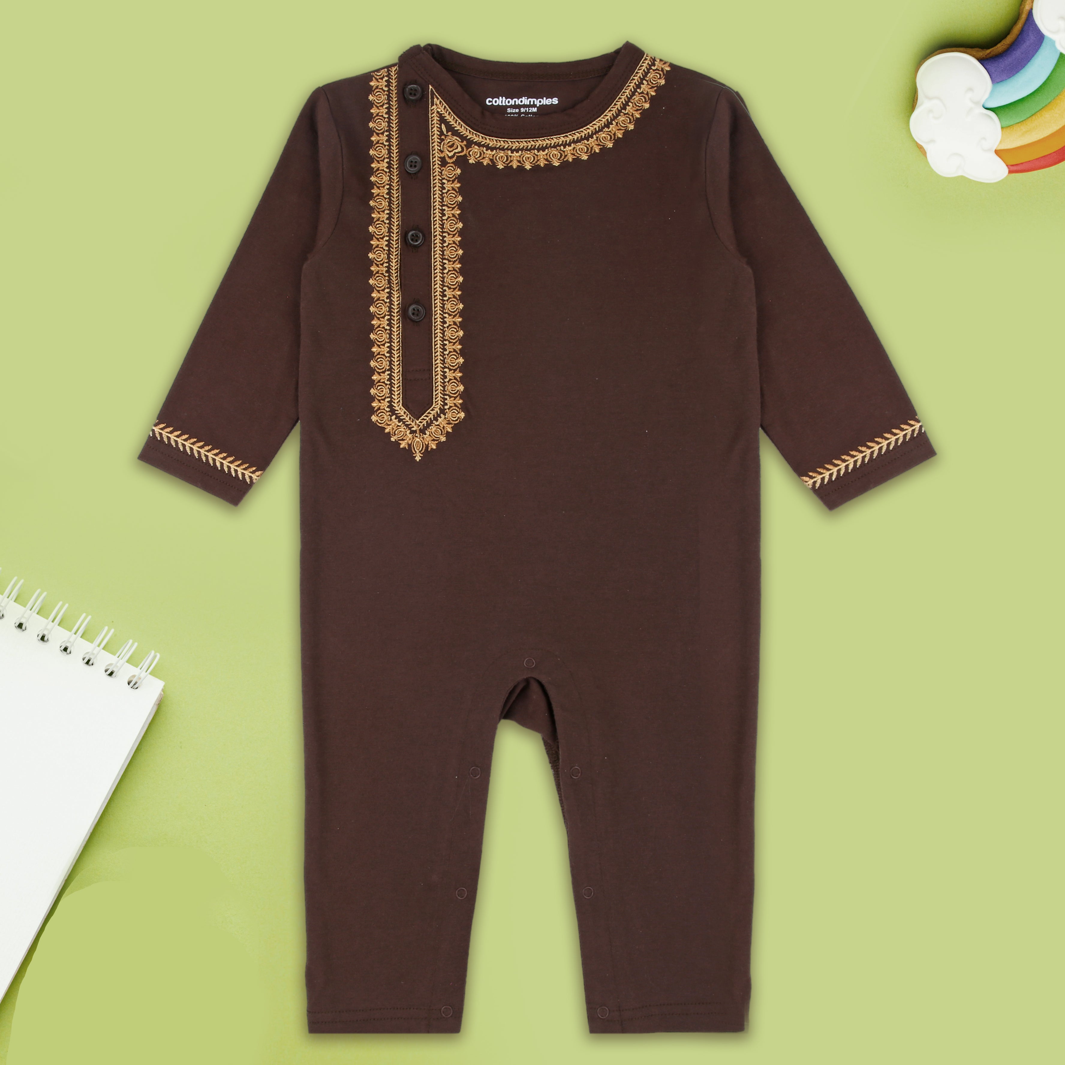 Timeless, regal, and made for your baby prince — the Dara Shikoh Kurta Romper brings the elegance of traditional men’s kurtas to a baby-friendly one-piece design. Made in a rich chocolate brown cotton, this romper features gold embroidered detailing around the neckline, cuffs, and placket to mirror the grace of Eastern festive wear.