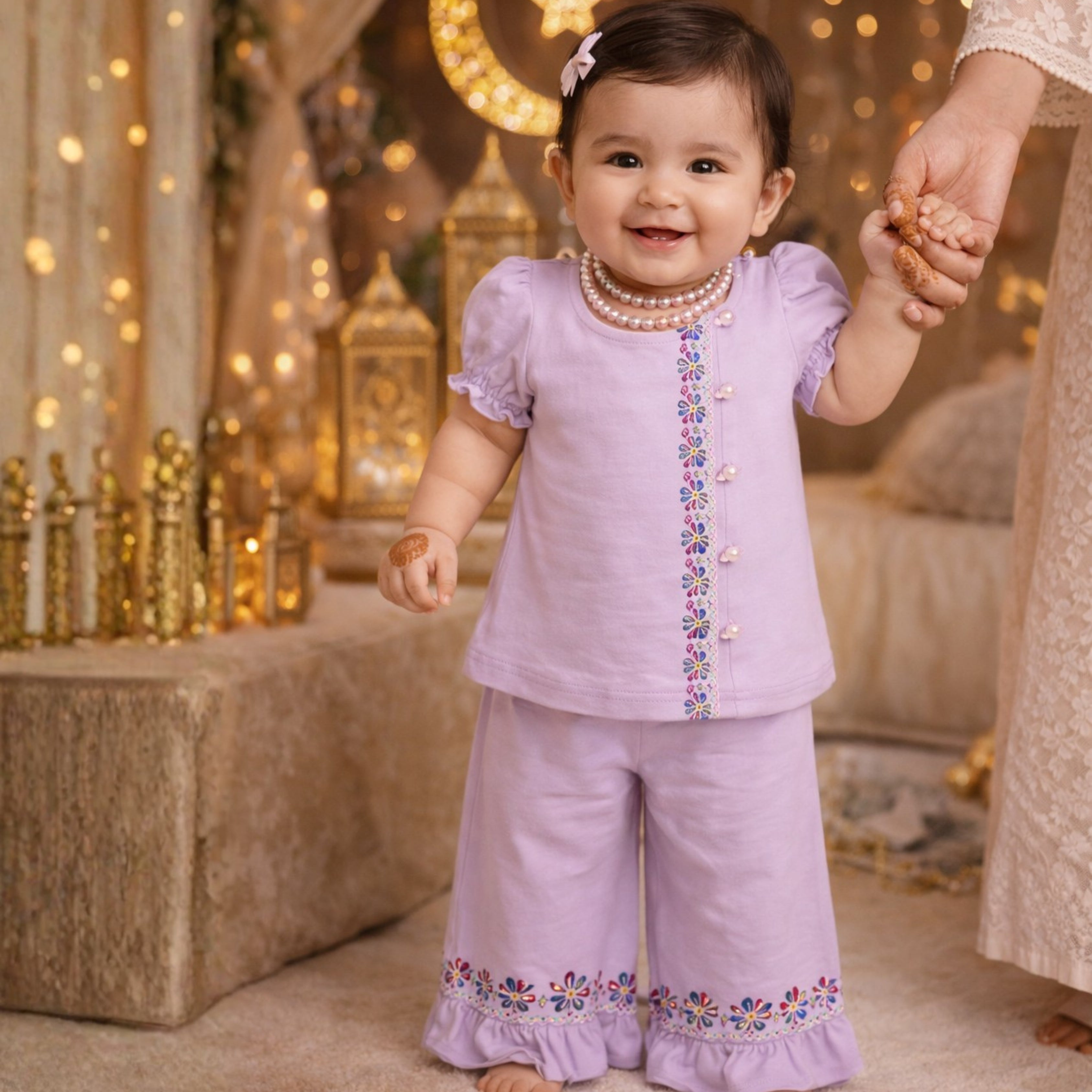 Perfect for daytime Eid gatherings or cozy post-namaz cuddles, this 2-piece outfit blends elegance with wearability — made using 100% soft cotton to keep your baby cool and comfy all day long.