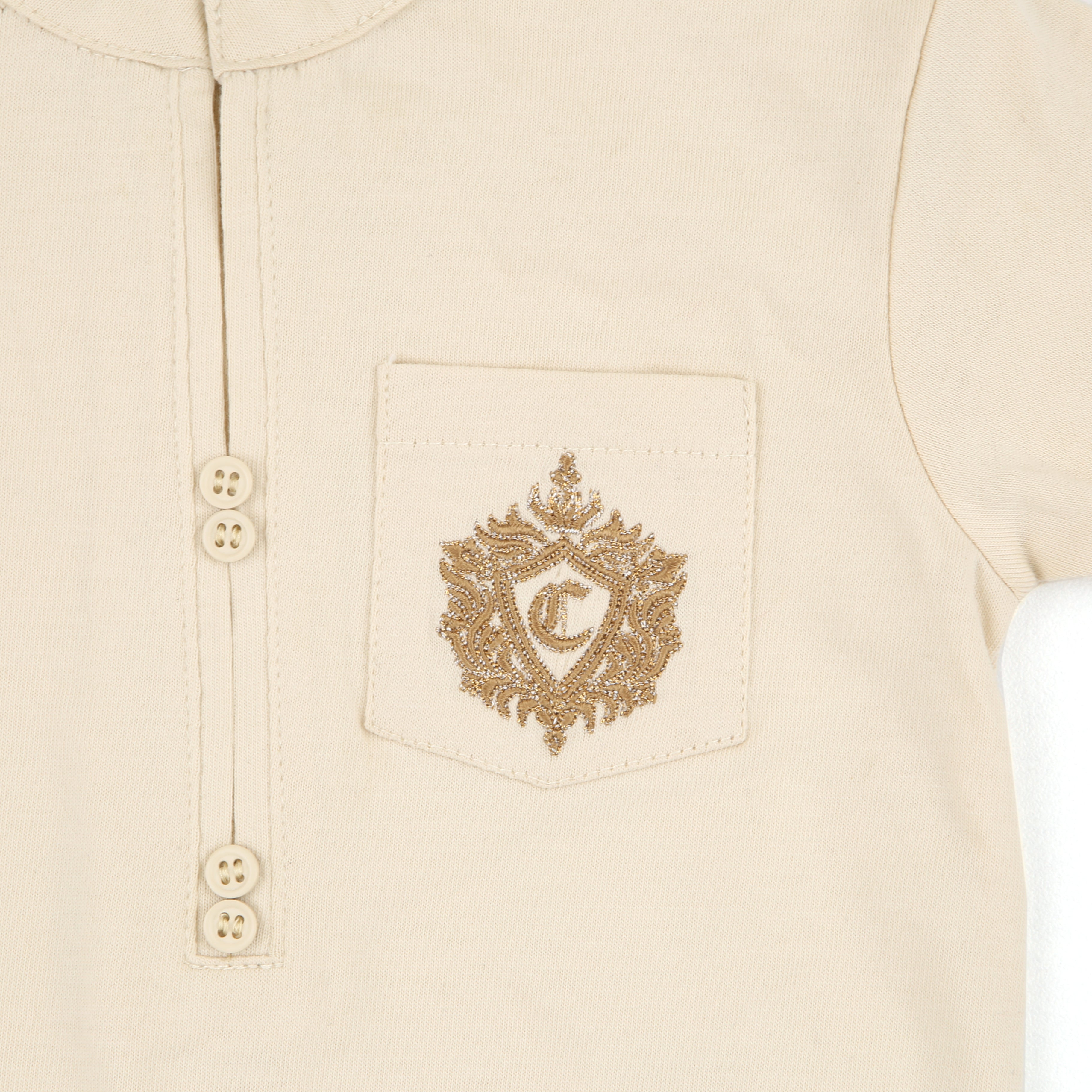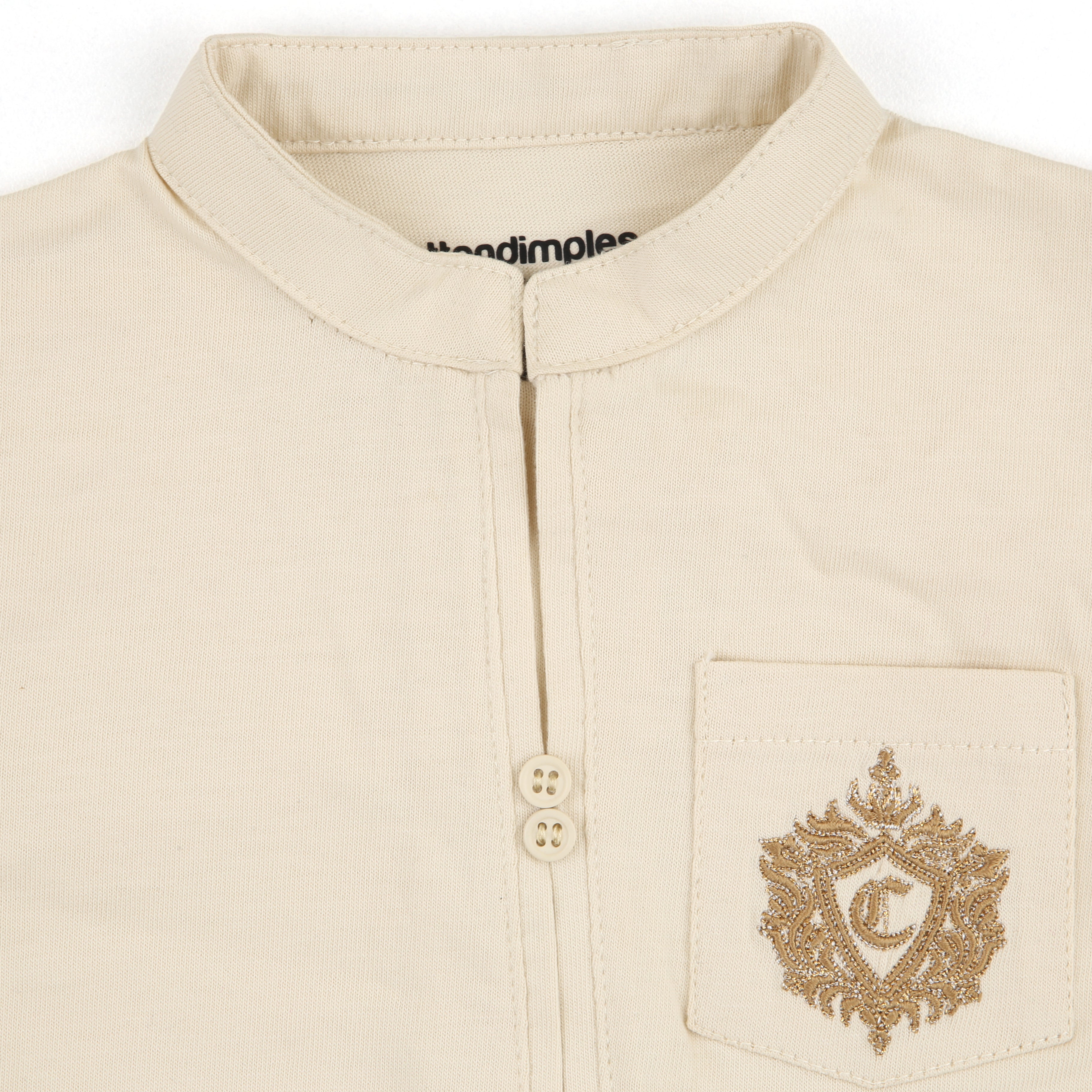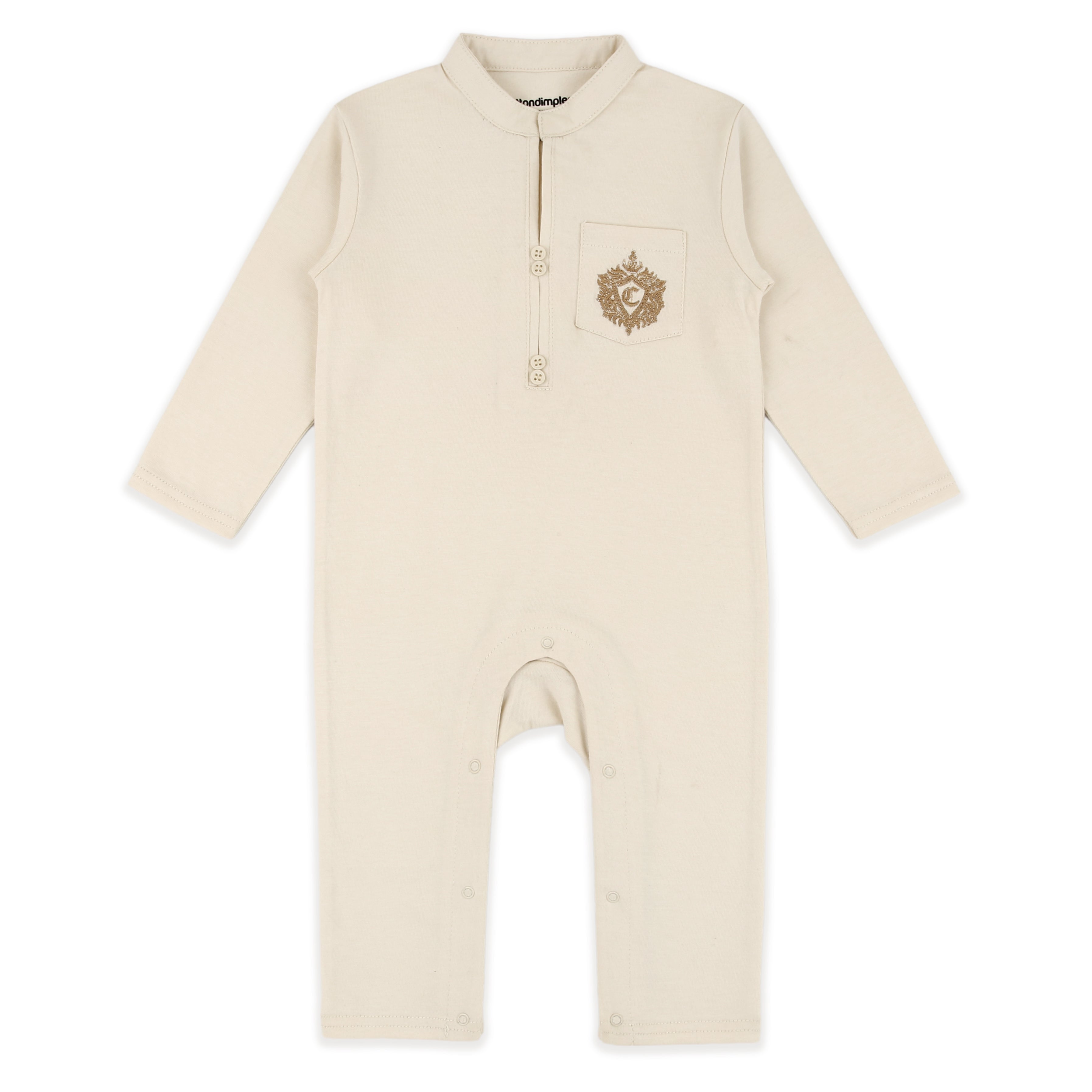 Minimal yet majestic, the Jahangir Romper Set is a sophisticated choice for your little emperor this Eid. Crafted in a soft cream tone, this romper features a stand collar, wooden-style buttons, and a crest-style gold emblem embroidered over a chest pocket. It’s classic, classy, and irresistibly photogenic—perfect for festive moments and memory making.