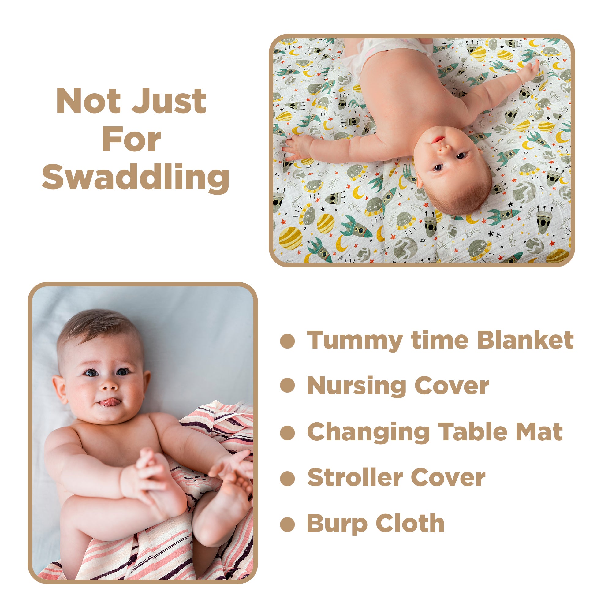 - Versatility: Besides swaddling, these can be used as nursing covers, burp cloths, playtime covers, changing mats or stroller covers.