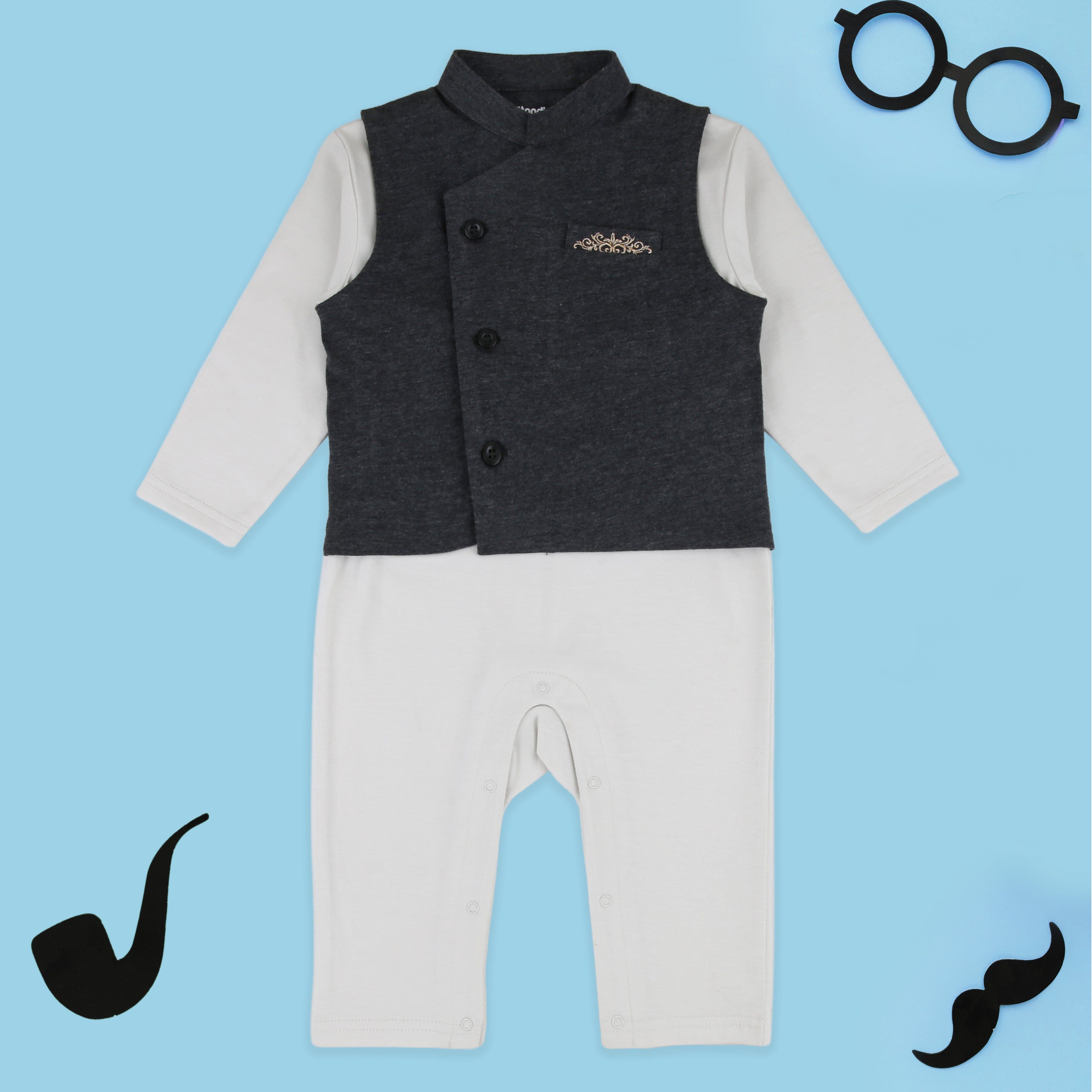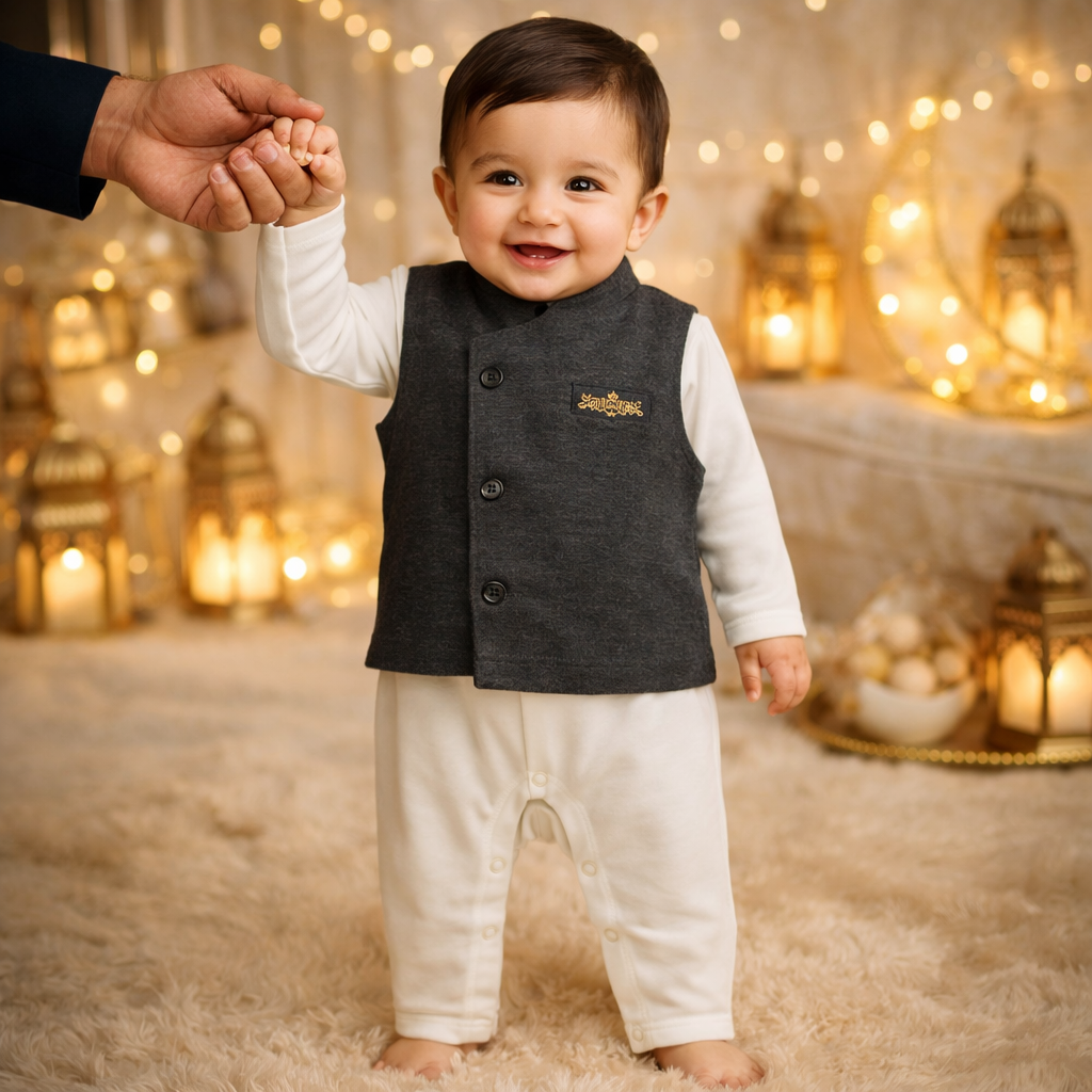 For the little one who deserves nothing short of royalty this Eid, our Nawab Sb Romper Set is an effortless two-piece outfit that blends sophistication with softness. This premium festive set includes: