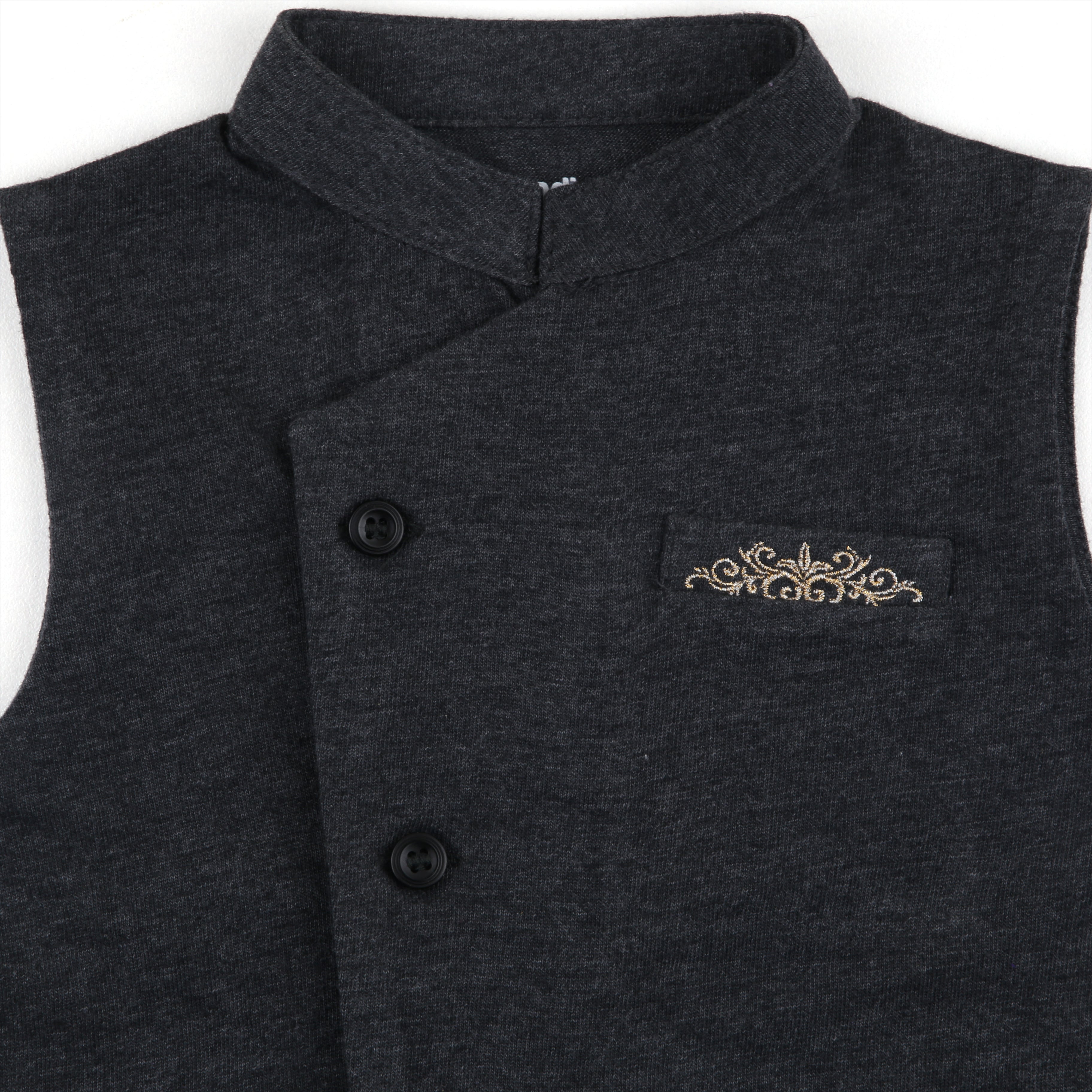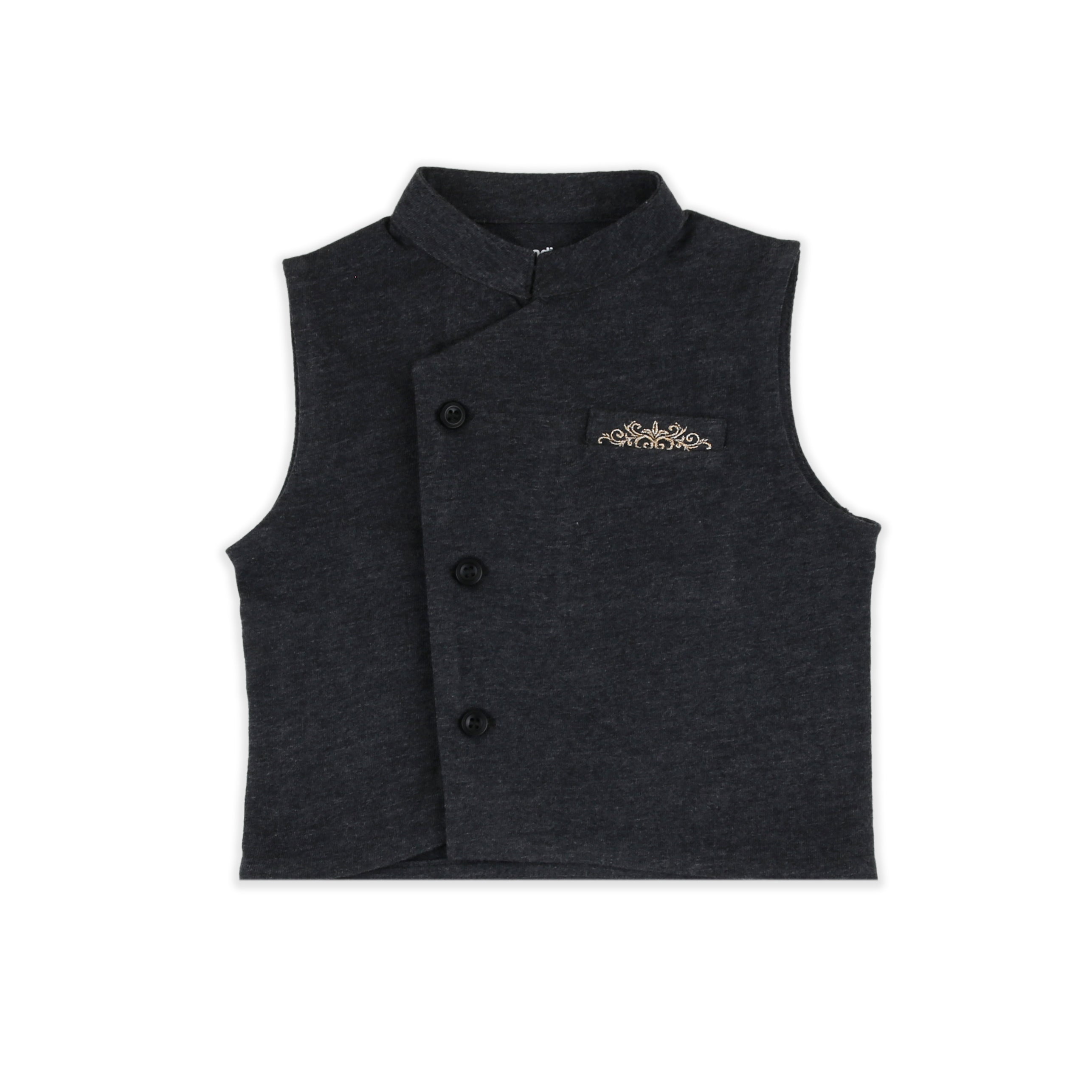 A deep charcoal sleeveless waistcoat with an asymmetrical button-down front