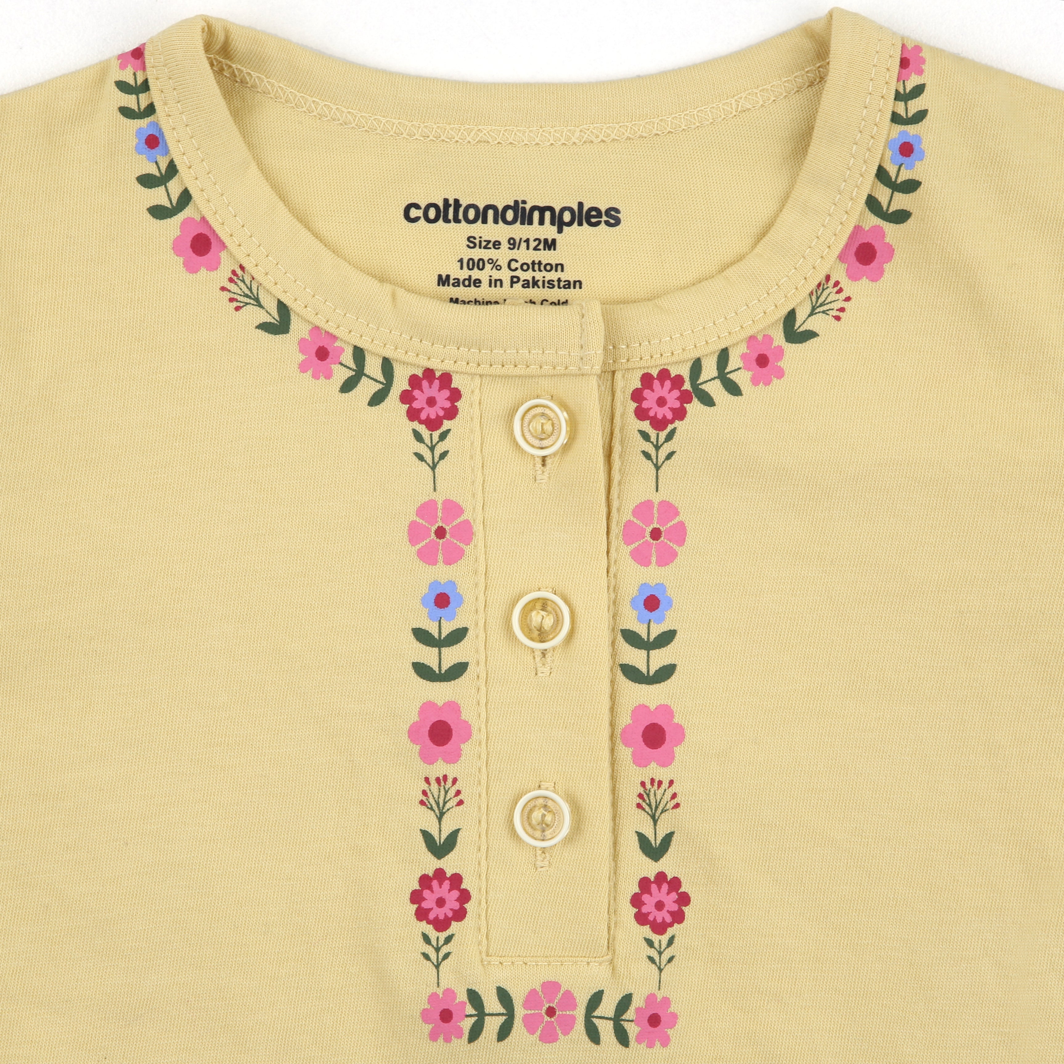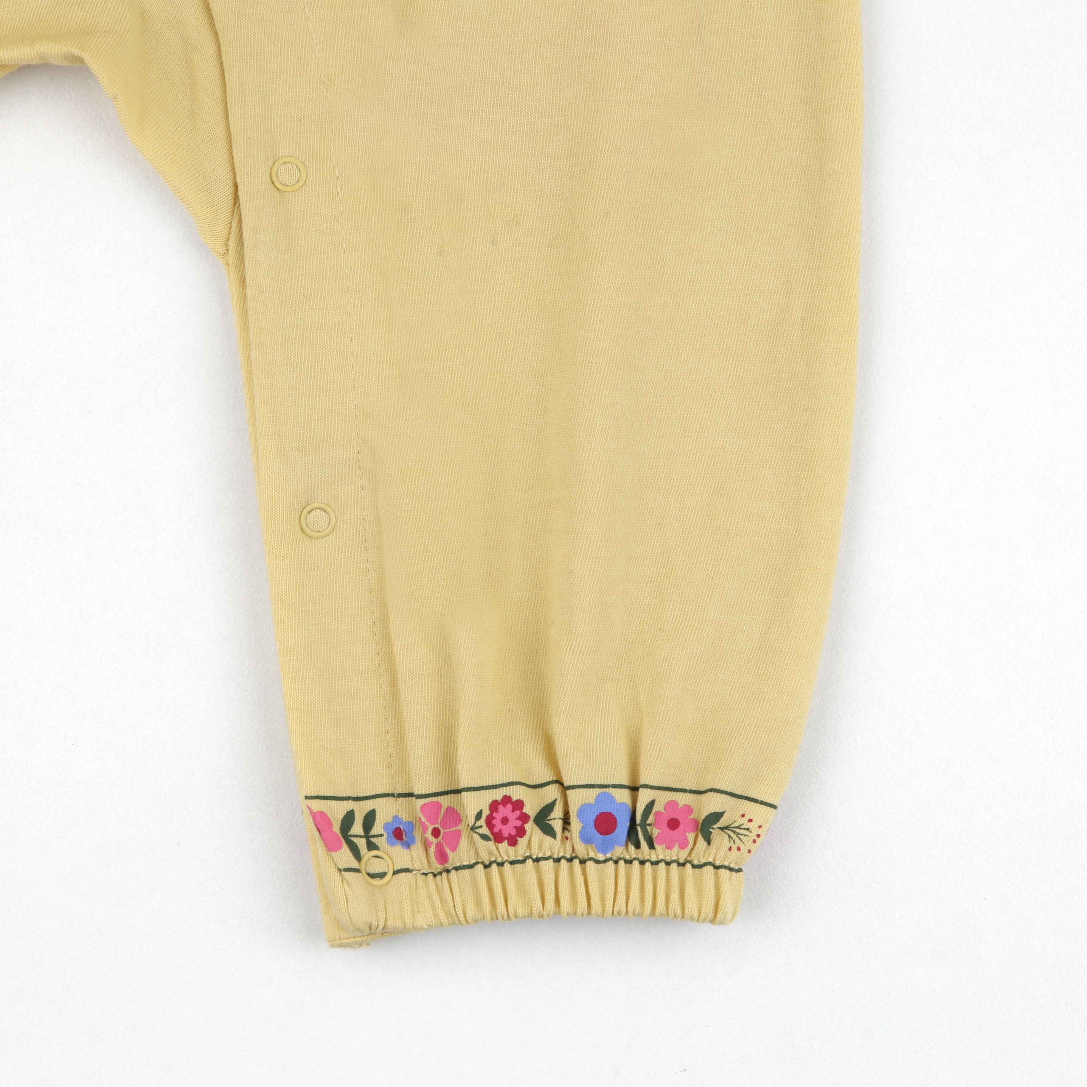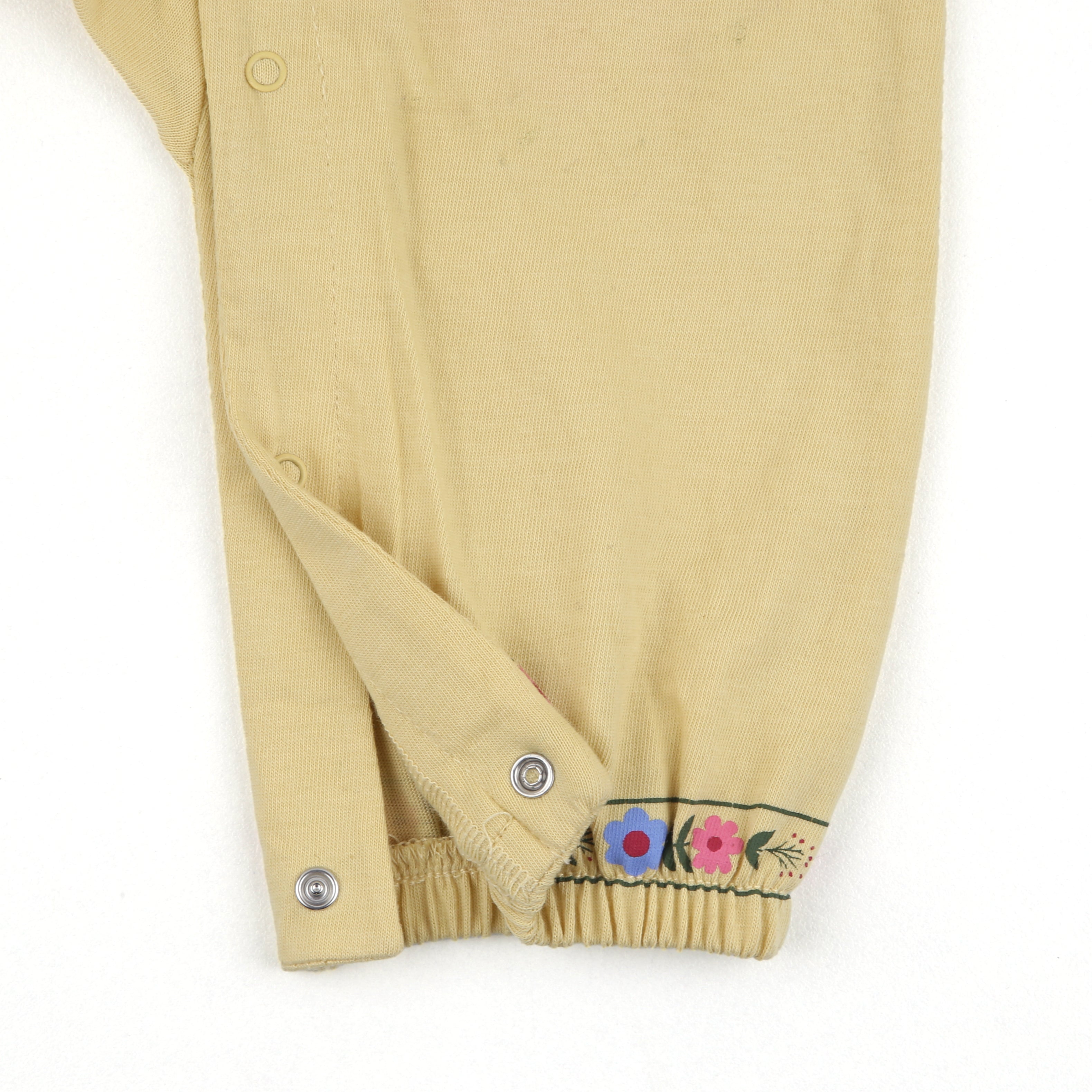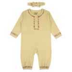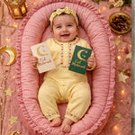 Let your little one shine this Eid in the Noor – Kurta Romper, a soft pastel yellow romper adorned with delicate multicolored floral prints and classic kurta-style buttons. Designed for babies aged 0 to 18 months, this romper celebrates festive elegance while ensuring everyday comfort. The sleeves and cuffs feature charming traditional motifs, and it comes with a matching fabric headband to complete the look.
