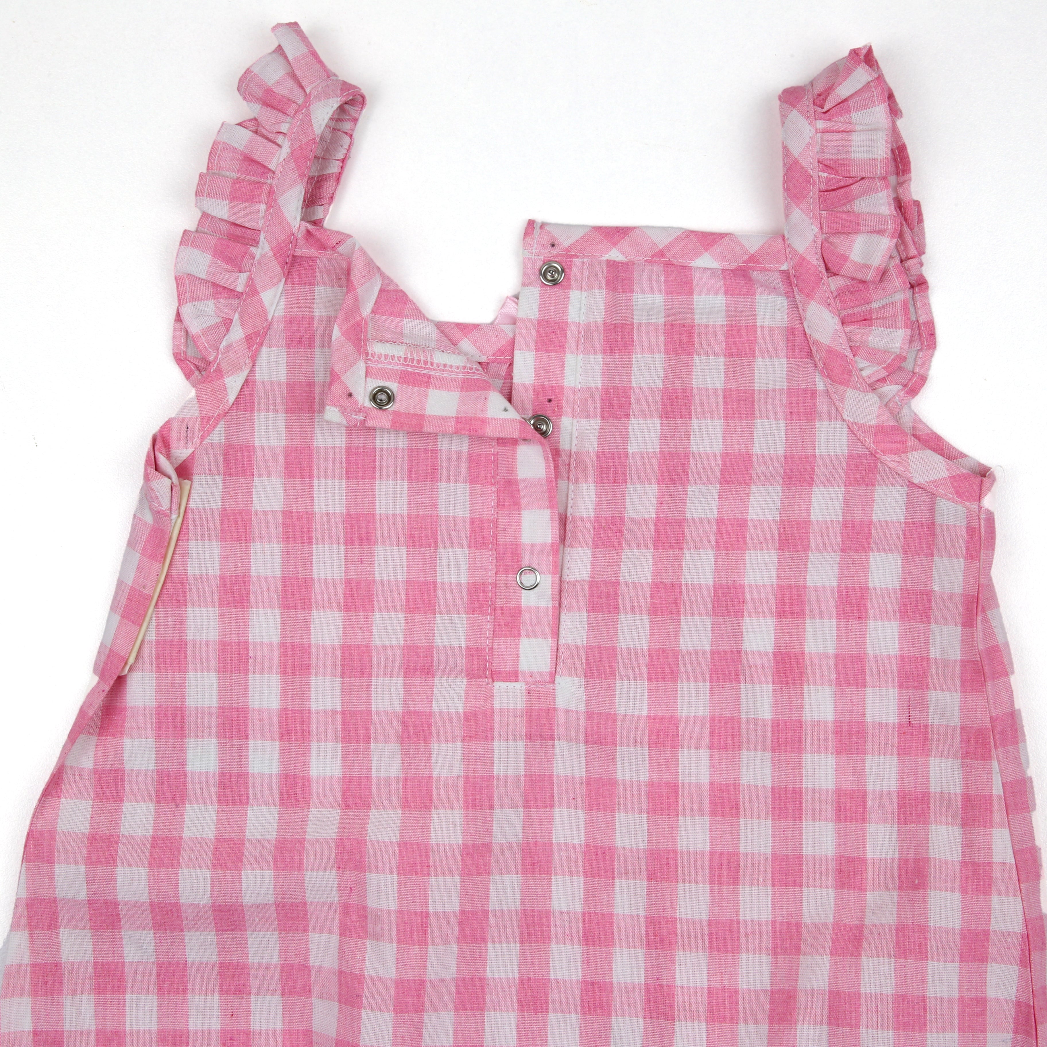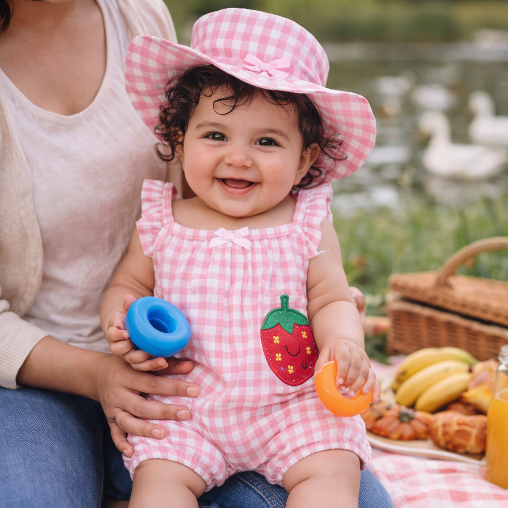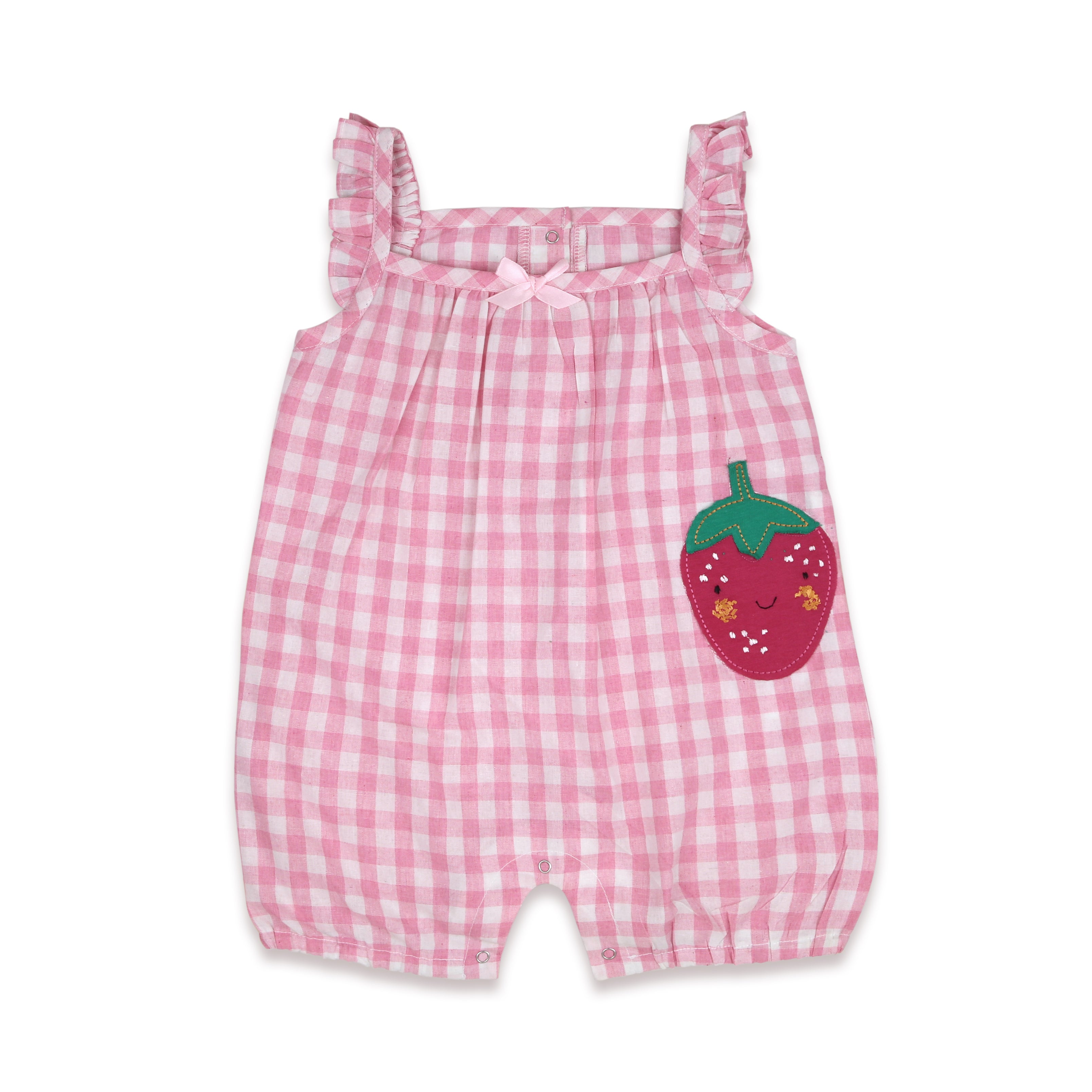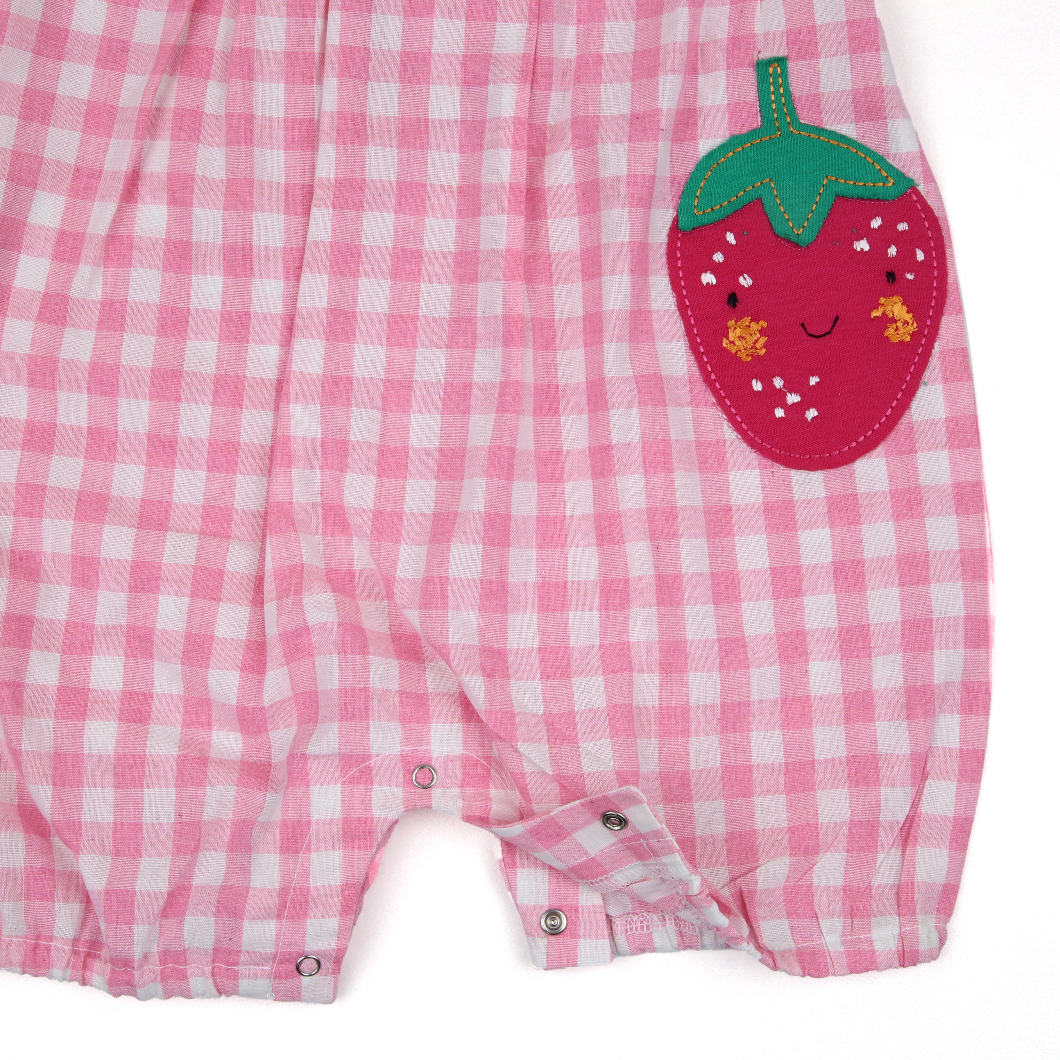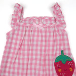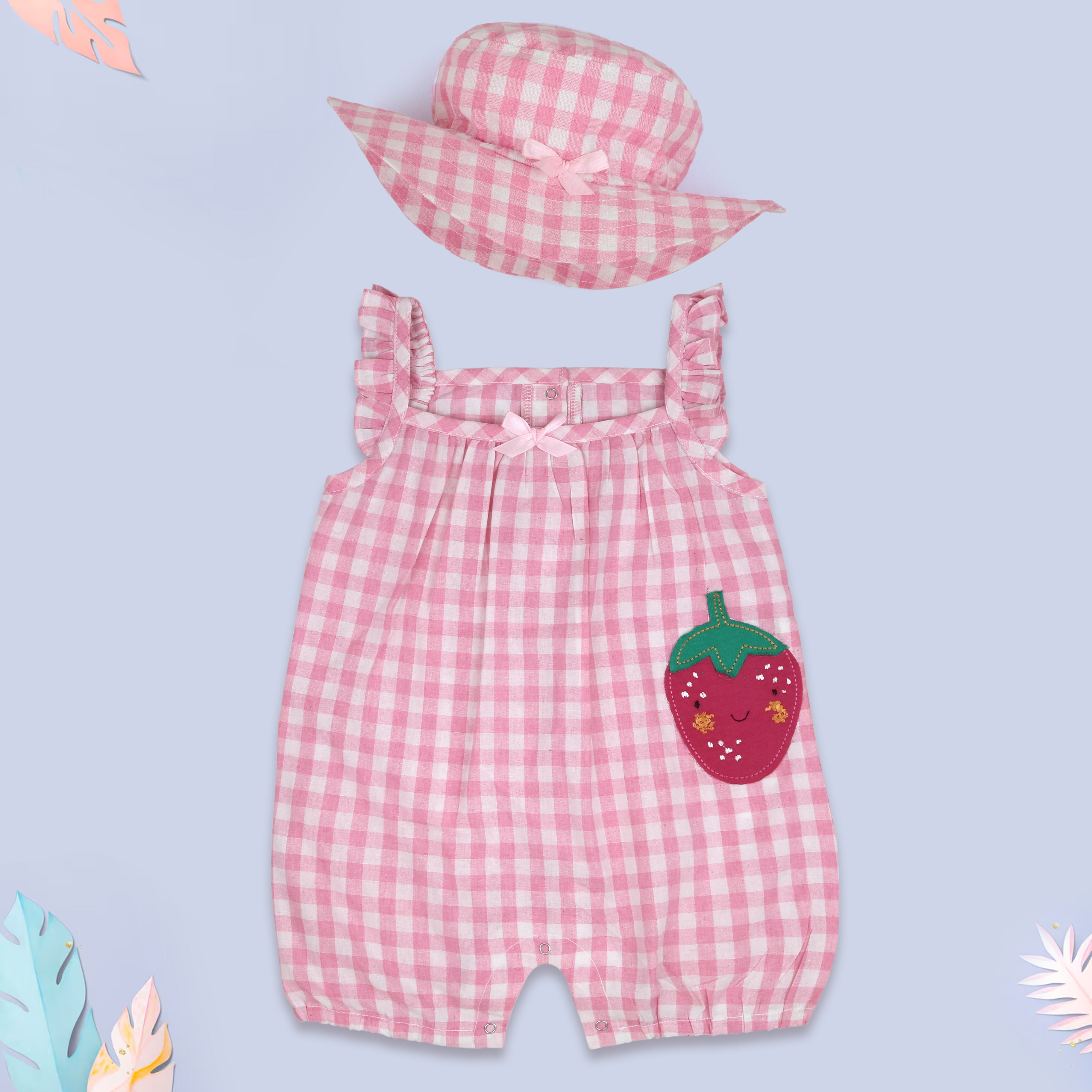 Sweeten up summer with this strawberry-licious romper set! Crafted from airy woven cotton in a delightful pink gingham pattern, this romper is perfect for hot sunny days. It features ruffle straps, a little pink bow, and a cute embroidered strawberry patch for added charm. The matching sunhat is finished with lace trimming and a fabric bow—keeping your baby both shaded and stylish.