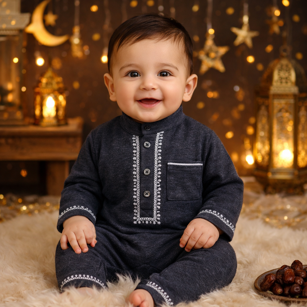 This Eid, dress your little prince in timeless grace with the Shahjahan Kurta Romper – a seamless blend of regal Eastern tradition and baby-friendly comfort.