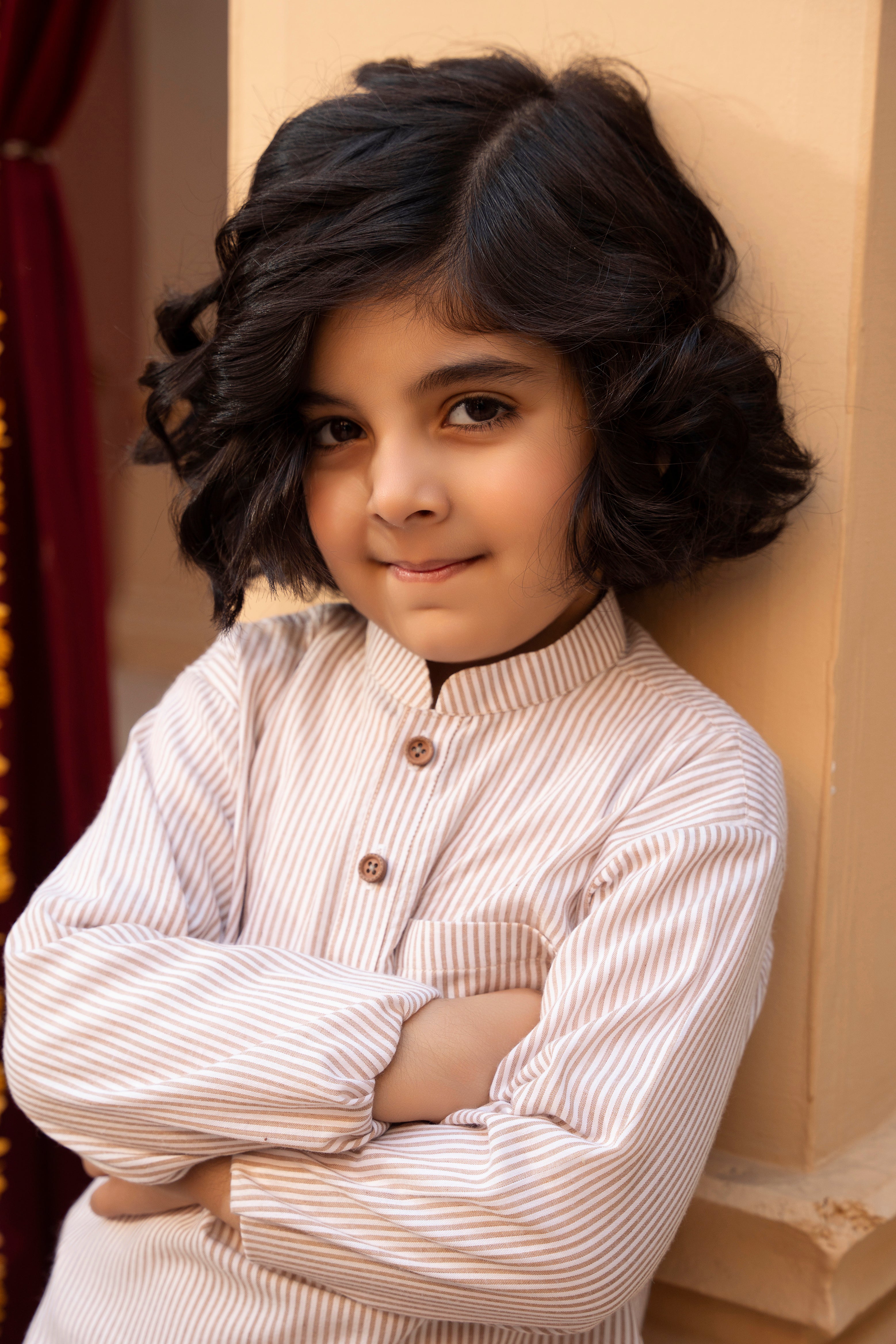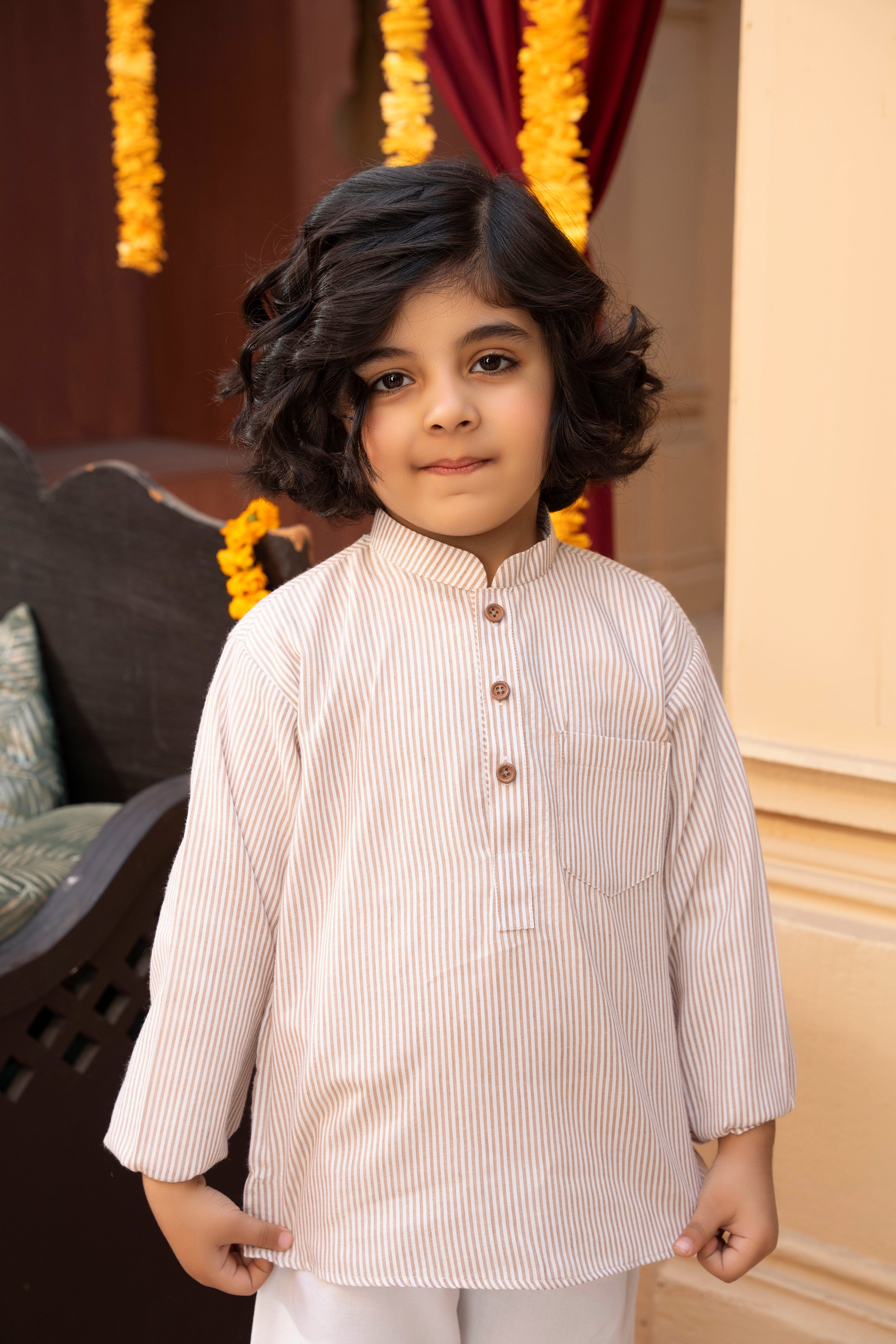 This charming tunic set is perfect for keeping your toddler cool and stylish during the warmer months. Crafted from lightweight cambric fabric, the tunic features a beautiful cinnamon-colored striped pattern that adds a touch of warmth and character to the outfit.