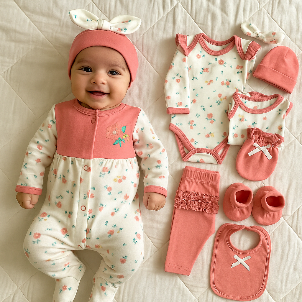 - Set includes, 1 footed romper, 1 onesie, 1 bottom, 1 cap, 1 bib, 1 headband, 1 pair of mittens and 1 pair of booties and two wash cloths