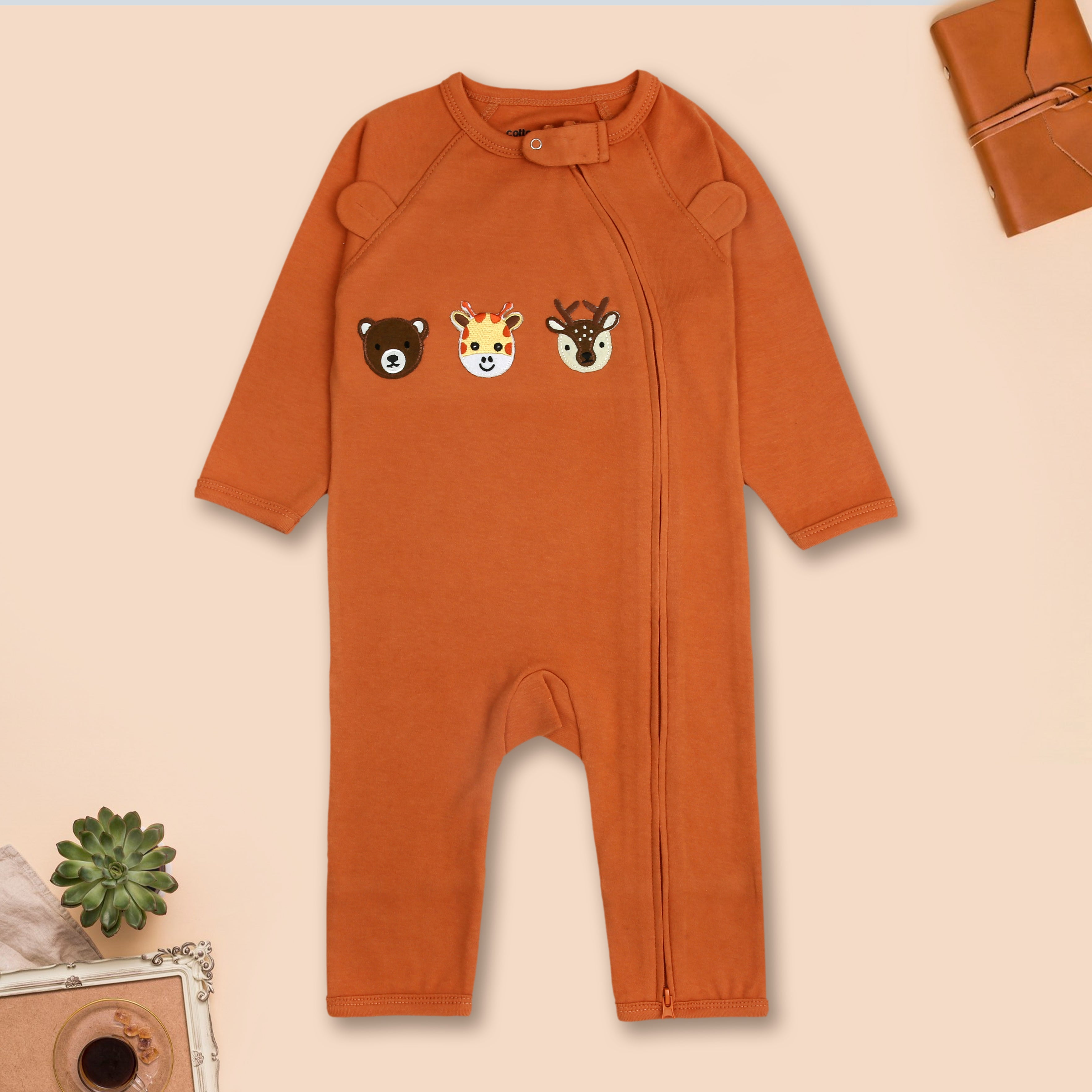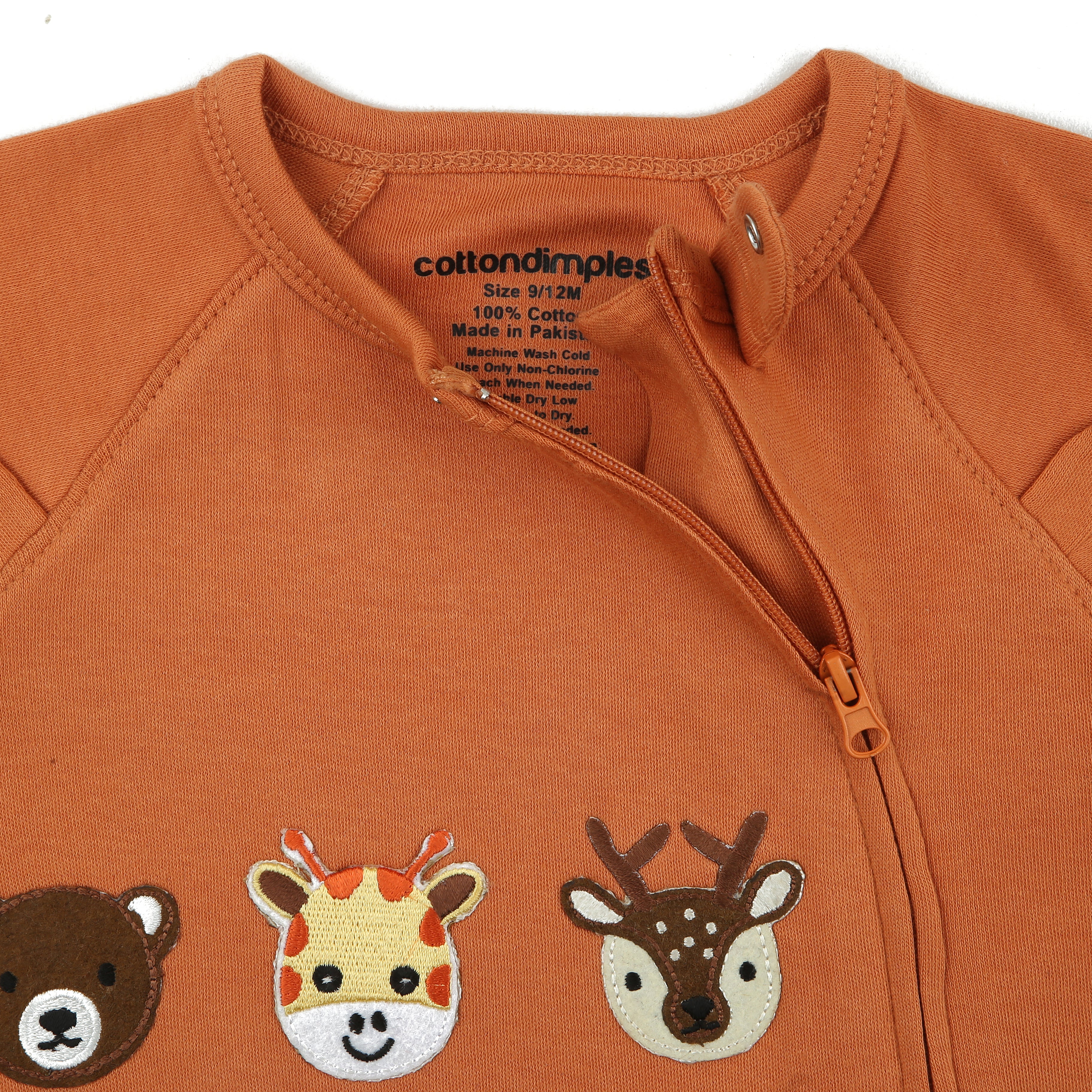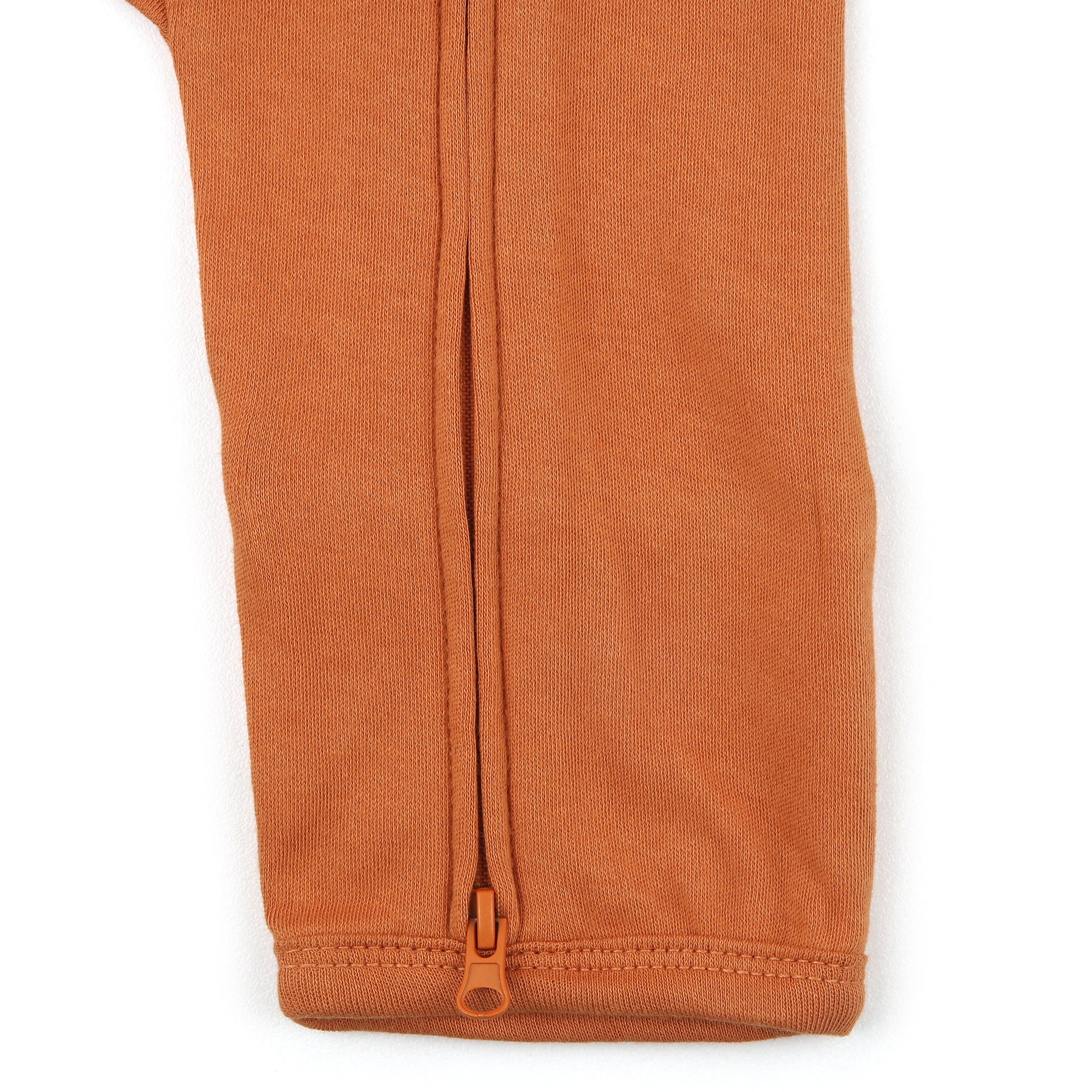 This adorable burnt - amber colored footless romper for infants is made from 100% cotton interlock fabric, it stretches to fit your baby’s body, providing a soft and cozy feel. The romper features a two-way full zipper, making diaper changes quick and hassle-free, while the chin tab adds extra protection for your little one’s delicate skin.