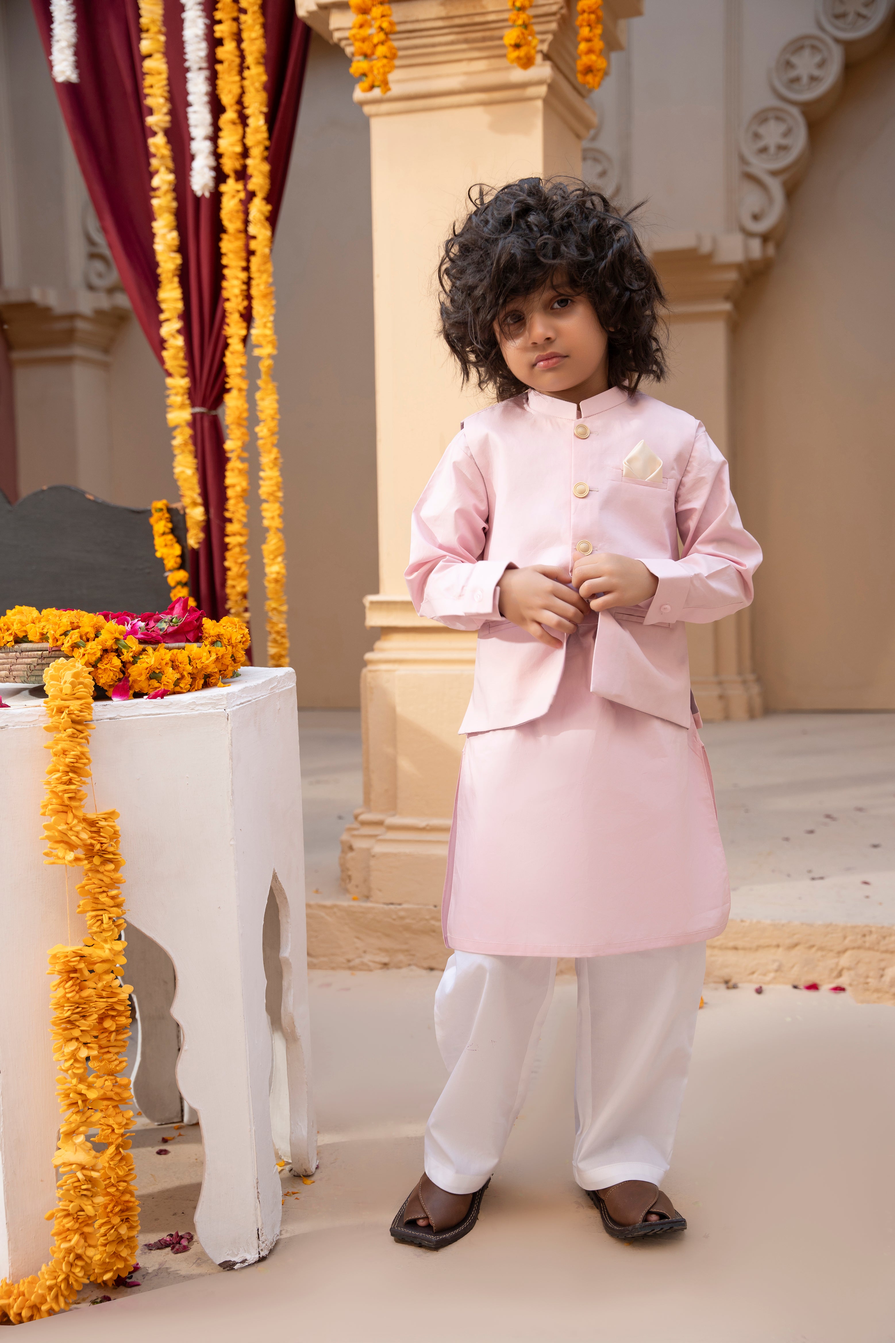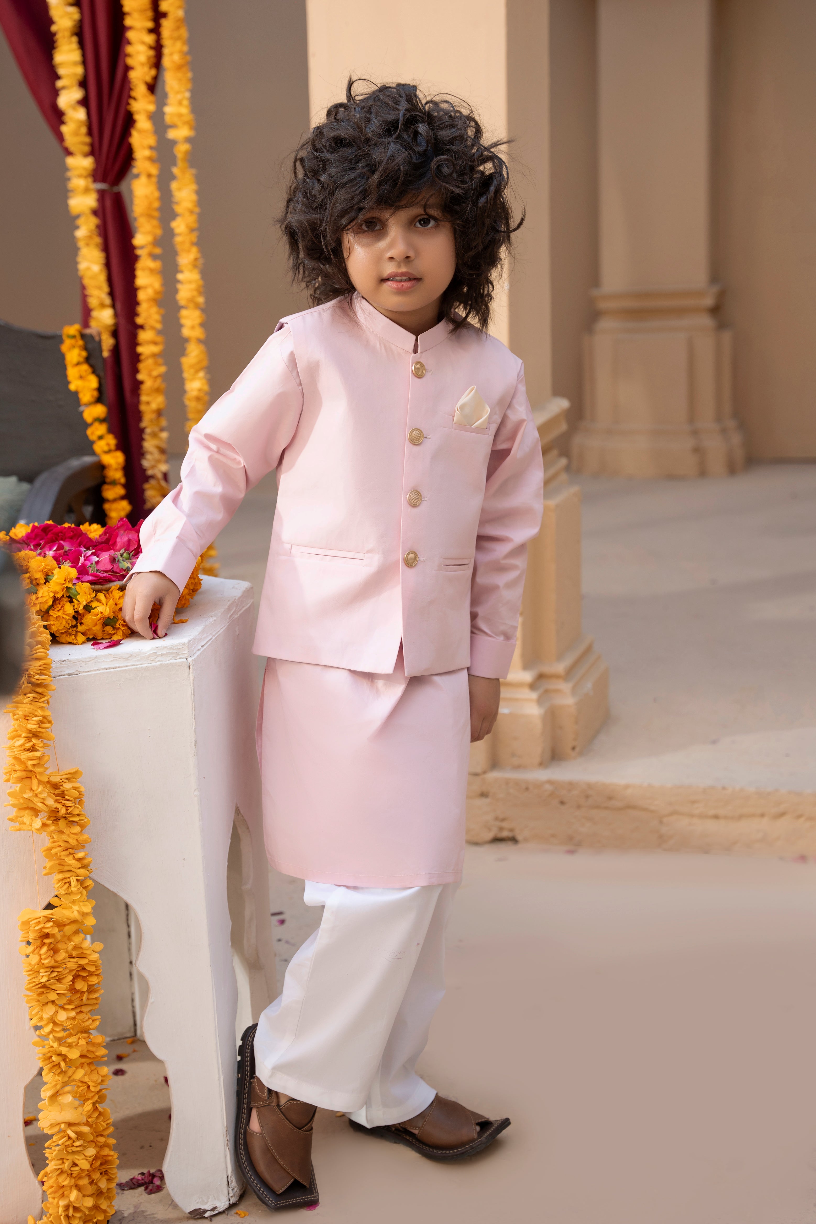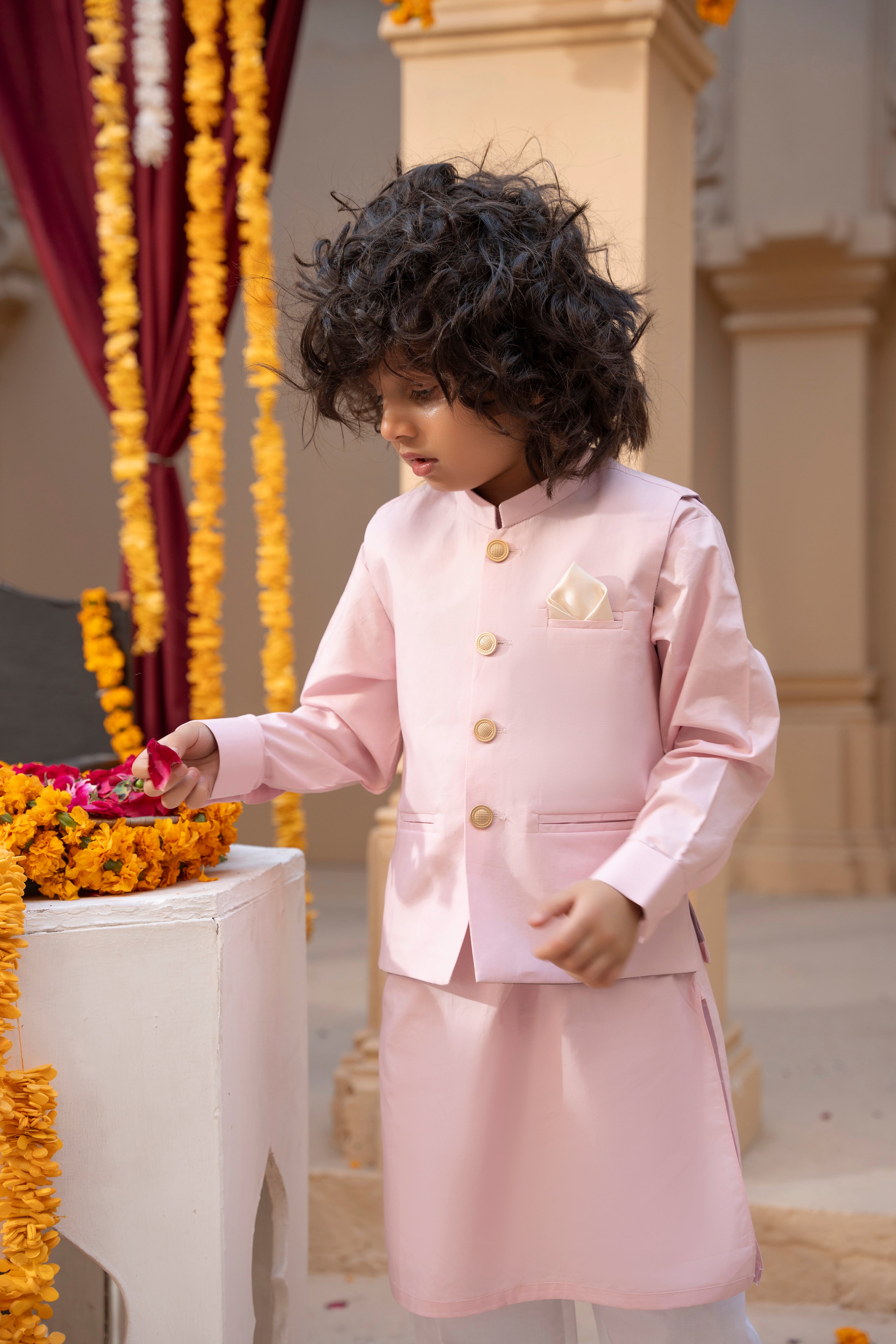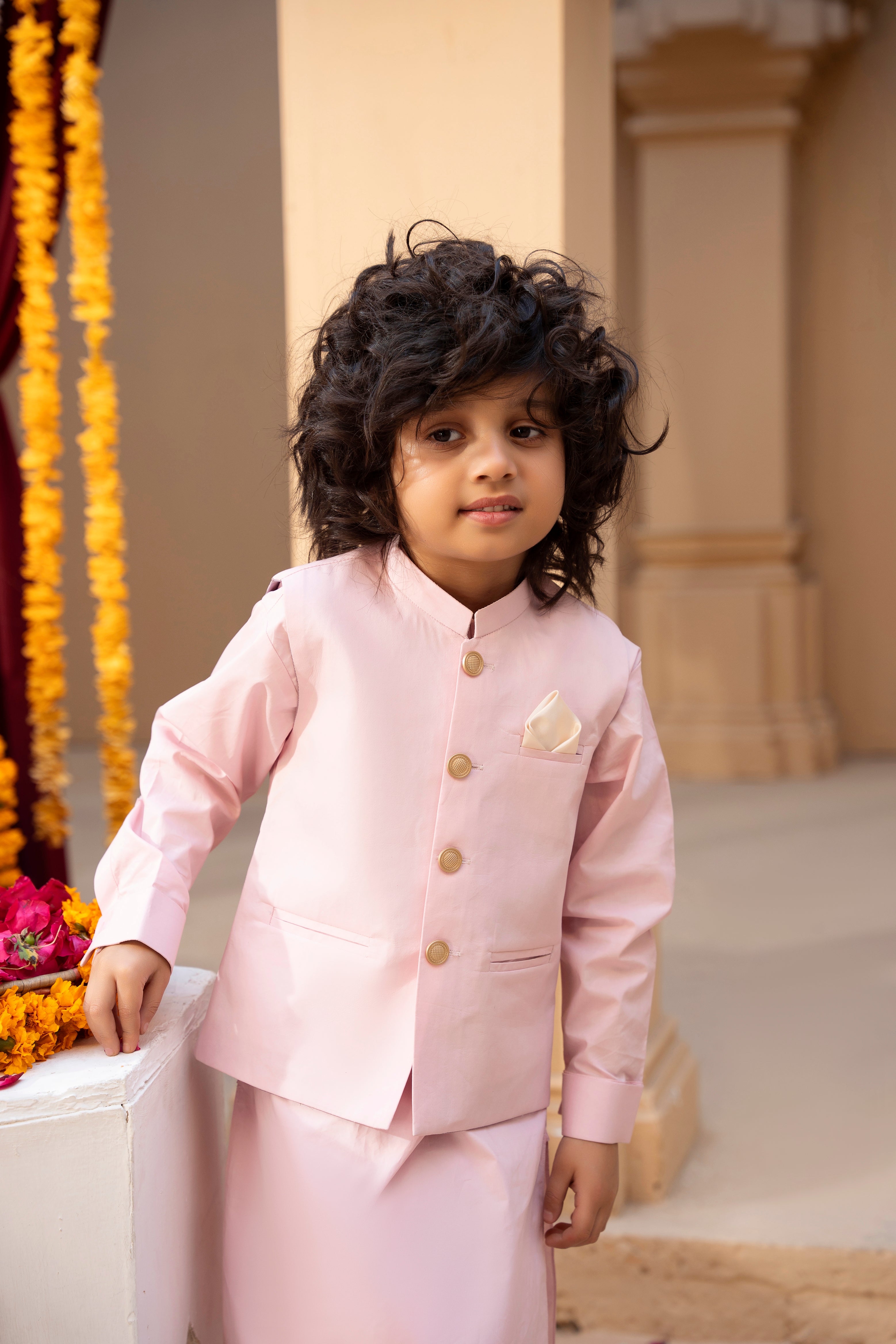 - Waistcoat details: Gold buttons and a cute pocket square for added sophistication