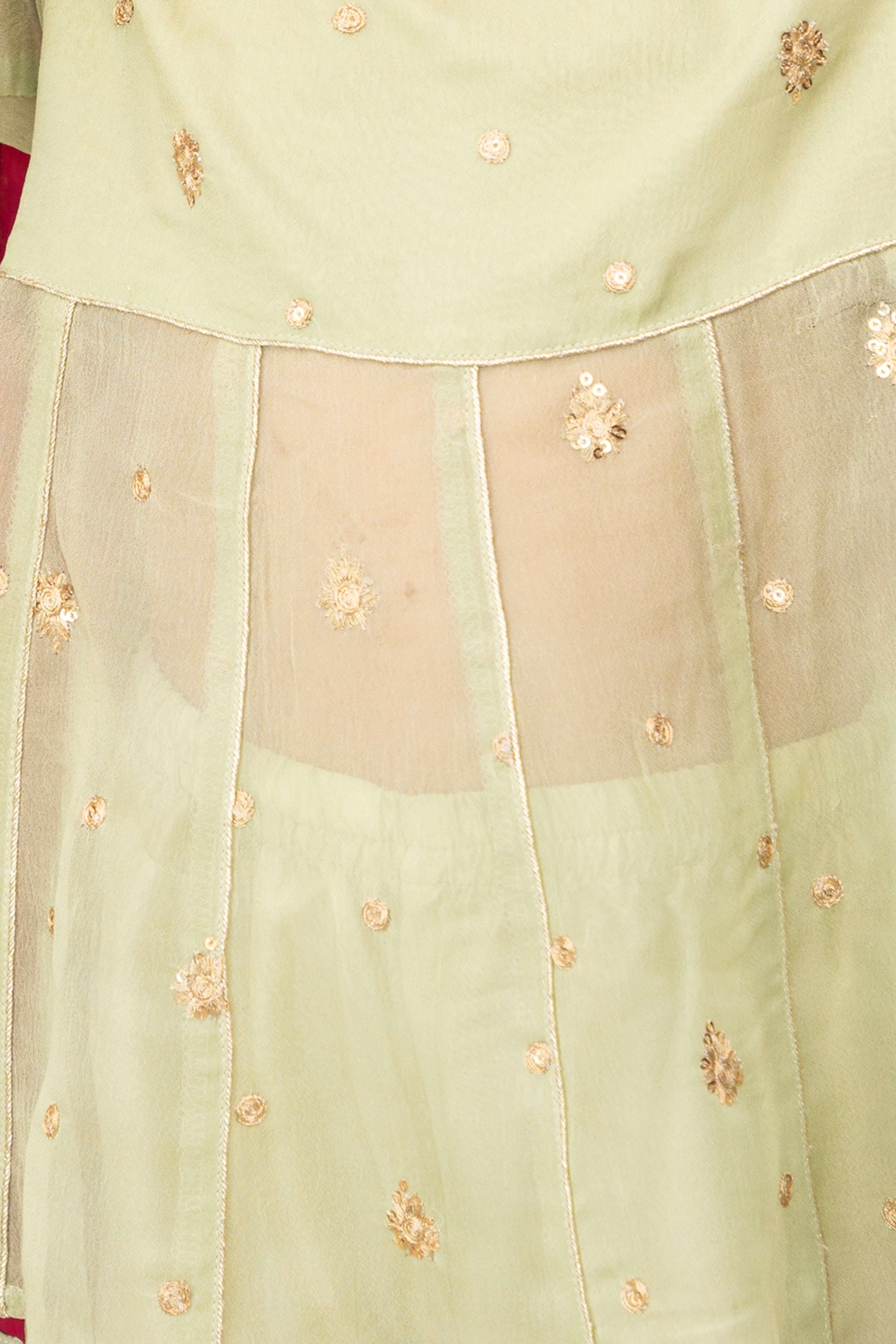 To complete this beautiful outfit, a contrasting chiffon dupatta is included, adding an ethereal touch and a burst of color that ties the entire look together, creating a visually stunning and coordinated ensemble.