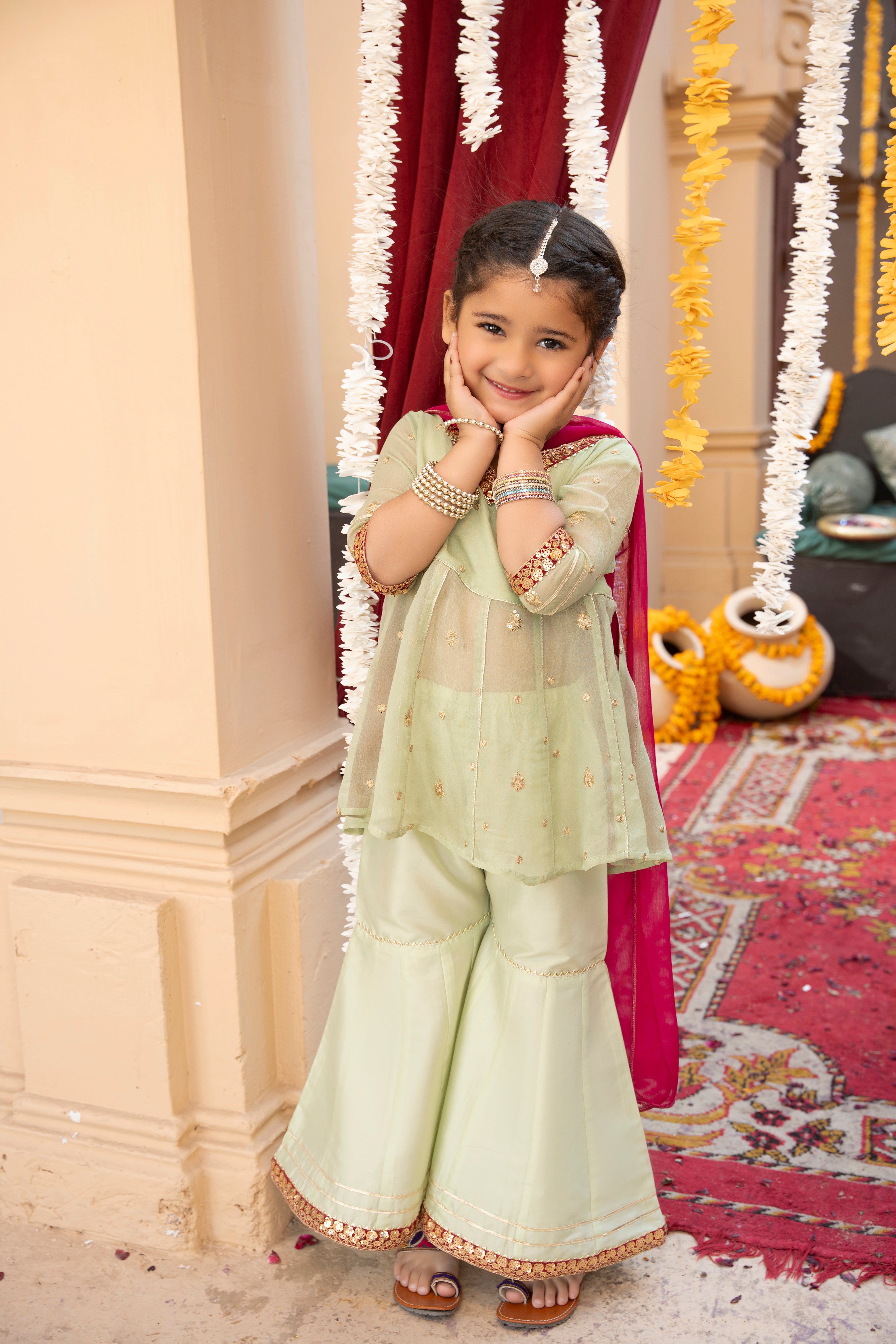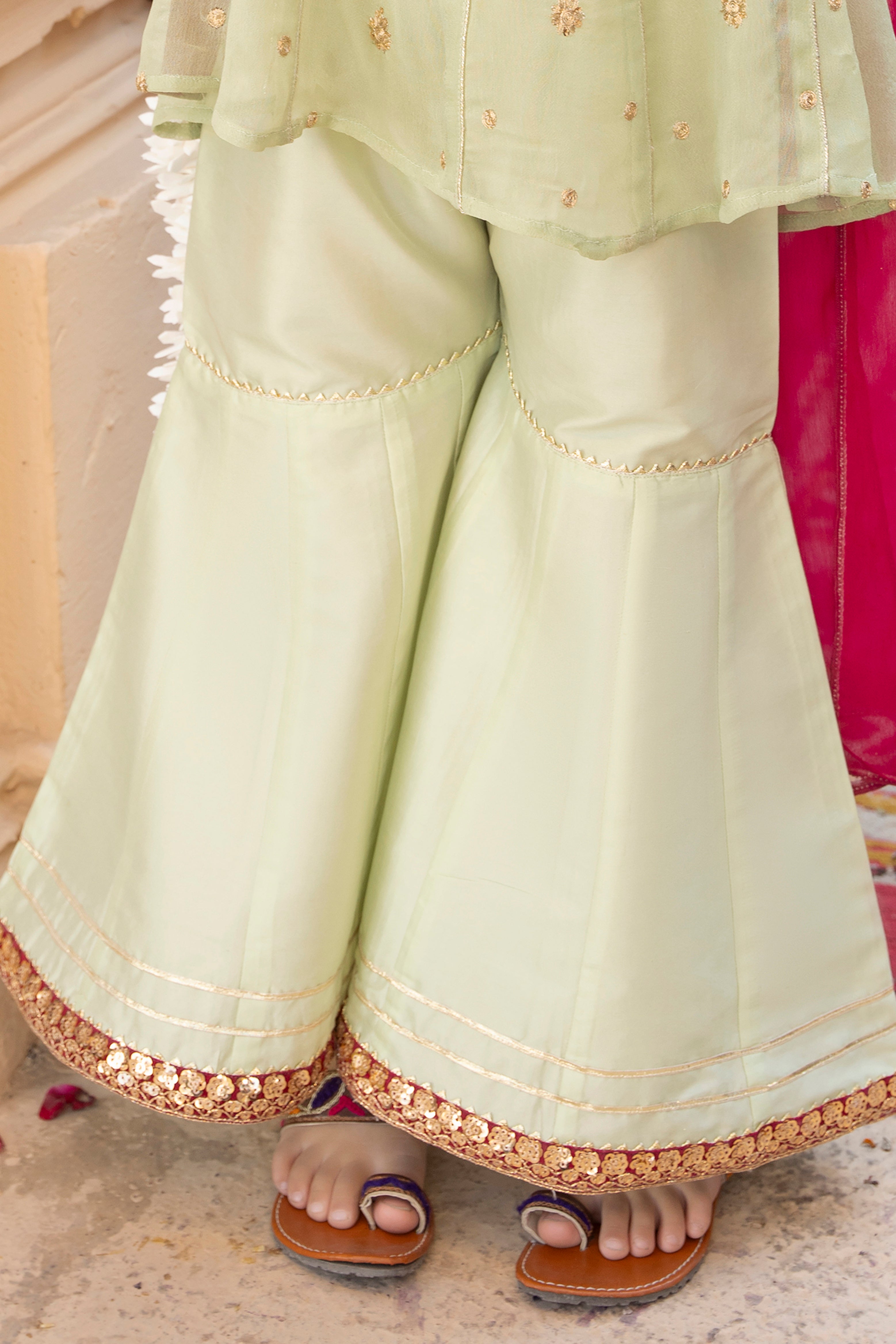 The panel gharara is crafted from smooth cotton silk, offering a luxurious feel and a perfect flow for twirling. It features a straight fit design with panels that create a graceful, flattering silhouette. The gharara is finished with contrasting laces along the edges, bringing in an elegant touch of detail that complements the shirt.