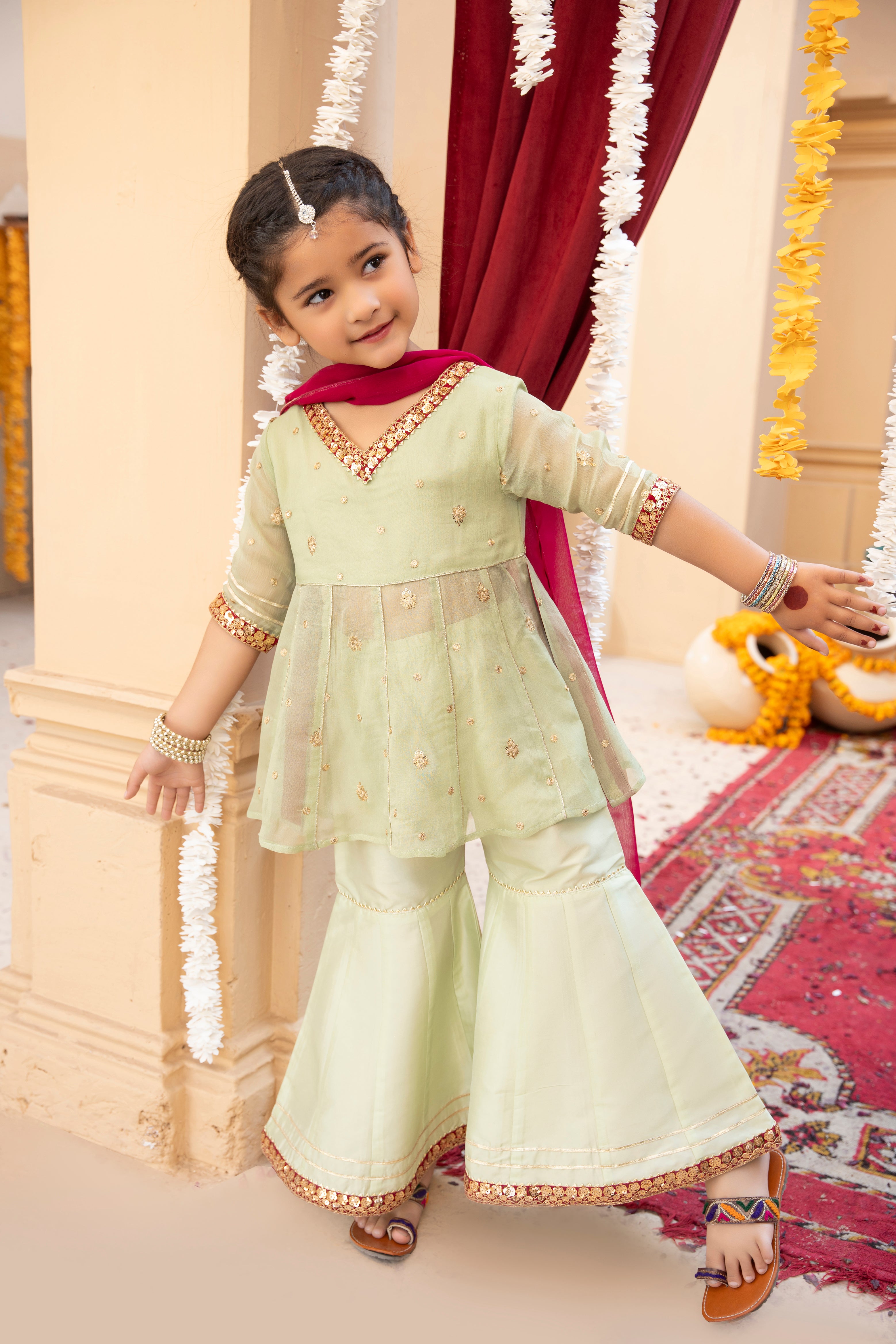 - 3-piece set: Side slit embroidered chiffon shirt, panel cotton silk gharara, and contrasting chiffon dupatta