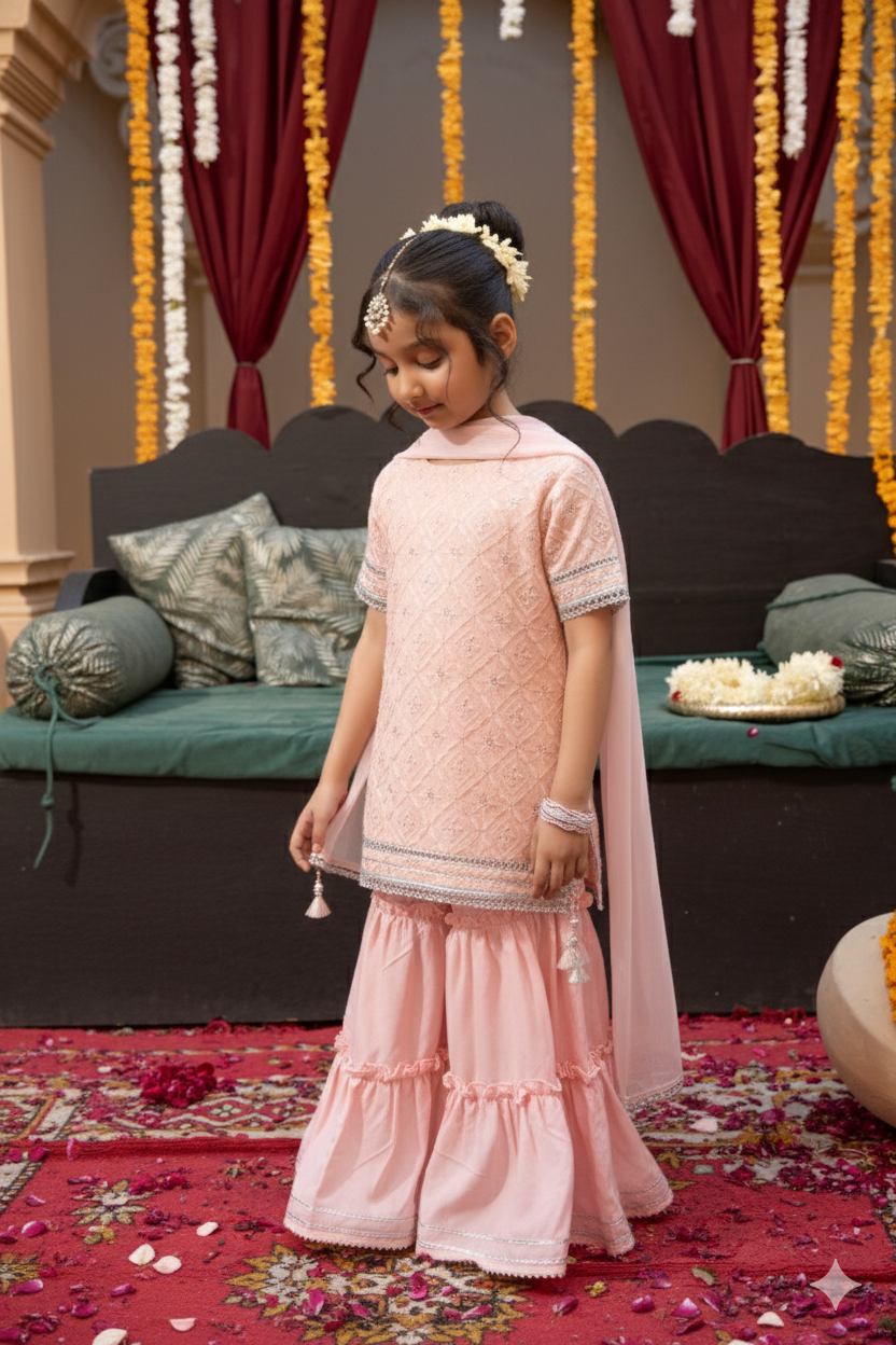 Let your toddler steal the spotlight with this beautifully crafted gharara set, designed to offer elegance, comfort, and a touch of timeless beauty.