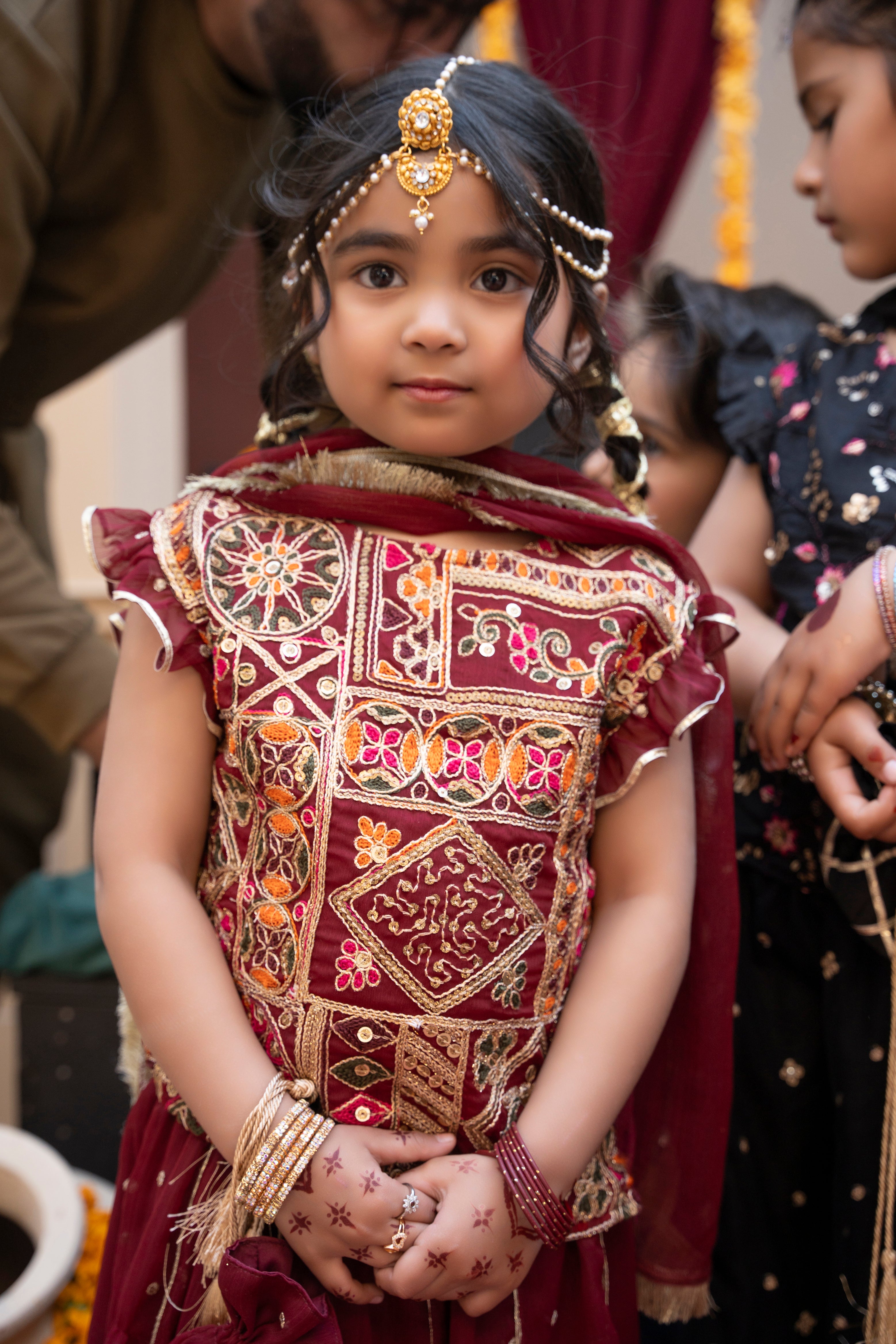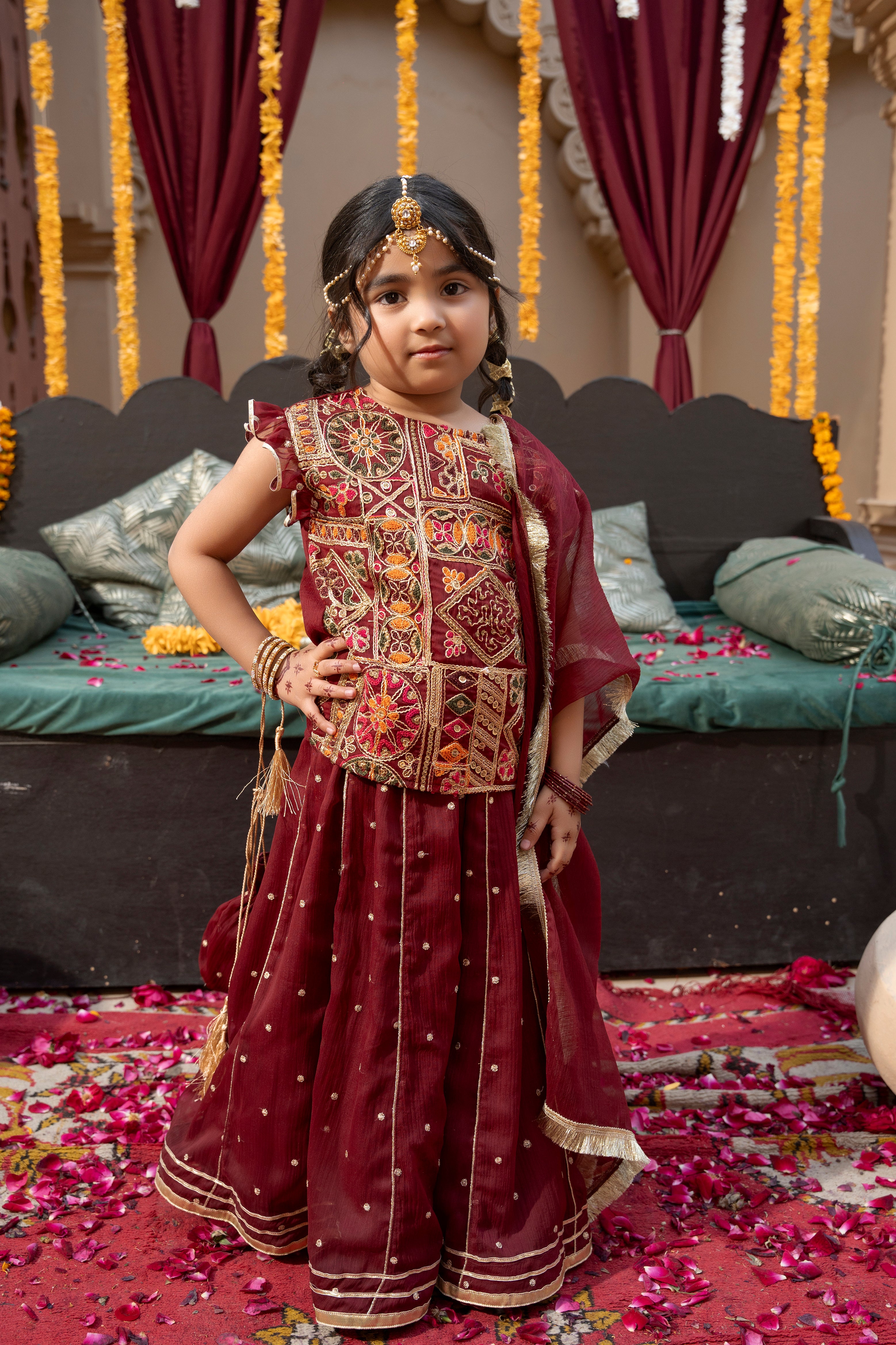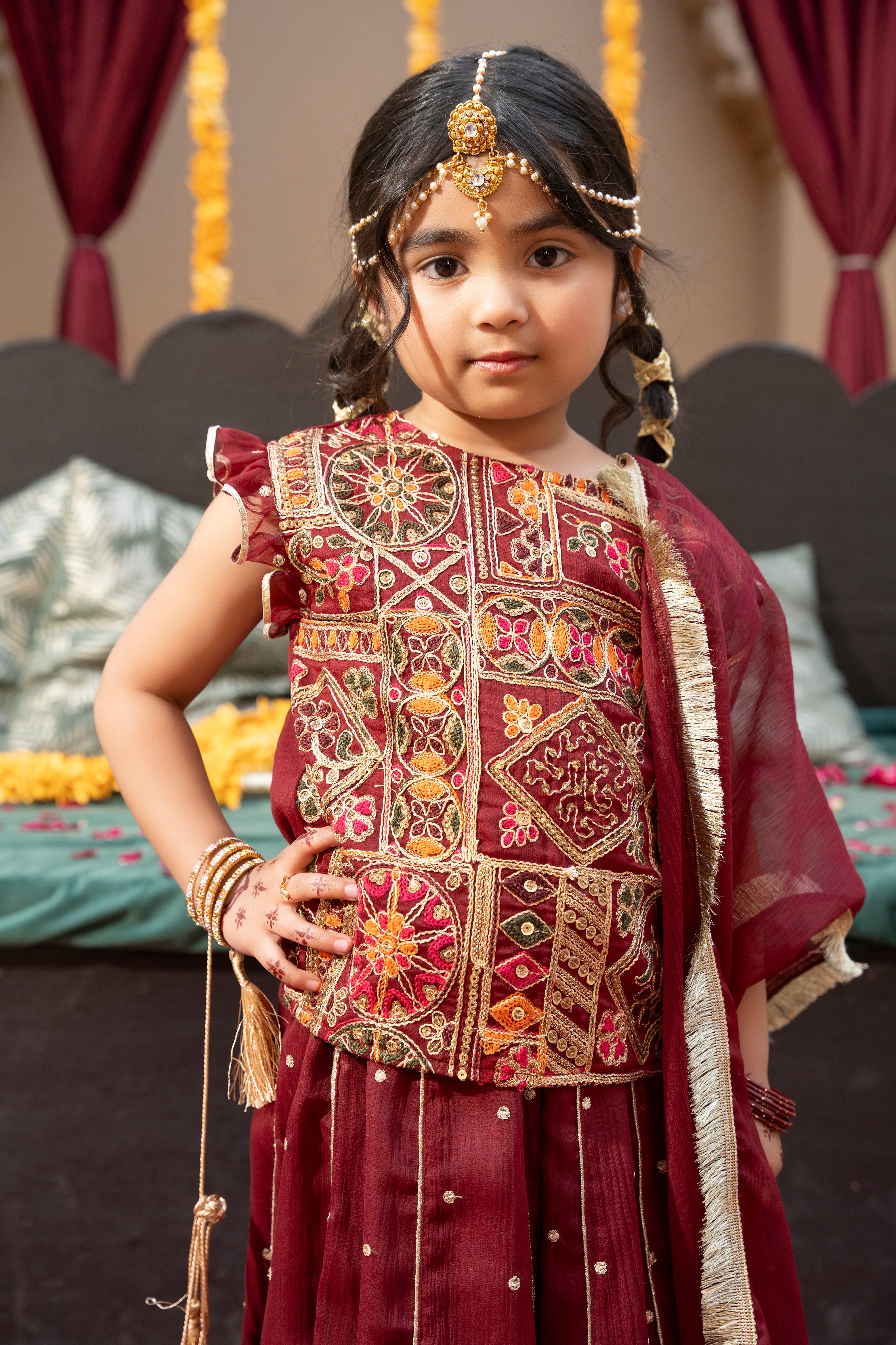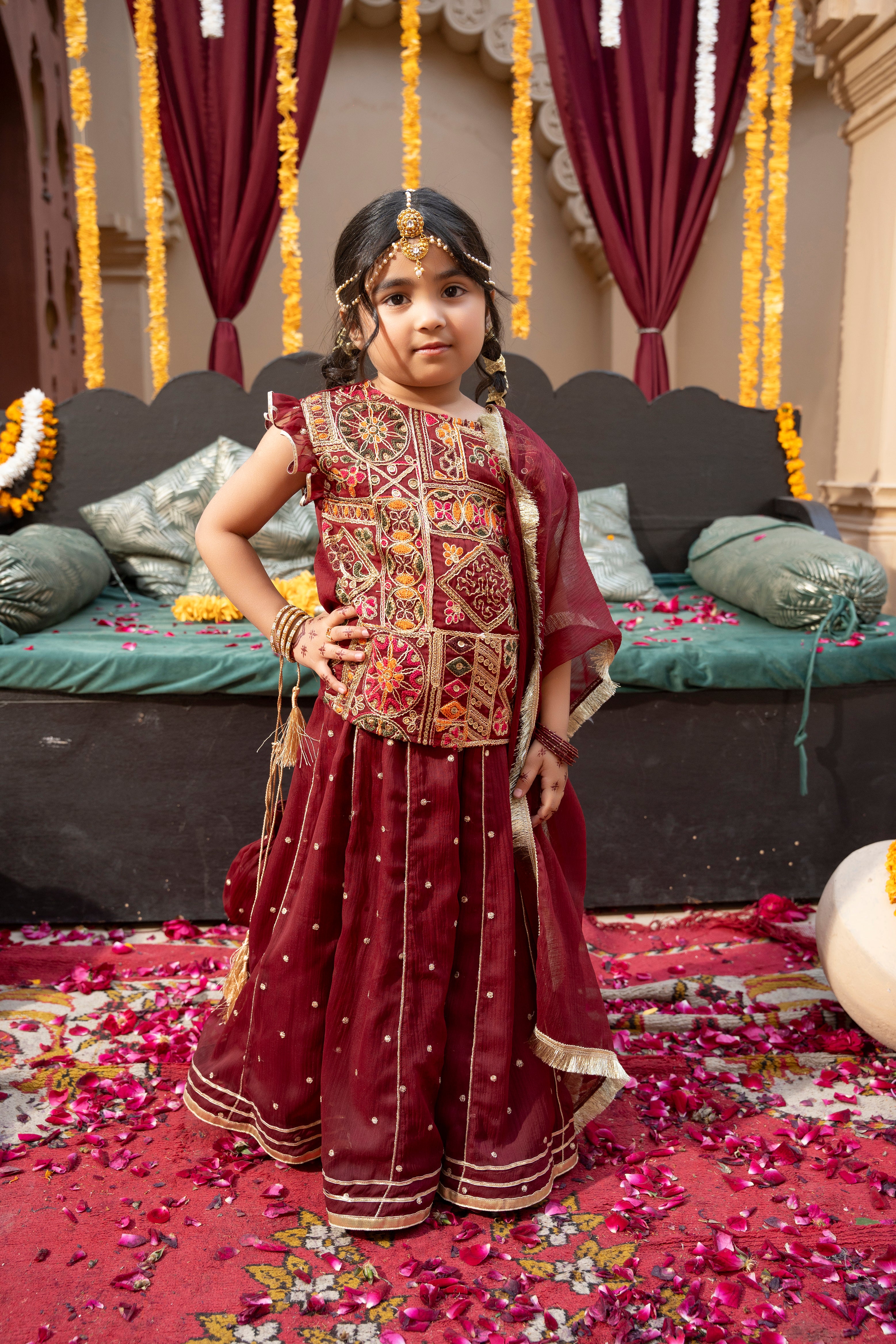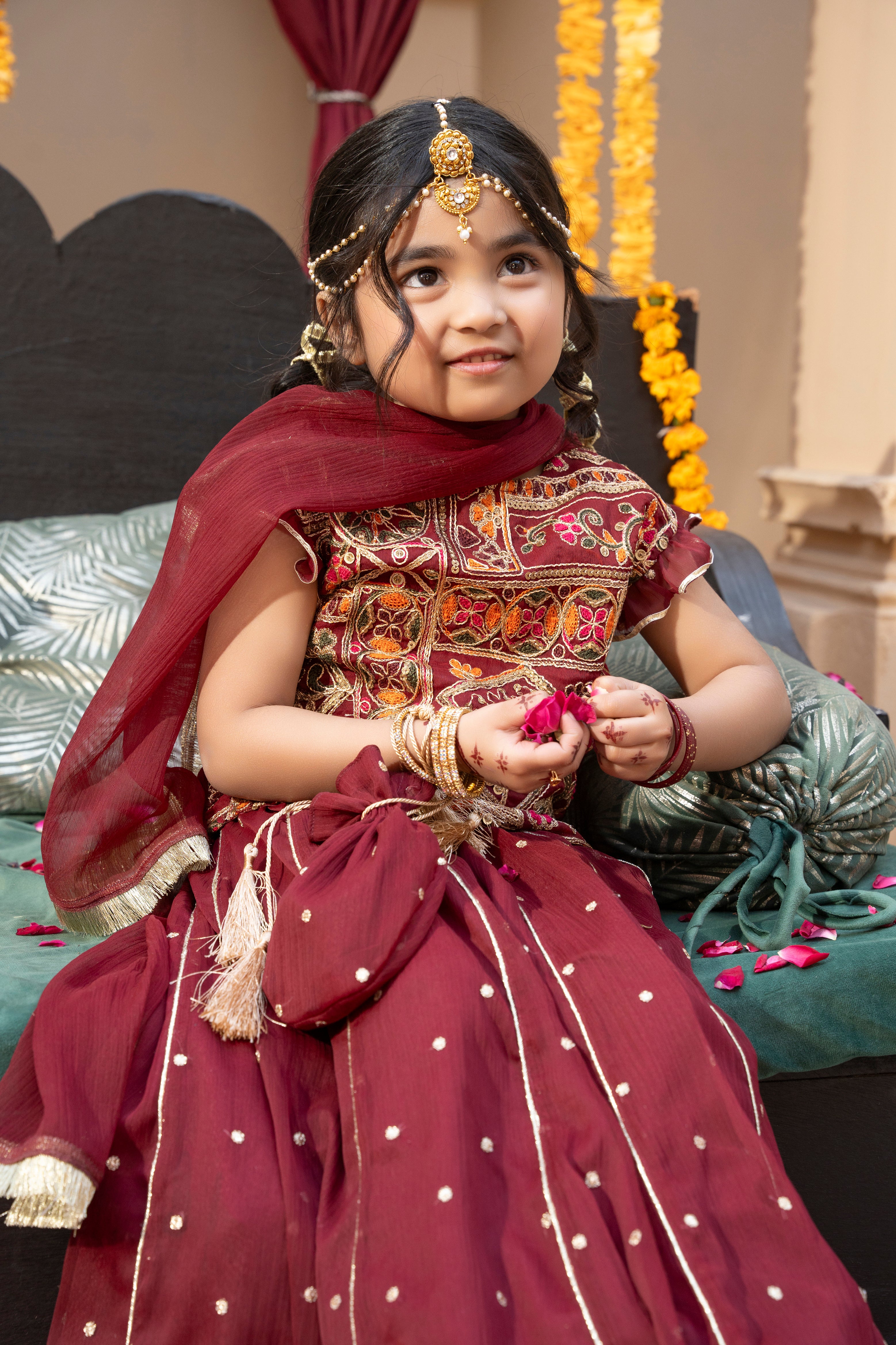 Let your little one shine in this exquisite maroon lehnga choli, designed to make her the star of any occasion. Perfect for weddings, cultural events, or any special celebration, this outfit combines tradition with charm, offering a perfect balance of elegance and comfort.