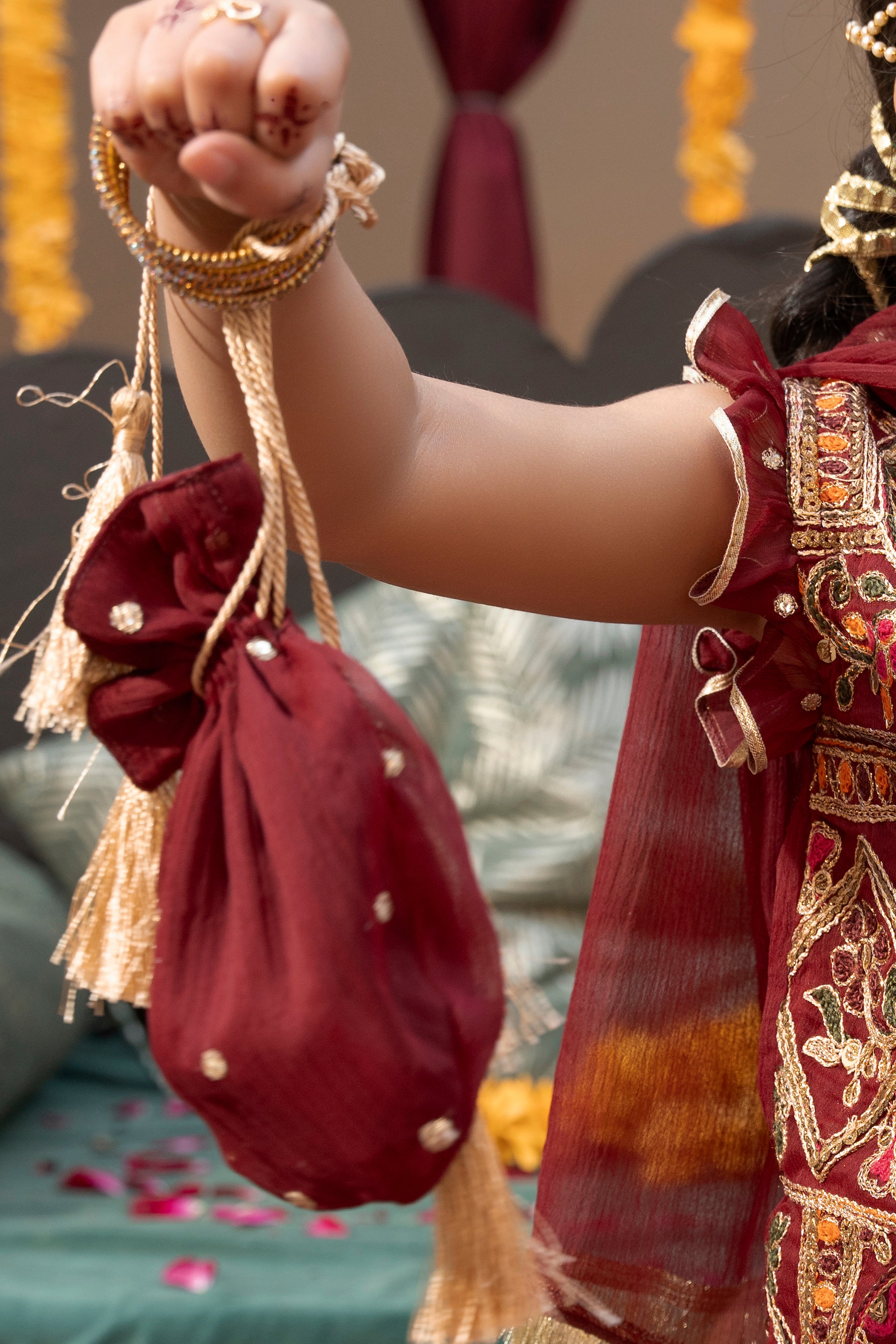To complete this stunning ensemble, we’ve included a chiffon dupatta adorned with kiran (traditional tassels), bringing a regal touch to the outfit. The matching potli bag adds a stylish and functional accessory, allowing your toddler to carry her little treasures while adding an extra flair to the overall look.