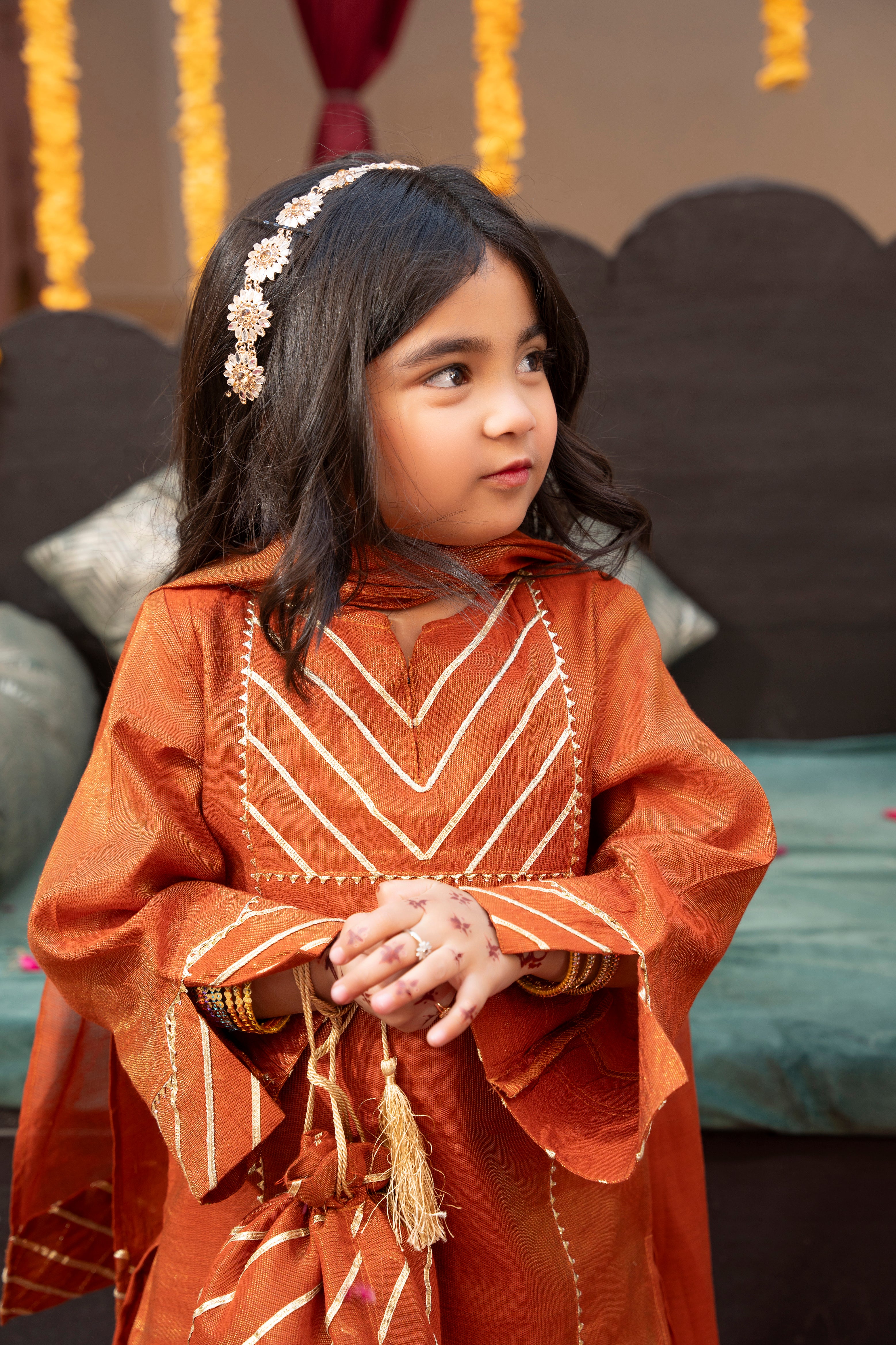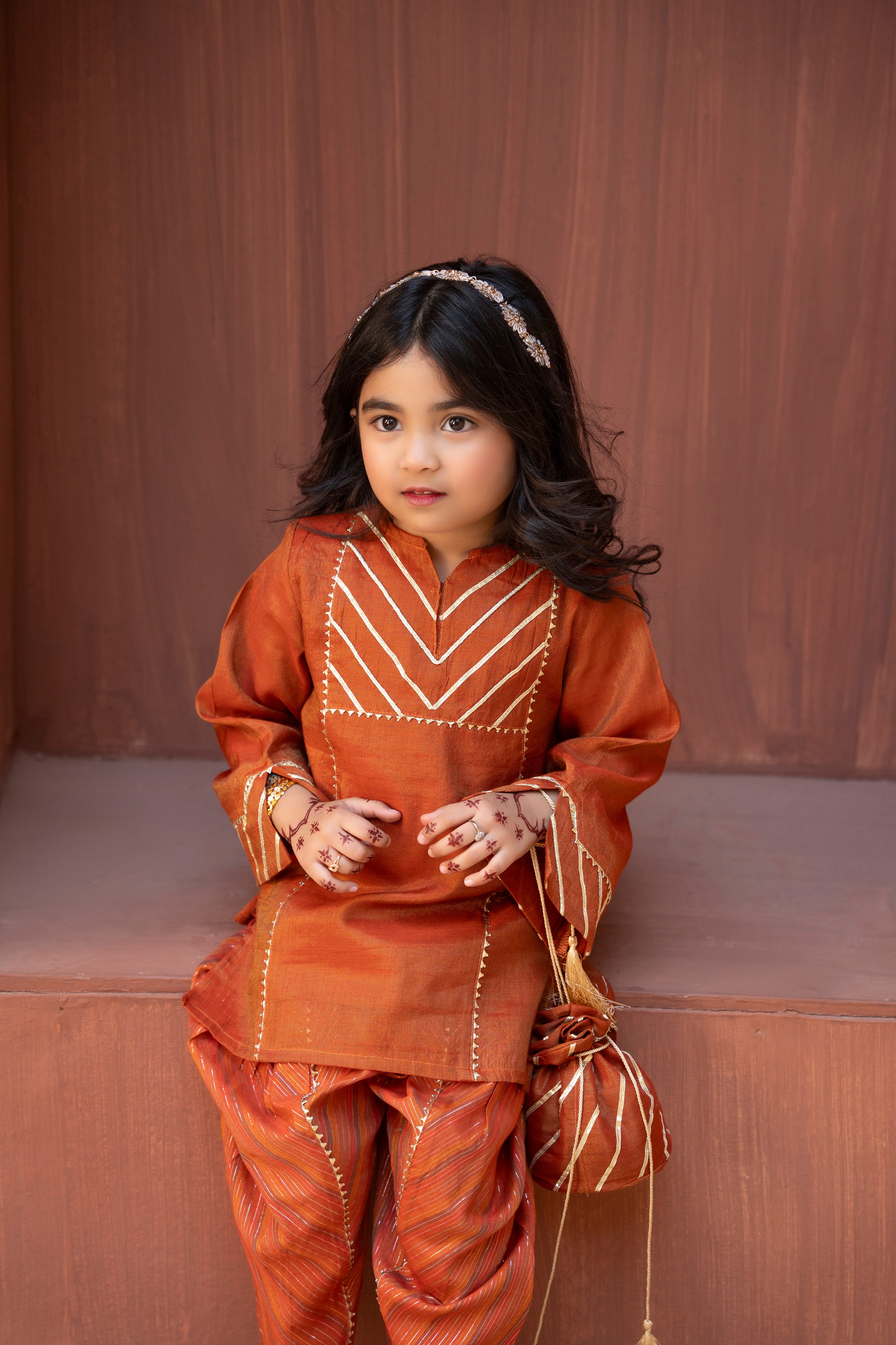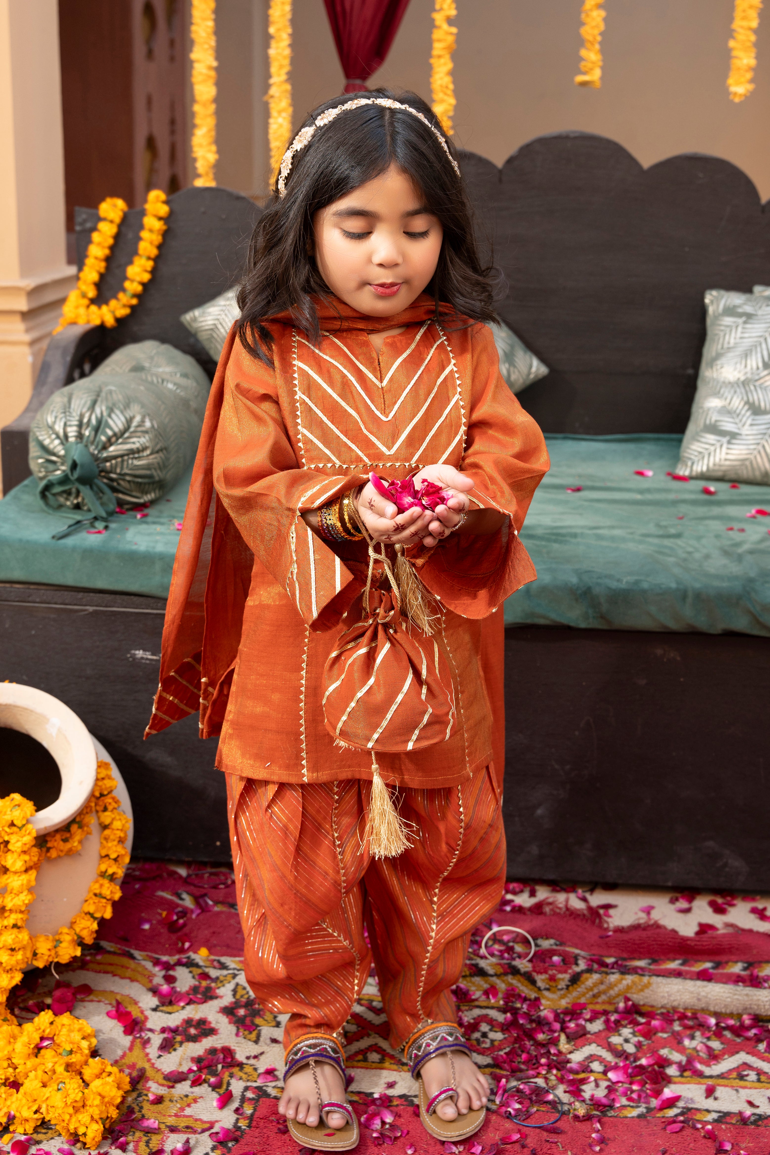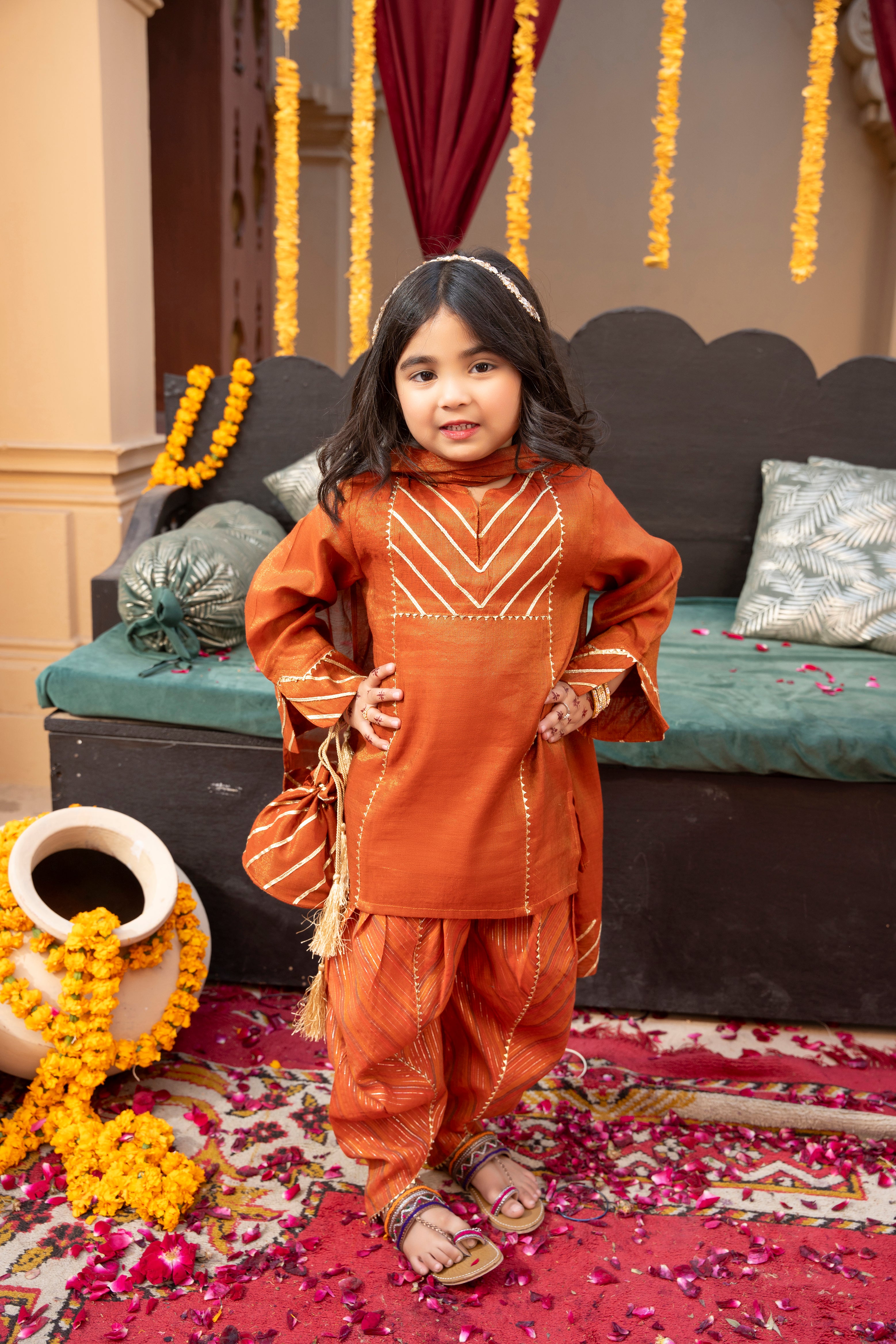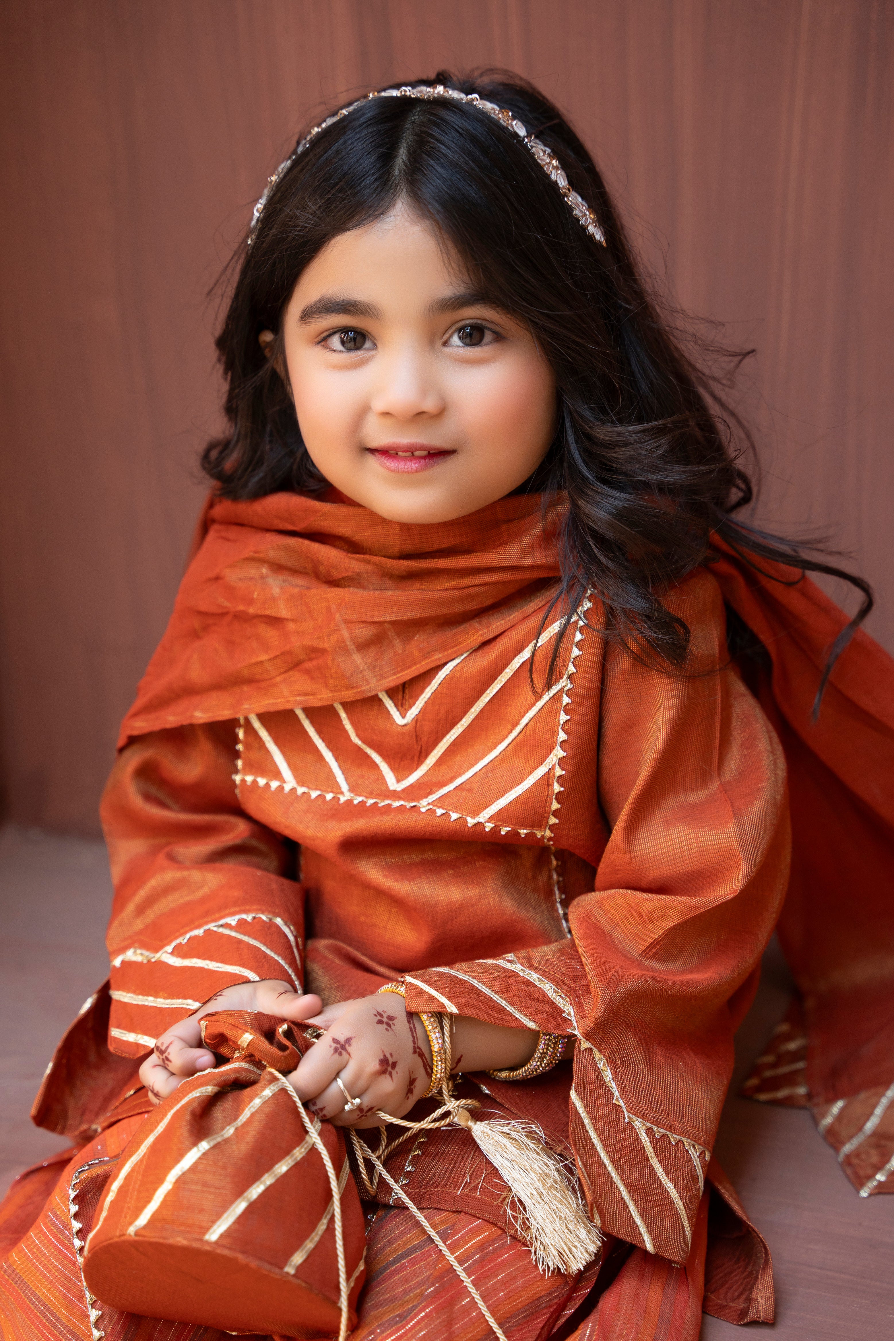 Bring a touch of ethnic elegance to your little one's wardrobe with this stunning rust-colored 4-piece outfit, perfect for festive occasions, cultural events, or family gatherings. Crafted from a blend of luxurious mesuri fabric and breathable cotton, this set combines tradition with style.
