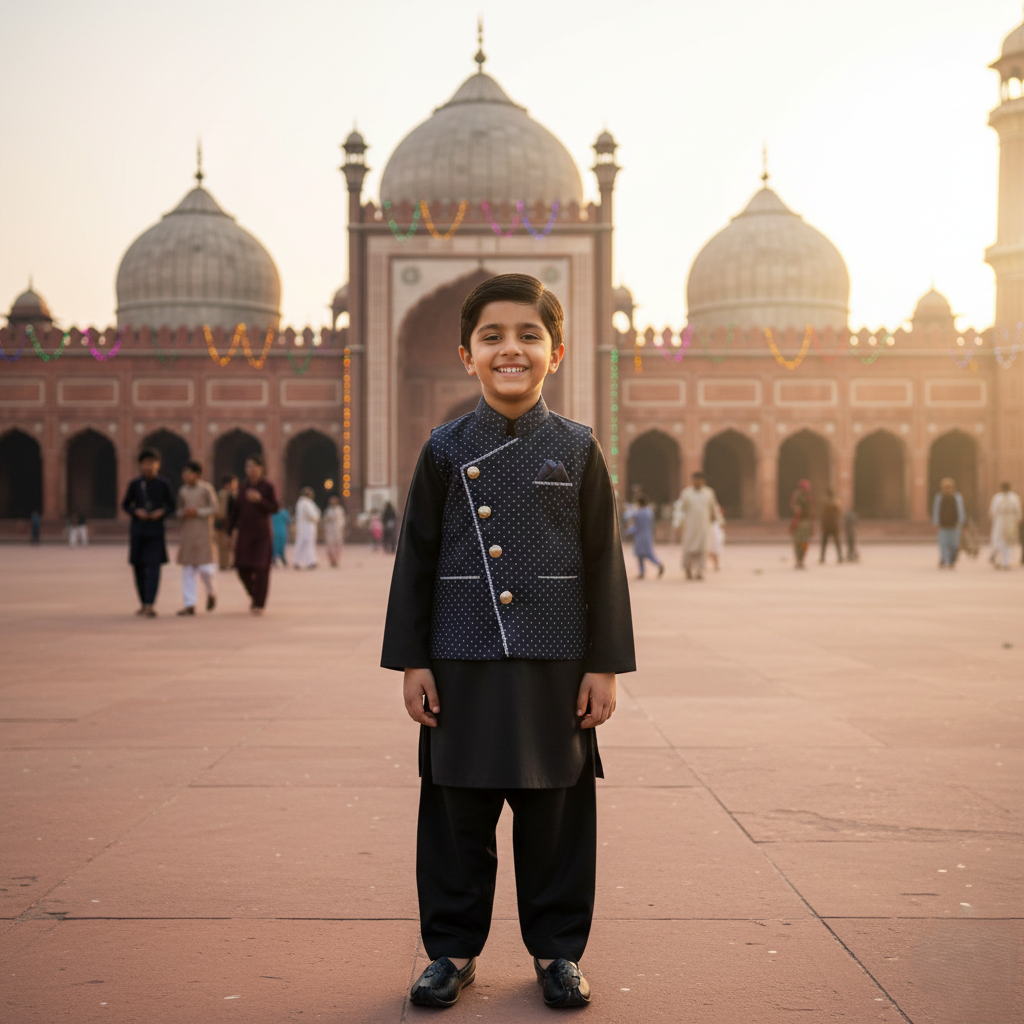 Elevate your ethnic style with our Black 3 Piece Set (includes Kameez, Shalwar and navy waistcoat). The traditional kurta shalwar is enhanced with metal buttons and a printed waistcoat featuring contrasting color embroidery, adding a touch of trendiness to your look. Perfect for any casual or formal occasion.