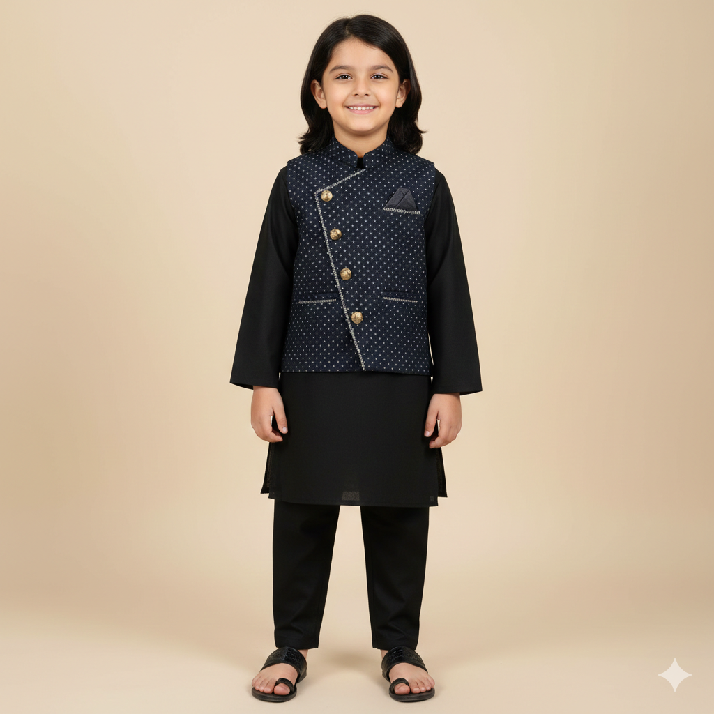 Elevate your ethnic style with our Black 3 Piece Set (includes Kameez, Shalwar and navy waistcoat). The traditional kurta shalwar is enhanced with metal buttons and a printed waistcoat featuring contrasting color embroidery, adding a touch of trendiness to your look. Perfect for any casual or formal occasion.