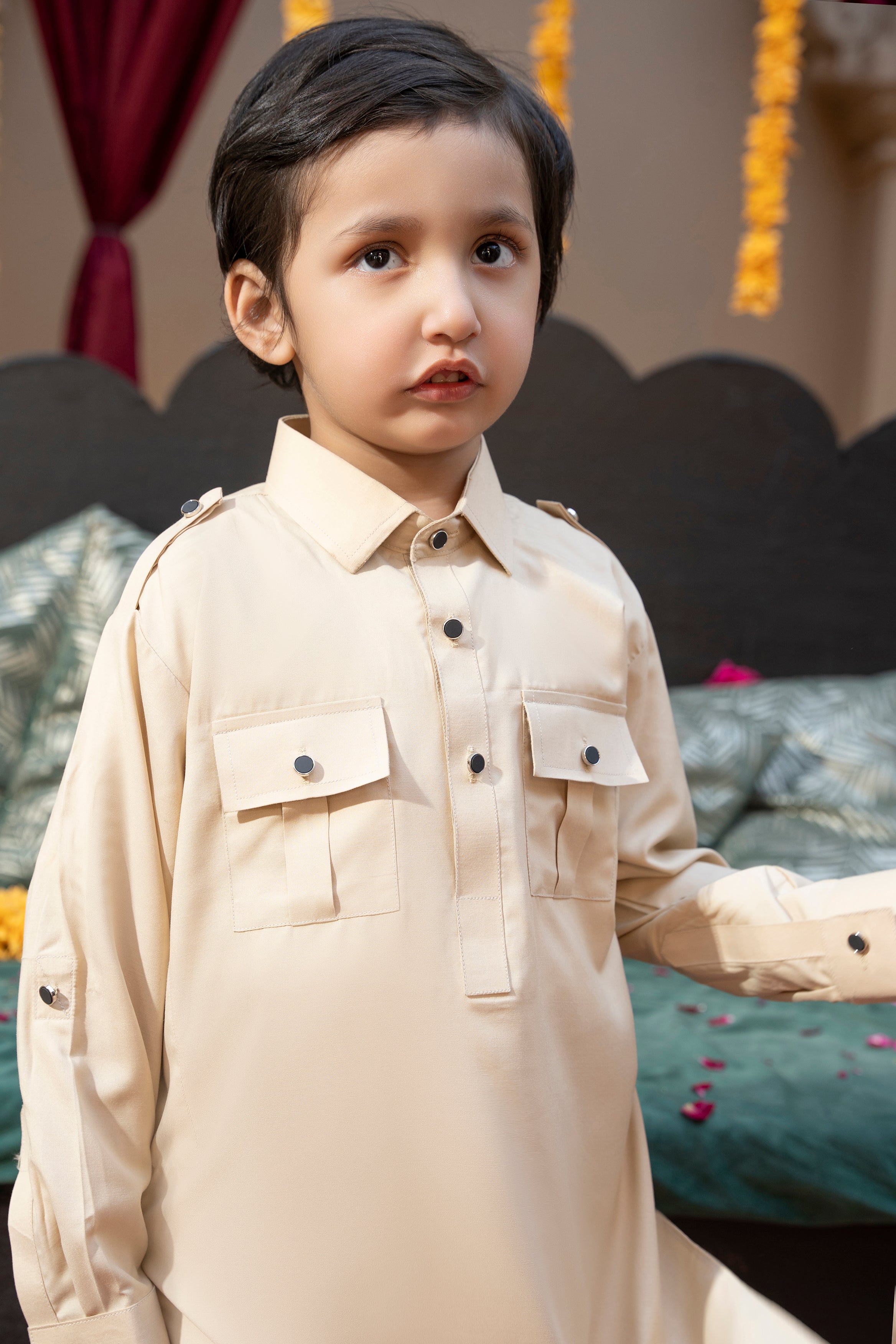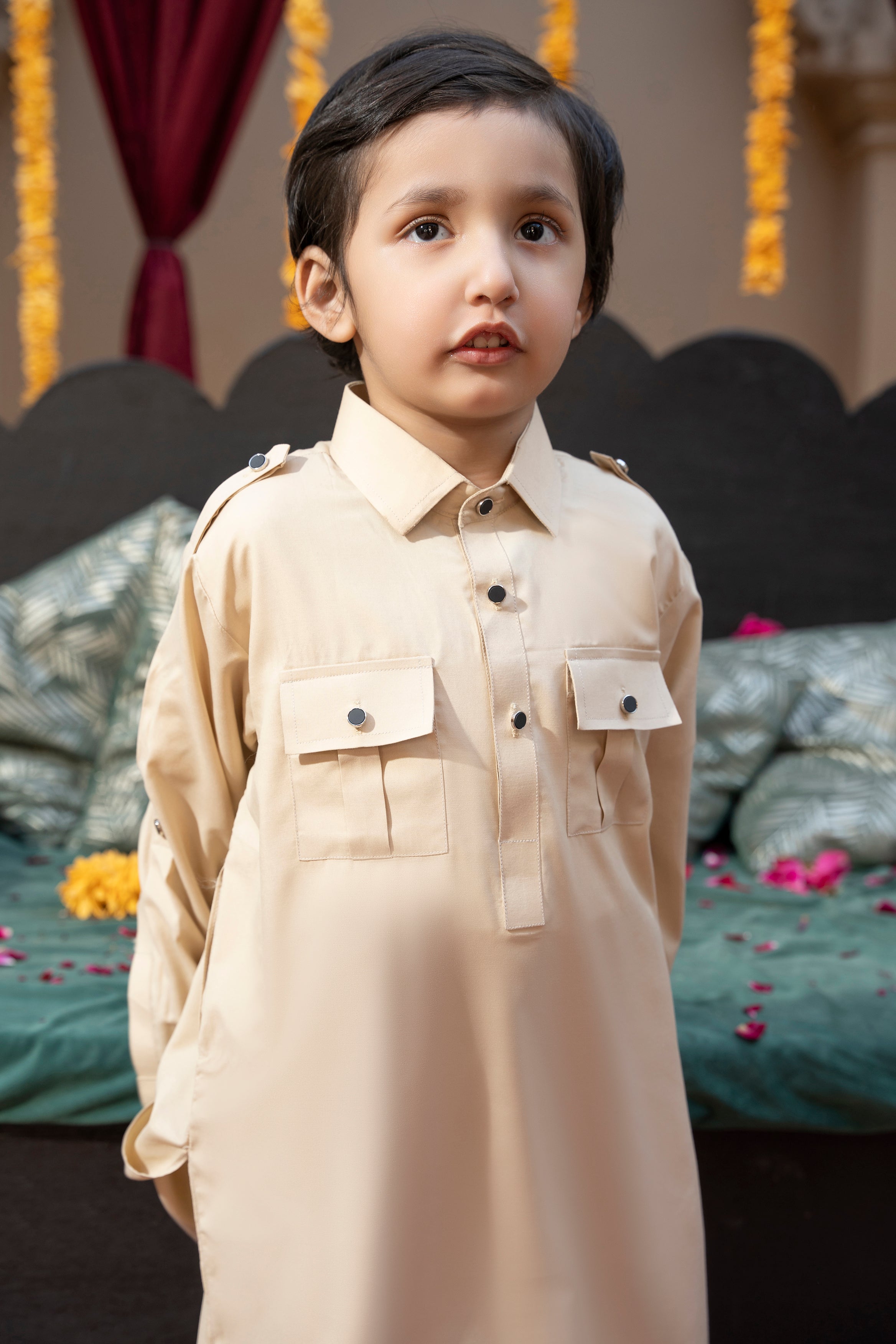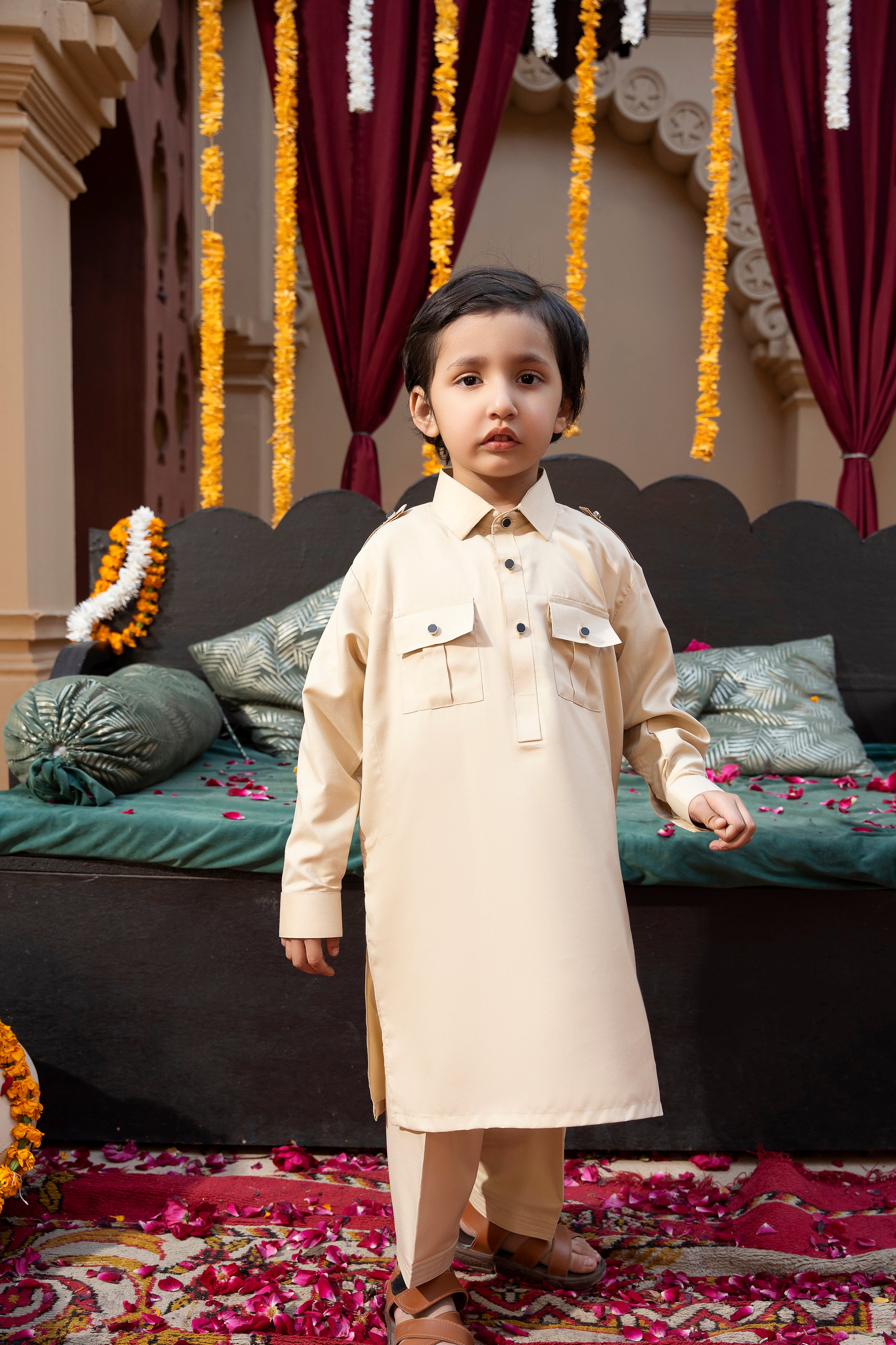 The kurta features a smart collared neckline, stylish buttoned placket, and dual chest flap pockets with metallic button detailing for a touch of sophistication. Subtle shoulder tabs add a charming, modern twist to this traditional outfit. Paired with a classic shalwar, this set is lightweight, easy to wear, and ideal for weddings, Eid, and other special occasions.