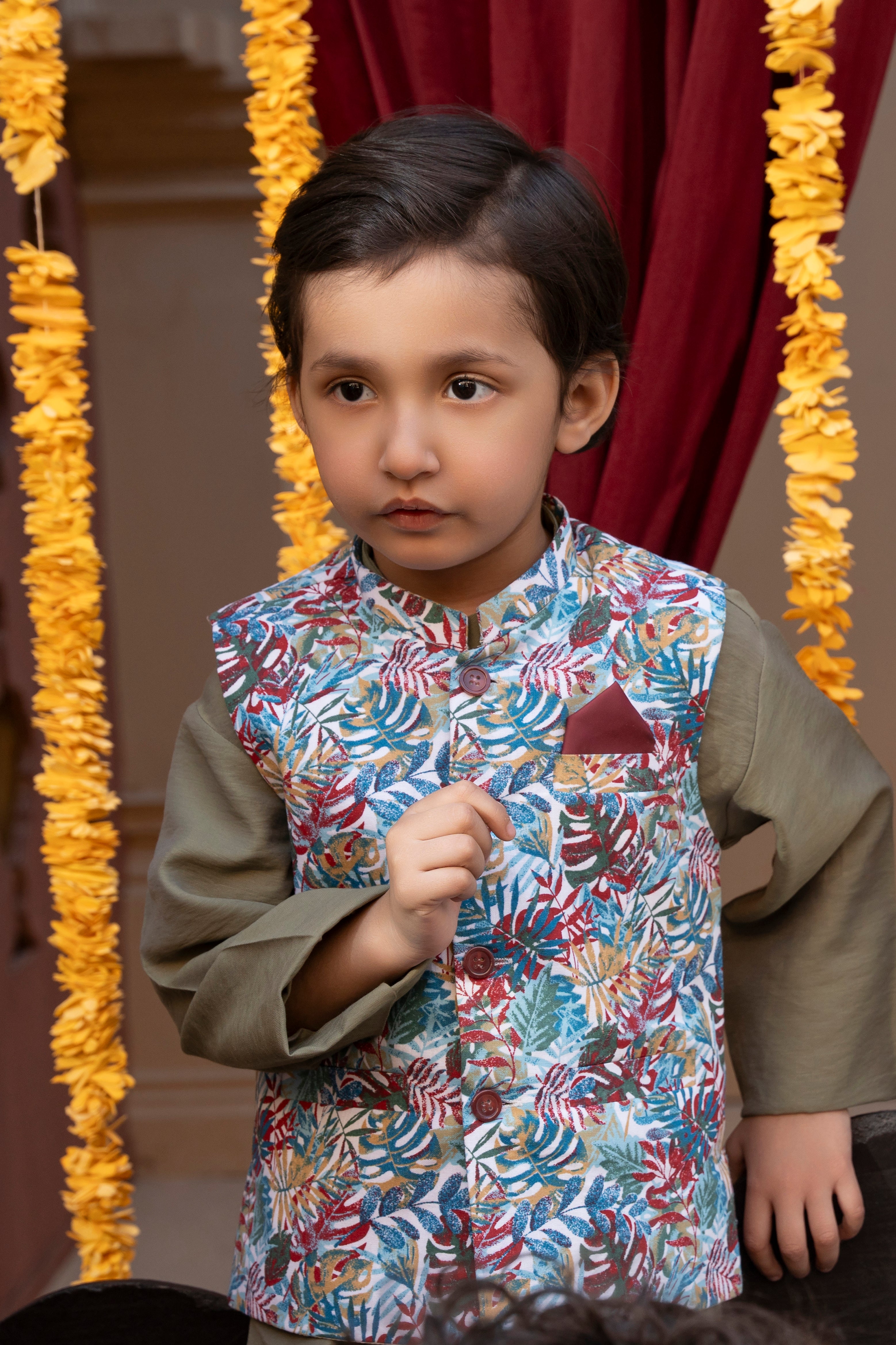 Add a pop of color to your toddler boy’s wardrobe with this vibrant tropical print waistcoat. Featuring a lively design, this waistcoat is perfect for adding a playful yet stylish touch to any outfit.