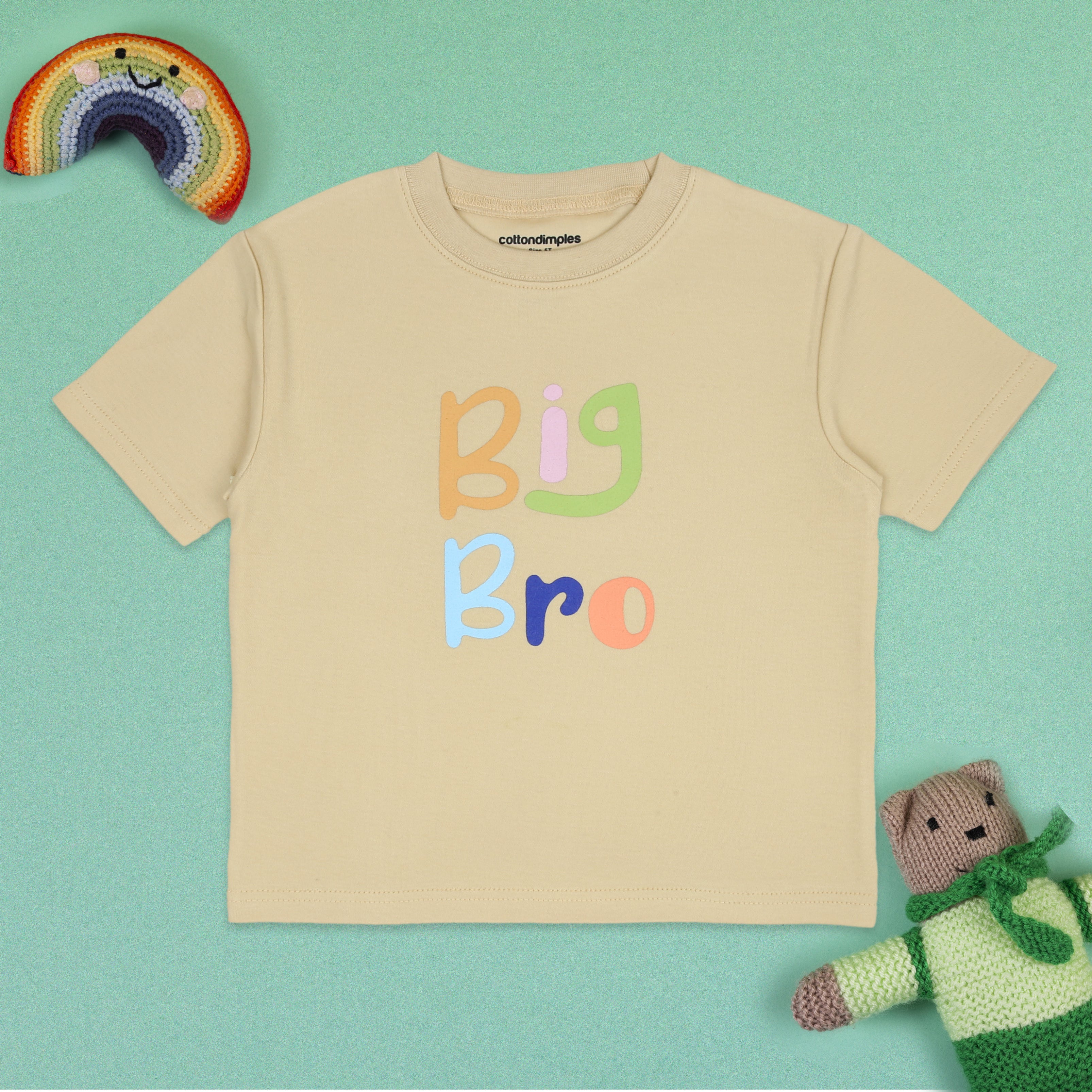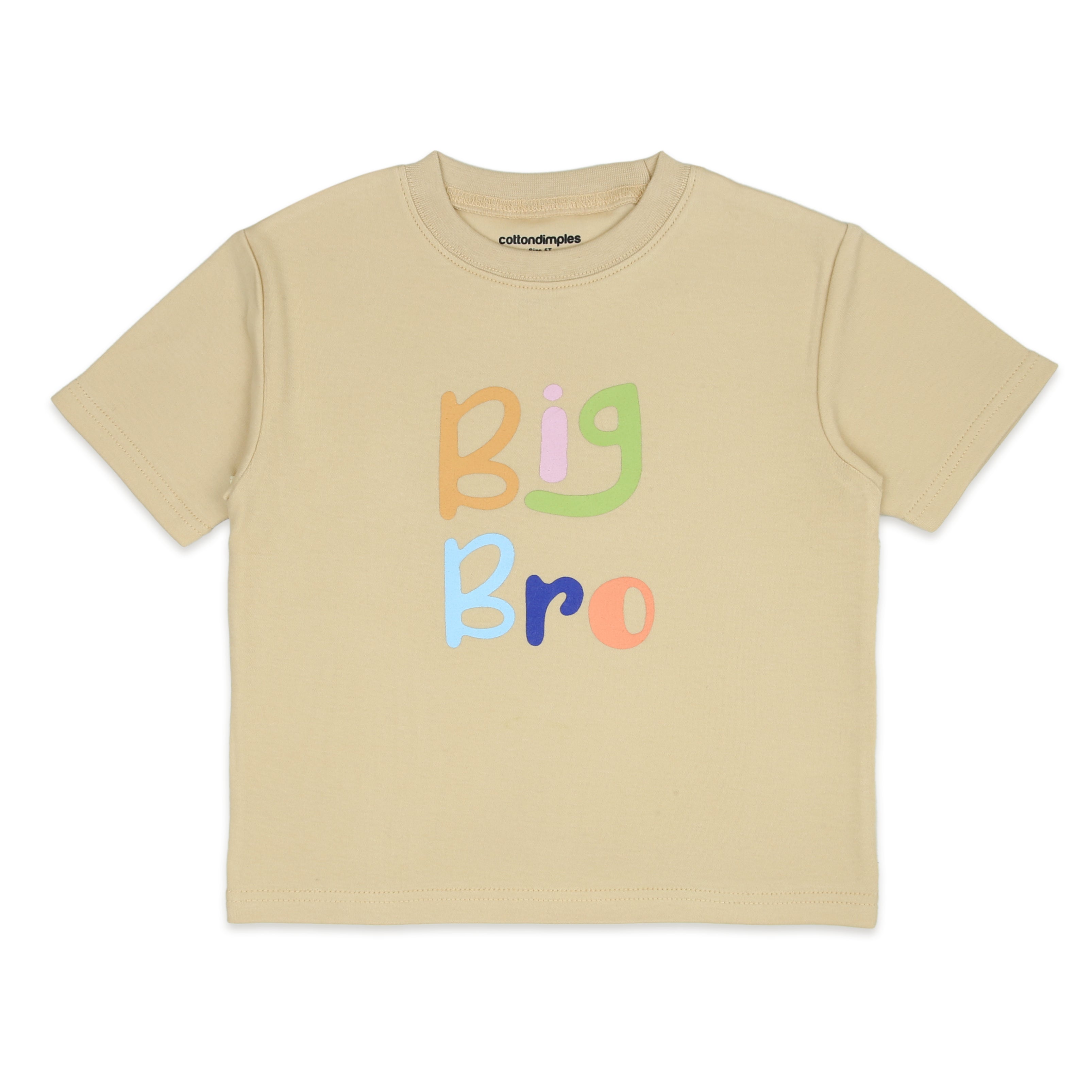 Celebrate your little one's big brother status with this adorable cotton tee! Made from soft, breathable fabric, this beige shirt ensures comfort all day long. The standout feature is the cute "Big Bro" print in soft pastel colors, adding a playful and charming touch to the design.